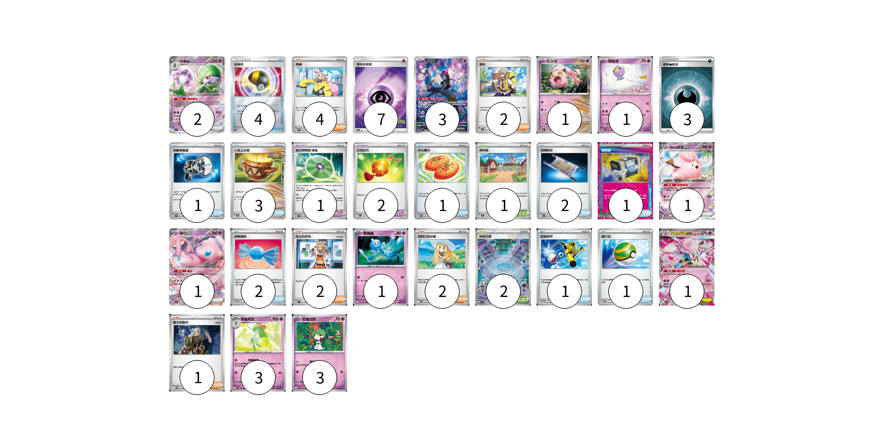 牌組構築方案 以此牌組為基礎新構築牌組 顯示卡面 顯示列表 寶可夢卡(17) 2 3 1 1 1 1 1 1 3 3 寶可夢道具(3) 1 2 物品卡(16) 4 1 3 1 2 1 2 1 1 支援者卡(11) 4 2 2 2 1 競技場卡(3) 1 2 能量卡(10) 7 3 寶可夢卡(17) 卡牌名稱 張數 卡牌名稱 張數 沙奈朵ex SV1S 028/078 02 願增猿 SV6 107/101 03 吼叫尾 SV4K 032/066 01 飄飄球 SV4a 083/190 01 莉莉艾的皮皮ex SV9 033/100 01 夢幻ex SV2a 151/165 01 輕飄飄 SV11W 041/086 01 超級蒂安希ex MBD 006/022 01 奇魯莉安 M1S 041/063 03 拉魯拉絲 M1S 040/063 03 寶可夢道具(3) 卡牌名稱 張數 卡牌名稱 張數 招式學習器 演進 SV4M 063/066 01 勇氣護符 SV4a 169/190 02 物品卡(16) 卡牌名稱 張數 卡牌名稱 張數 高級球 SPD 010/020 04 反擊捕捉器 SV4M 059/066 01 大地之容器 SVHK 011/022 03 好友寶芬 SV5K 063/071 01 夜間擔架 SV6a 056/064 02 秘密箱 SV6 092/101 01 神奇糖果 SVOD 013/020 02 厲害釣竿 SVOD 010/020 01 巢穴球 SVTG 012/019 01 支援者卡(11) 卡牌名稱 張數 卡牌名稱 張數 奇樹 SV2D 069/071 04 派帕 SV4a 180/190 02 博士的研究 SVK 032/042 02 莉莉艾的決意 MBD 021/022 02 老大的指令 MBD 020/022 01 競技場卡(3) 卡牌名稱 張數 卡牌名稱 張數 深缽鎮 SV4a 185/190 01 神秘花園 M1S 086/063 02 能量卡(10) 卡牌名稱 張數 卡牌名稱 張數 基本超能量 S10b PSY 07 基本惡能量 SLD DAR 03 以此牌組為基礎新構築牌組 牌組編碼 hvhZbH-EbkexL-XNmcjp copy 列印牌組單 牌組編碼已複製 分享至SNS