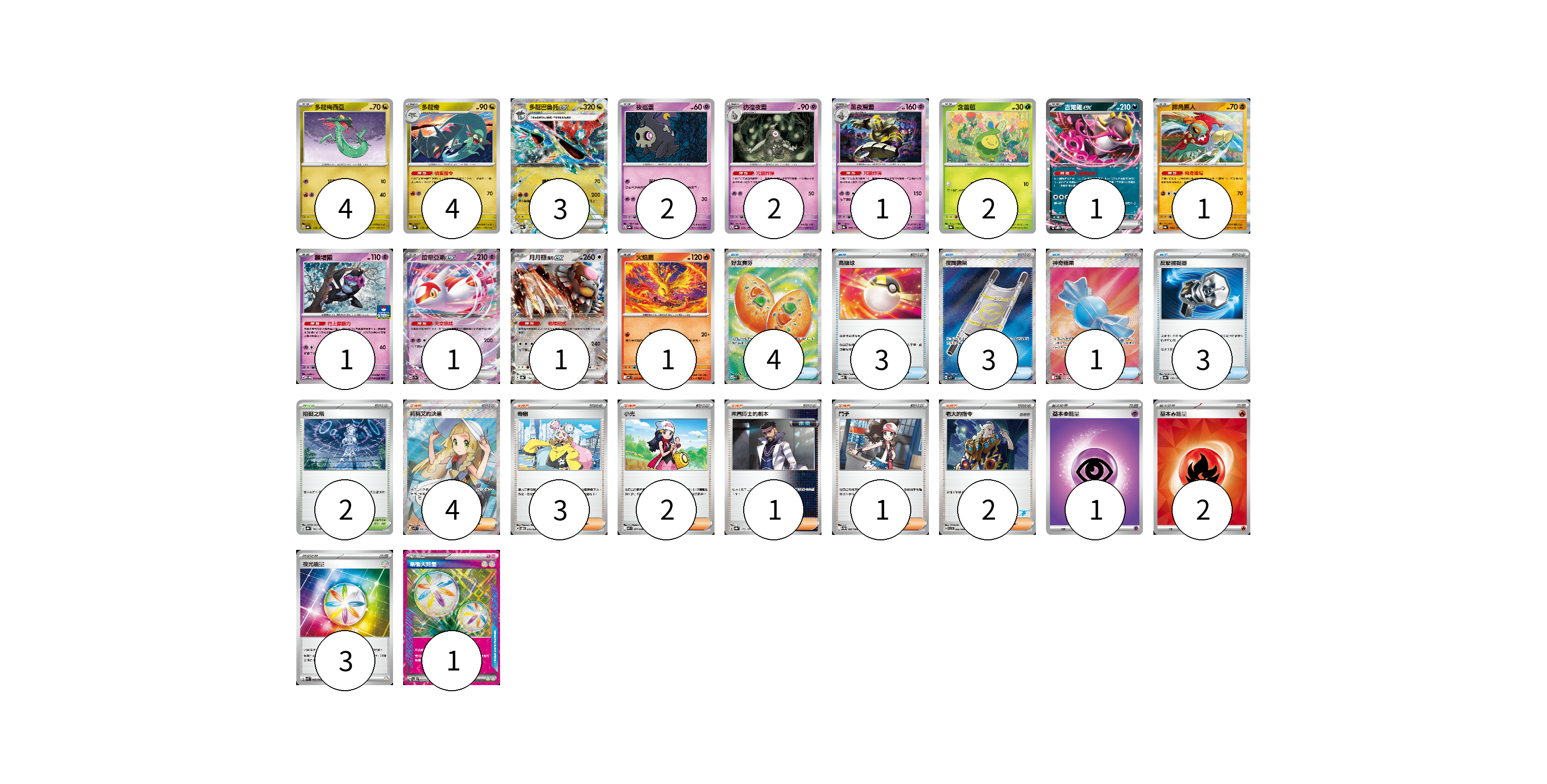 牌組構築方案 以此牌組為基礎新構築牌組 顯示卡面 顯示列表 寶可夢卡(24) 4 4 3 2 2 1 2 1 1 1 1 1 1 物品卡(14) 4 3 3 1 3 支援者卡(13) 4 3 2 1 1 2 競技場卡(2) 2 能量卡(7) 1 2 3 1 寶可夢卡(24) 卡牌名稱 張數 卡牌名稱 張數 多龍梅西亞 SV8a 118/187 04 多龍奇 SV8a 119/187 04 多龍巴魯托ex SV8a 120/187 03 夜巡靈 SV8a 064/187 02 彷徨夜靈 SV8a 065/187 02 黑夜魔靈 SV8a 066/187 01 含羞苞 SV8a 001/187 02 吉雉雞ex SVOD 004/020 01 摔角鷹人 SV8a 084/187 01 願增猿 M-P 014/M-P 01 拉帝亞斯ex SV7a 019/064 01 月月熊 赫月ex SV8a 134/187 01 火焰鳥 M2 014/080 01 物品卡(14) 卡牌名稱 張數 卡牌名稱 張數 好友寶芬 M1S 081/063 04 高級球 MBD 014/022 03 夜間擔架 M1L 083/063 03 神奇糖果 M1S 082/063 01 反擊捕捉器 SV8a 139/187 03 支援者卡(13) 卡牌名稱 張數 卡牌名稱 張數 莉莉艾的決意 M1L 086/063 04 奇樹 SVOD 016/020 03 小光 M2 077/080 02 弗圖博士的劇本 SV8a 175/187 01 鬥子 SV11W 085/086 01 老大的指令 SVI 066/066 02 競技場卡(2) 卡牌名稱 張數 卡牌名稱 張數 阻礙之塔 SV8a 181/187 02 能量卡(7) 卡牌名稱 張數 卡牌名稱 張數 基本【超】能量 M-P PSY 01 基本【火】能量 SVQL FIR 02 夜光能量 SVK 042/042 03 新衝天能量 SV5K 071/071 01 以此牌組為基礎新構築牌組 牌組編碼 hvuZgt-ZxWUvO-vmaHxq copy 列印牌組單 牌組編碼已複製 分享至SNS