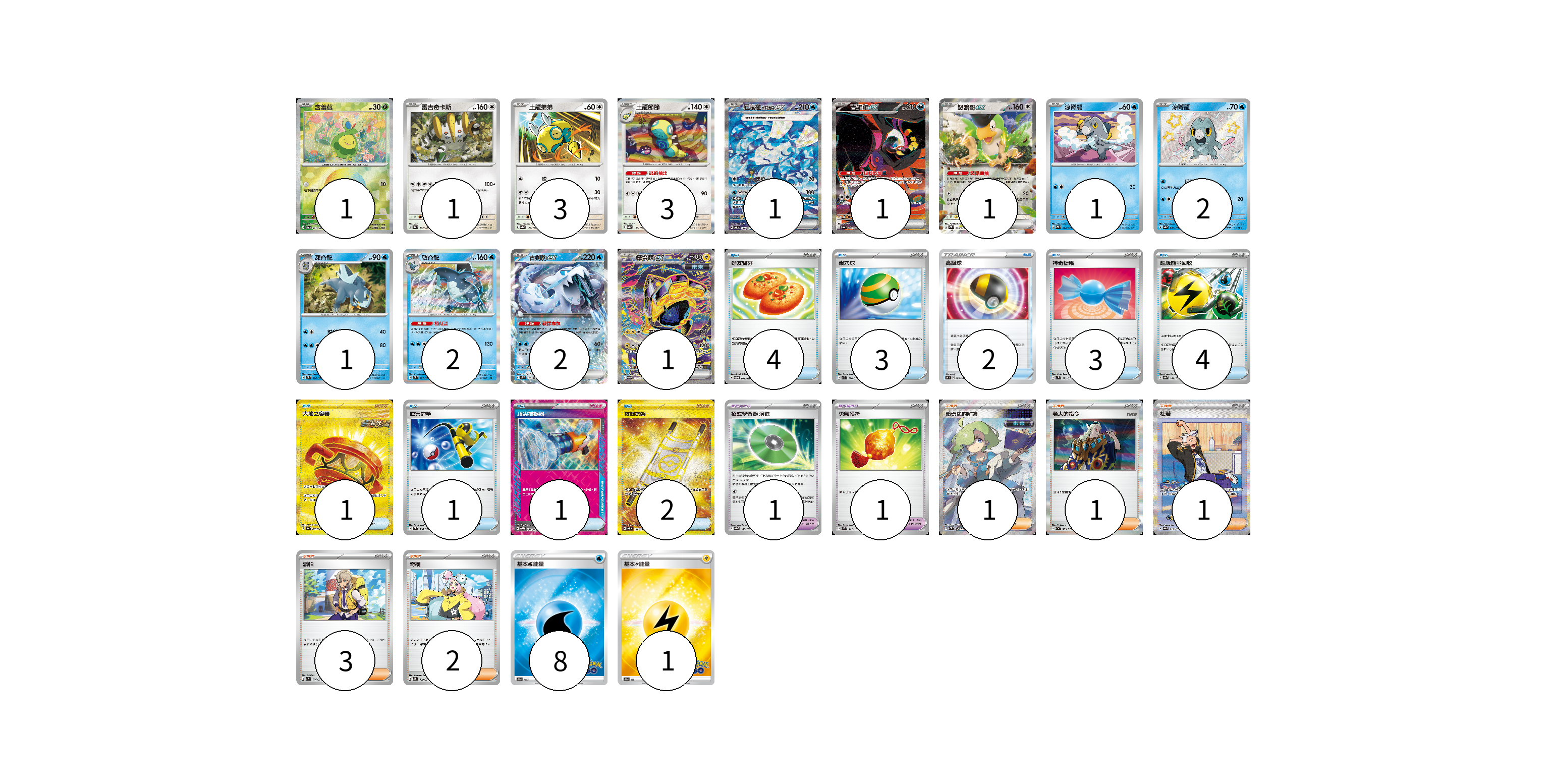 牌組構築方案 以此牌組為基礎新構築牌組 顯示卡面 顯示列表 寶可夢卡(20) 1 1 3 3 1 1 1 1 2 1 2 2 1 寶可夢道具(2) 1 1 物品卡(21) 4 3 2 3 4 1 1 1 2 支援者卡(8) 1 1 1 3 2 能量卡(9) 8 1 寶可夢卡(20) 卡牌名稱 張數 卡牌名稱 張數 含羞苞 SV8a 001/187 01 雷吉奇卡斯 SV8a 132/187 01 土龍弟弟 SV8a 129/187 03 土龍節節 SV8a 130/187 03 厄鬼椪 水井面具ex SV6 127/101 01 吉雉雞ex SV6a 089/064 01 怒鸚哥ex SV2P 065/071 01 涼脊龍 SV2P 024/071 01 涼脊龍 SV4a 233/190 02 凍脊龍 SV2P 026/071 01 戟脊龍 SV2P 027/071 02 古劍豹ex SV2P 028/071 02 鐵臂膀ex SV8a 210/187 01 寶可夢道具(2) 卡牌名稱 張數 卡牌名稱 張數 招式學習器 演進 SV8a 160/187 01 勇氣護符 SVM 142/175 01 物品卡(21) 卡牌名稱 張數 卡牌名稱 張數 好友寶芬 SVOD 011/020 04 巢穴球 SV1S 070/078 03 高級球 S9 089/100 02 神奇糖果 SV1V 072/078 03 超級能量回收 SV8a 141/187 04 大地之容器 SV6a 093/064 01 厲害釣竿 SV2P 066/071 01 頂尖捕捉器 SV5M 062/071 01 夜間擔架 SV8 137/106 02 支援者卡(8) 卡牌名稱 張數 卡牌名稱 張數 暗碼迷的解讀 SV5M 090/071 01 老大的指令 SV1a 069/073 01 杜若 SV8a 229/187 01 派帕 SV1V 076/078 03 奇樹 SV2D 069/071 02 能量卡(9) 卡牌名稱 張數 卡牌名稱 張數 基本水能量 S10b WAT 08 基本雷能量 S10b LIG 01 以此牌組為基礎新構築牌組 牌組編碼 hvyqne-BCbcbm-KlekYJ copy 列印牌組單 牌組編碼已複製 分享至SNS