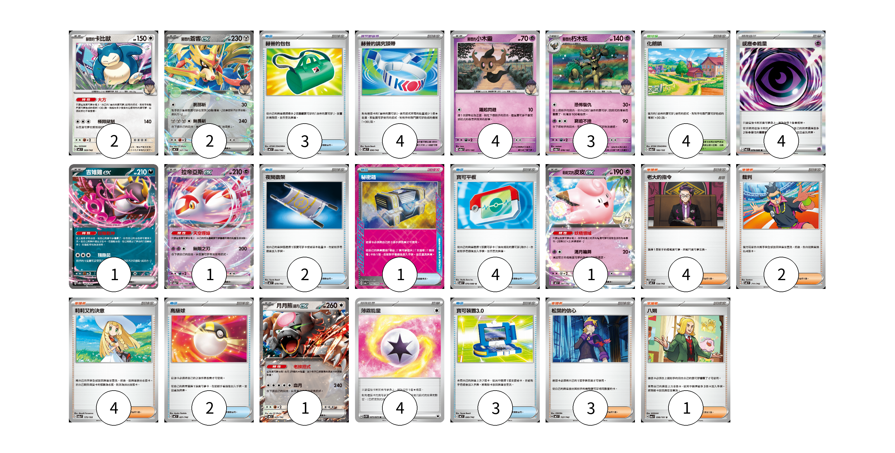 牌組構築方案 以此牌組為基礎新構築牌組 顯示卡面 顯示列表 寶可夢卡(15) 2 2 4 3 1 1 1 1 寶可夢道具(4) 4 物品卡(15) 3 2 1 4 2 3 支援者卡(14) 4 2 4 3 1 競技場卡(4) 4 能量卡(8) 4 4 寶可夢卡(15) 卡牌名稱 張數 卡牌名稱 張數 赫普的卡比獸 MC 569/742 02 <赫普的>蒼響ex MC 527/742 02 赫普的小木靈 M2a 077/193 04 赫普的朽木妖 M2a 078/193 03 吉雉雞ex SVOD 004/020 01 拉帝亞斯ex M2a 075/193 01 <莉莉艾的>皮皮ex MC 287/742 01 月月熊 赫月 ex MC 625/742 01 寶可夢道具(4) 卡牌名稱 張數 卡牌名稱 張數 赫普的講究頭帶 MC 690/742 04 物品卡(15) 卡牌名稱 張數 卡牌名稱 張數 赫普的包包 MC 666/742 03 夜間擔架 MC 670/742 02 秘密箱 SV6 092/101 01 寶可平板 M3 070/080 04 高級球 MC 651/742 02 寶可裝置3.0 MC 660/742 03 支援者卡(14) 卡牌名稱 張數 卡牌名稱 張數 老大的指令 MC 724/742 04 裁判 MC 711/742 02 莉莉艾的決意 M2a 175/193 04 松葉的信心 MC 727/742 03 八朔 SV6 098/101 01 競技場卡(4) 卡牌名稱 張數 卡牌名稱 張數 化朗鎮 M2a 186/193 04 能量卡(8) 卡牌名稱 張數 卡牌名稱 張數 感應【超】能量 M3 079/080 04 薄霧能量 SV5M 071/071 04 以此牌組為基礎新構築牌組 牌組編碼 iBRrNX-PkbrHI-xqCeGO copy 列印牌組單 牌組編碼已複製 分享至SNS