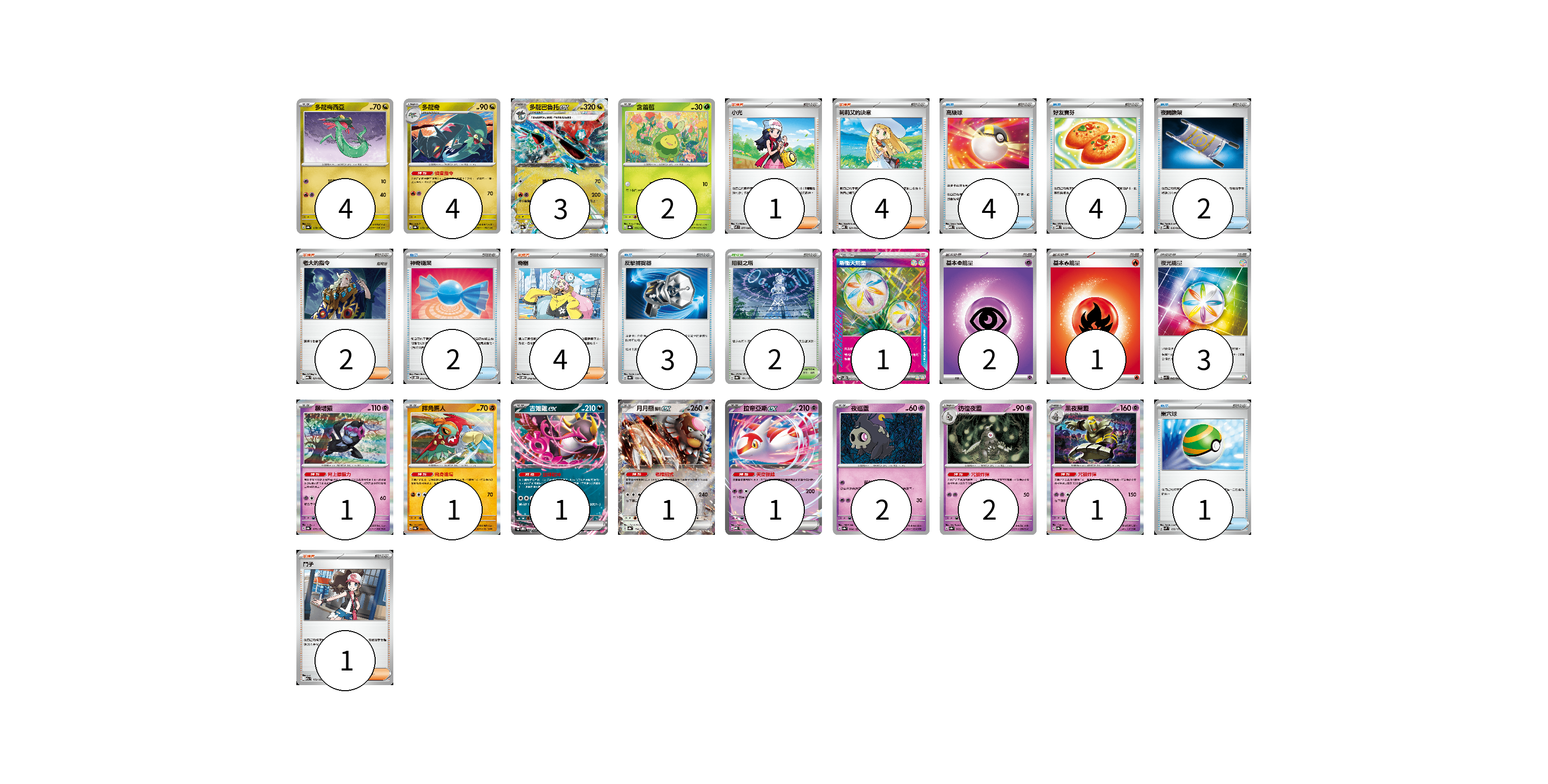 牌組構築方案 以此牌組為基礎新構築牌組 顯示卡面 顯示列表 寶可夢卡(23) 4 4 3 2 1 1 1 1 1 2 2 1 物品卡(16) 4 4 2 2 3 1 支援者卡(12) 1 4 2 4 1 競技場卡(2) 2 能量卡(7) 1 2 1 3 寶可夢卡(23) 卡牌名稱 張數 卡牌名稱 張數 多龍梅西亞 SV8a 118/187 04 多龍奇 SV8a 119/187 04 多龍巴魯托ex SV8a 120/187 03 含羞苞 SV8a 001/187 02 願增猿 SV8a 075/187 01 摔角鷹人 SV8a 084/187 01 吉雉雞ex SVOD 004/020 01 月月熊 赫月ex SV8a 134/187 01 拉帝亞斯ex MBD 003/022 01 夜巡靈 SV8a 064/187 02 彷徨夜靈 SV8a 065/187 02 黑夜魔靈 SV8a 066/187 01 物品卡(16) 卡牌名稱 張數 卡牌名稱 張數 高級球 MBD 014/022 04 好友寶芬 MBD 013/022 04 夜間擔架 MBD 016/022 02 神奇糖果 SVOD 013/020 02 反擊捕捉器 SV8a 139/187 03 巢穴球 SVM 133/175 01 支援者卡(12) 卡牌名稱 張數 卡牌名稱 張數 小光 M2 077/080 01 莉莉艾的決意 MBD 021/022 04 老大的指令 MBG 021/022 02 奇樹 SVOM 018/021 04 鬥子 M2a 172/193 01 競技場卡(2) 卡牌名稱 張數 卡牌名稱 張數 阻礙之塔 SV8a 181/187 02 能量卡(7) 卡牌名稱 張數 卡牌名稱 張數 新衝天能量 SV5K 071/071 01 基本【超】能量 MBD PSY 02 基本【火】能量 M-P FIR 01 夜光能量 SVK 042/042 03 以此牌組為基礎新構築牌組 牌組編碼 iBzNVC-zOuwbZ-pXgnAi copy 列印牌組單 牌組編碼已複製 分享至SNS