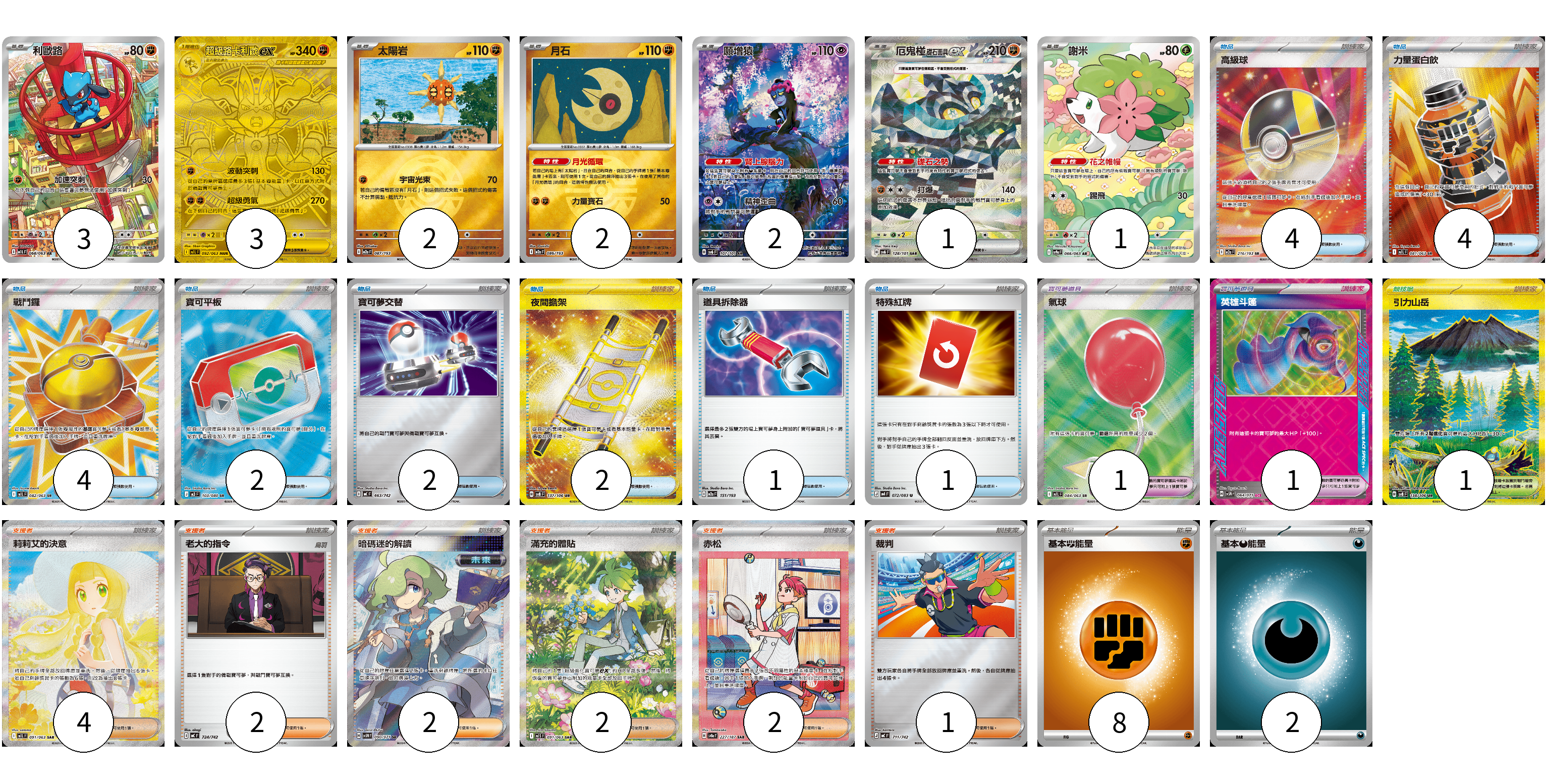 牌組構築方案 以此牌組為基礎新構築牌組 顯示卡面 顯示列表 寶可夢卡(14) 3 3 2 2 2 1 1 寶可夢道具(2) 1 1 物品卡(20) 4 4 4 2 2 2 1 1 支援者卡(13) 4 2 2 2 2 1 競技場卡(1) 1 能量卡(10) 8 2 寶可夢卡(14) 卡牌名稱 張數 卡牌名稱 張數 利歐路 M1L 068/063 03 超級路卡利歐ex M1L 092/063 03 太陽岩 M2a 087/193 02 月石 M2a 086/193 02 願增猿 SV6 107/101 02 厄鬼椪 礎石面具ex SV6 128/101 01 謝米 SV9a 066/063 01 寶可夢道具(2) 卡牌名稱 張數 卡牌名稱 張數 氣球 M1L 084/063 01 英雄斗篷 SV5M 064/071 01 物品卡(20) 卡牌名稱 張數 卡牌名稱 張數 高級球 M2a 216/193 04 力量蛋白飲 M1L 081/063 04 戰鬥鑼 M1L 082/063 04 寶可平板 M3 103/080 02 寶可夢交替 MC 663/742 02 夜間擔架 SV8 137/106 02 道具拆除器 M2a 151/193 01 特殊紅牌 M4 072/083 01 支援者卡(13) 卡牌名稱 張數 卡牌名稱 張數 莉莉艾的決意 M1L 091/063 04 老大的指令 MC 724/742 02 暗碼迷的解讀 SV5M 090/071 02 滿充的體貼 M1S 091/063 02 赤松 SV8a 227/187 02 裁判 MC 711/742 01 競技場卡(1) 卡牌名稱 張數 卡牌名稱 張數 引力山岳 SV8 138/106 01 能量卡(10) 卡牌名稱 張數 卡牌名稱 張數 基本【鬥】能量 MC FIG 08 基本【惡】能量 MC DAR 02 以此牌組為基礎新構築牌組 牌組編碼 iDAKEu-rVuFQn-bWgQoQ copy 列印牌組單 牌組編碼已複製 分享至SNS
