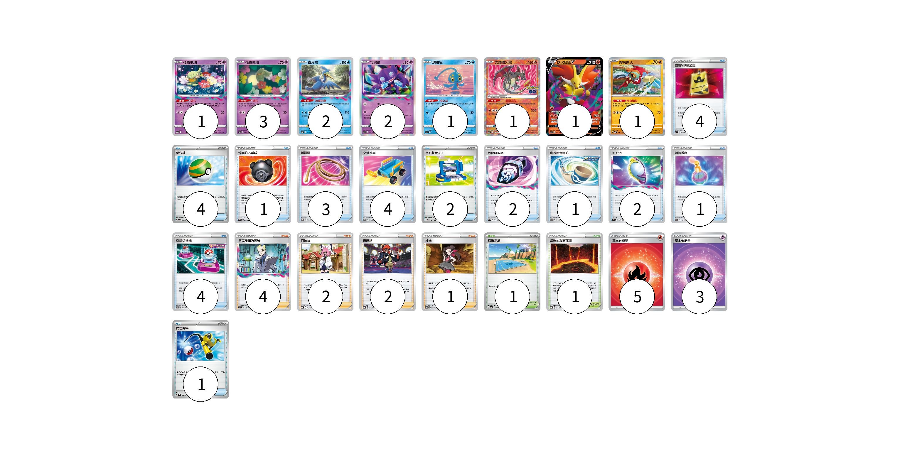 牌組構築方案 以此牌組為基礎新構築牌組 顯示卡面 顯示列表 寶可夢卡(12) 1 3 2 2 1 1 1 1 物品卡(29) 4 4 1 3 4 2 2 1 2 1 4 1 支援者卡(9) 4 2 2 1 競技場卡(2) 1 1 能量卡(8) 5 3 寶可夢卡(12) 卡牌名稱 張數 卡牌名稱 張數 花療環環 S12a 064/172 01 花療環環 S11 049/100 03 古月鳥 S11 033/100 02 勾魂眼 S11 044/100 02 瑪納霏 S12a 029/172 01 光輝噴火龍 S10b 011/071 01 妖火紅狐V S11 017/100 01 摔角鷹人 SV1S 045/078 01 物品卡(29) 卡牌名稱 張數 卡牌名稱 張數 對戰VIP參加證 S8 091/100 04 巢穴球 SVC 013/021 04 洗翠的沉重球 SVB 014/028 01 離洞繩 SCB 117/156 03 交替推車 S10D 060/067 04 寶可裝置3.0 SVC 015/021 02 放逐吸塵器 S12a 144/172 02 山谷回音喇叭 S5a 064/070 01 幻想門 S12a 141/172 02 消除香水 S9a 063/067 01 交錯切換機 S8 090/100 04 厲害釣竿 SV2P 066/071 01 支援者卡(9) 卡牌名稱 張數 卡牌名稱 張數 阿克羅瑪的實驗 S12a 148/172 04 克拉拉 SVB 019/028 02 奇巴納 SVB 018/028 02 杜娟 SVB 021/028 01 競技場卡(2) 卡牌名稱 張數 卡牌名稱 張數 海灘場地 SV1S 078/078 01 熔岩的瀑布深潭 SVB 027/028 01 能量卡(8) 卡牌名稱 張數 卡牌名稱 張數 基本【炎】能量 SI FIR 05 基本【超】能量 SI PSY 03 以此牌組為基礎新構築牌組 牌組編碼 iDUuXH-ICpkFH-XOZRlA copy 列印牌組單 牌組編碼已複製 分享至SNS