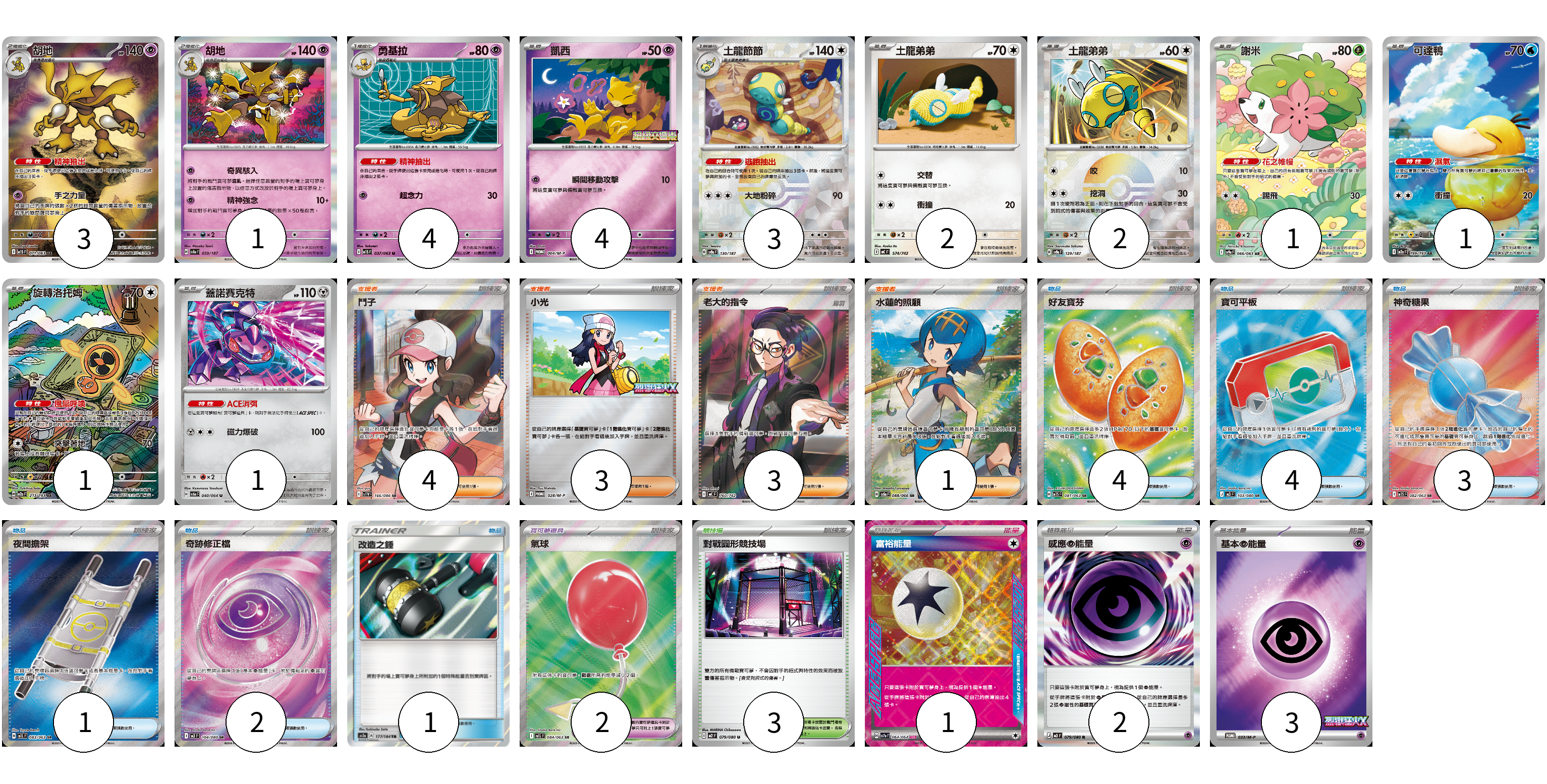 牌組構築方案 以此牌組為基礎新構築牌組 顯示卡面 顯示列表 寶可夢卡(23) 3 1 4 4 3 2 2 1 1 1 1 寶可夢道具(2) 2 物品卡(15) 4 4 3 1 2 1 支援者卡(11) 4 3 3 1 競技場卡(3) 3 能量卡(6) 1 2 3 寶可夢卡(23) 卡牌名稱 張數 卡牌名稱 張數 胡地 M1S 071/063 03 胡地 SV8a 059/187 01 勇基拉 M1S 037/063 04 凱西 M-P 004/M-P 04 土龍節節 SV8a 130/187 03 土龍弟弟 MC 574/742 02 土龍弟弟 SV8a 129/187 02 謝米 SV9a 066/063 01 可達鴨 M2a 199/193 01 旋轉洛托姆 M2a 213/193 01 蓋諾賽克特 SV6a 040/064 01 寶可夢道具(2) 卡牌名稱 張數 卡牌名稱 張數 氣球 M1L 084/063 02 物品卡(15) 卡牌名稱 張數 卡牌名稱 張數 好友寶芬 M1S 081/063 04 寶可平板 M3 103/080 04 神奇糖果 M1S 082/063 03 夜間擔架 M1L 083/063 01 奇跡修正檔 M3 104/080 02 改造之錘 AS5a 177/184 01 支援者卡(11) 卡牌名稱 張數 卡牌名稱 張數 鬥子 SV11W 166/086 04 小光 M-P 028/M-P 03 老大的指令(烏羽) MC 760/742 03 水蓮的照顧 SV5a 088/066 01 競技場卡(3) 卡牌名稱 張數 卡牌名稱 張數 對戰圓形競技場 M2 079/080 03 能量卡(6) 卡牌名稱 張數 卡牌名稱 張數 富裕能量 SV7a 064/064 01 感應【超】能量 M3 079/080 02 基本【超】能量 M-P 033/M-P 03 以此牌組為基礎新構築牌組 牌組編碼 iGKWro-VtlTkn-TgsEqI copy 列印牌組單 牌組編碼已複製 分享至SNS