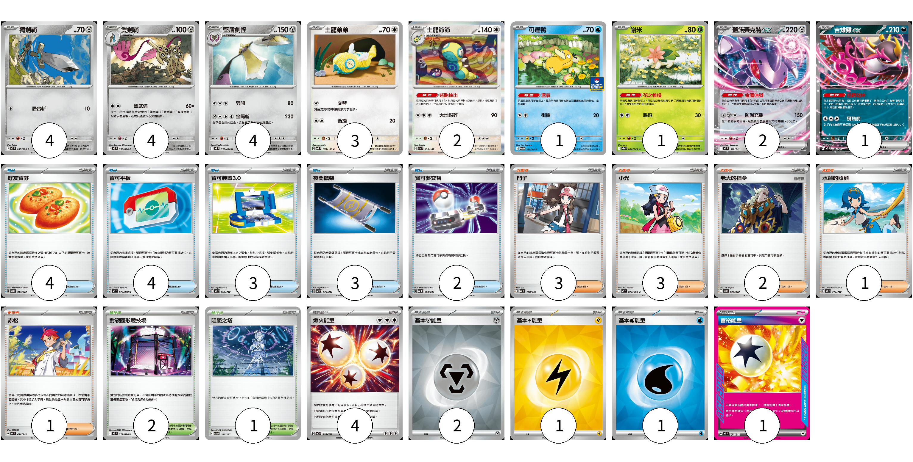 牌組構築方案 以此牌組為基礎新構築牌組 顯示卡面 顯示列表 寶可夢卡(22) 4 4 4 3 2 1 1 2 1 物品卡(16) 4 4 3 3 2 支援者卡(10) 3 3 2 1 1 競技場卡(3) 2 1 能量卡(9) 4 2 1 1 1 寶可夢卡(22) 卡牌名稱 張數 卡牌名稱 張數 獨劍鞘 M3 055/080 04 雙劍鞘 M3 056/080 04 堅盾劍怪 M3 057/080 04 土龍弟弟 SV9 078/100 03 土龍節節 SV8a 130/187 02 可達鴨 SV-P 220/SV-P 01 謝米 SV9a 006/063 01 蓋諾賽克特ex MC 512/742 02 吉雉雞ex MC 489/742 01 物品卡(16) 卡牌名稱 張數 卡牌名稱 張數 好友寶芬 MBD 013/022 04 寶可平板 M3 070/080 04 寶可裝置3.0 MC 660/742 03 夜間擔架 MC 670/742 03 寶可夢交替 MC 663/742 02 支援者卡(10) 卡牌名稱 張數 卡牌名稱 張數 鬥子 MC 718/742 03 小光 M2 077/080 03 老大的指令 MBD 020/022 02 水蓮的照顧 MC 712/742 01 赤松 MC 696/742 01 競技場卡(3) 卡牌名稱 張數 卡牌名稱 張數 對戰圓形競技場 M2 079/080 02 阻礙之塔 SV8a 181/187 01 能量卡(9) 卡牌名稱 張數 卡牌名稱 張數 燃火能量 MC 736/742 04 基本【鋼】能量 SVOD MET 02 基本【雷】能量 SVQP LIG 01 基本【水】能量 SVM WAT 01 富裕能量 MC 740/742 01 以此牌組為基礎新構築牌組 牌組編碼 iGyzjp-iTfTDk-lRLNVF copy 列印牌組單 牌組編碼已複製 分享至SNS