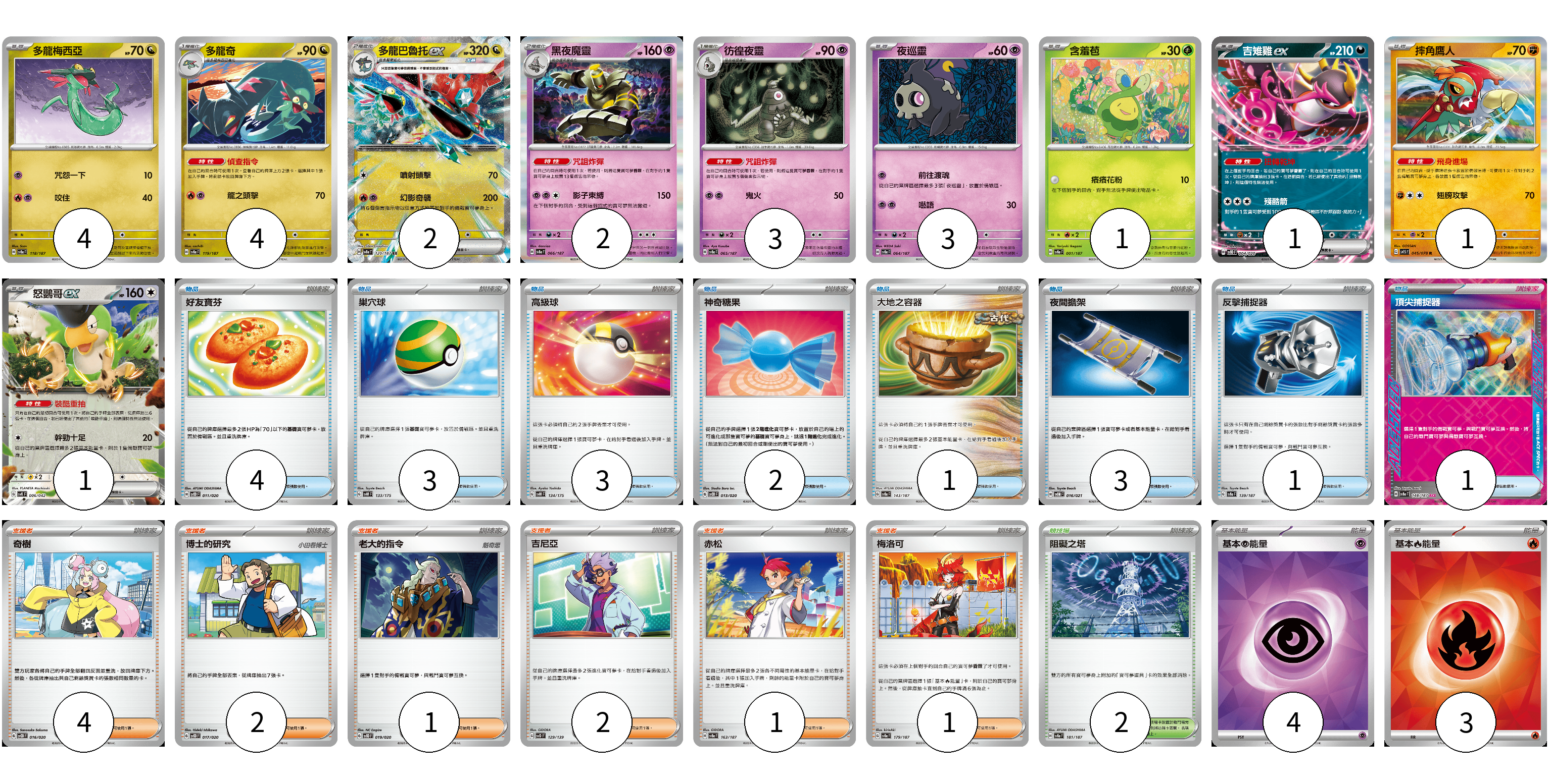 牌組構築方案 以此牌組為基礎新構築牌組 顯示卡面 顯示列表 寶可夢卡(22) 4 4 2 2 3 3 1 1 1 1 物品卡(18) 4 3 3 2 1 3 1 1 支援者卡(11) 4 2 1 2 1 1 競技場卡(2) 2 能量卡(7) 4 3 寶可夢卡(22) 卡牌名稱 張數 卡牌名稱 張數 多龍梅西亞 SV8a 118/187 04 多龍奇 SV8a 119/187 04 多龍巴魯托ex SV8a 120/187 02 黑夜魔靈 SV8a 066/187 02 彷徨夜靈 SV8a 065/187 03 夜巡靈 SV8a 064/187 03 含羞苞 SV8a 001/187 01 吉雉雞ex SVOD 004/020 01 摔角鷹人 SV1S 045/078 01 怒鸚哥ex SVK 006/042 01 物品卡(18) 卡牌名稱 張數 卡牌名稱 張數 好友寶芬 SVOD 011/020 04 巢穴球 SVM 133/175 03 高級球 SVM 134/175 03 神奇糖果 SVOD 013/020 02 大地之容器 SV8a 143/187 01 夜間擔架 SVOM 016/021 03 反擊捕捉器 SV8a 139/187 01 頂尖捕捉器 SV8a 148/187 01 支援者卡(11) 卡牌名稱 張數 卡牌名稱 張數 奇樹 SVOD 016/020 04 博士的研究 SVOD 017/020 02 老大的指令 SVOD 019/020 01 吉尼亞 SVD 129/139 02 赤松 SV8a 163/187 01 梅洛可 SV8a 179/187 01 競技場卡(2) 卡牌名稱 張數 卡牌名稱 張數 阻礙之塔 SV8a 181/187 02 能量卡(7) 卡牌名稱 張數 卡牌名稱 張數 基本【超】能量 SVOD PSY 04 基本【火】能量 SVK FIR 03 以此牌組為基礎新構築牌組 牌組編碼 iIsgms-hKydZY-LmTVuY copy 列印牌組單 牌組編碼已複製 分享至SNS