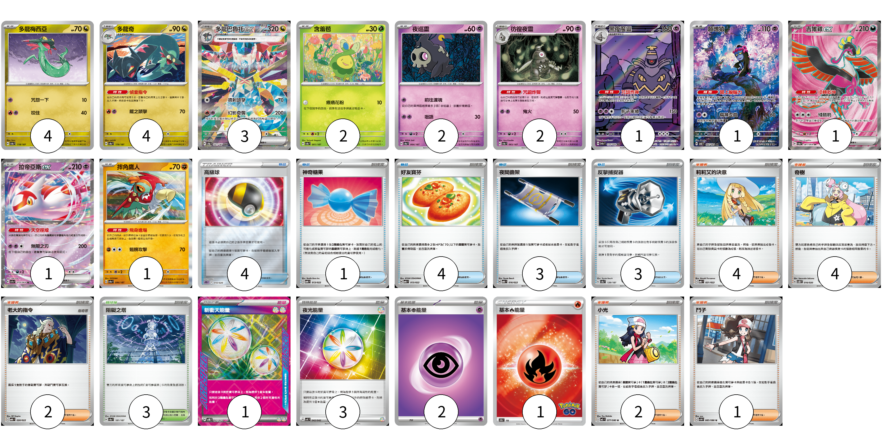 牌組構築方案 以此牌組為基礎新構築牌組 顯示卡面 顯示列表 寶可夢卡(22) 4 4 3 2 2 2 1 1 1 1 1 物品卡(15) 4 1 4 3 3 支援者卡(13) 4 4 2 2 1 競技場卡(3) 3 能量卡(7) 1 3 2 1 寶可夢卡(22) 卡牌名稱 張數 卡牌名稱 張數 多龍梅西亞 SV8a 118/187 04 多龍奇 SV8a 119/187 04 多龍巴魯托ex SV8a 221/187 03 含羞苞 SV8a 001/187 02 夜巡靈 SV8a 064/187 02 彷徨夜靈 SV8a 065/187 02 黑夜魔靈 SV6a 070/064 01 願增猿 SV6 107/101 01 吉雉雞ex SV6a 081/064 01 拉帝亞斯ex SV7a 019/064 01 摔角鷹人 SV8a 084/187 01 物品卡(15) 卡牌名稱 張數 卡牌名稱 張數 高級球 SPD 010/020 04 神奇糖果 MBG 013/022 01 好友寶芬 MBD 013/022 04 夜間擔架 MBD 016/022 03 反擊捕捉器 SV8a 139/187 03 支援者卡(13) 卡牌名稱 張數 卡牌名稱 張數 莉莉艾的決意 MBD 021/022 04 奇樹 SVOD 016/020 04 老大的指令 MBD 020/022 02 小光 M2 077/080 02 鬥子 SV11W 085/086 01 競技場卡(3) 卡牌名稱 張數 卡牌名稱 張數 阻礙之塔 SV8a 181/187 03 能量卡(7) 卡牌名稱 張數 卡牌名稱 張數 新衝天能量 SV5K 071/071 01 夜光能量 SVK 042/042 03 基本超能量 sv-p PSY 02 基本火能量 S10b FIR 01 以此牌組為基礎新構築牌組 牌組編碼 iLvFGI-goszfG-giFkXT copy 列印牌組單 牌組編碼已複製 分享至SNS