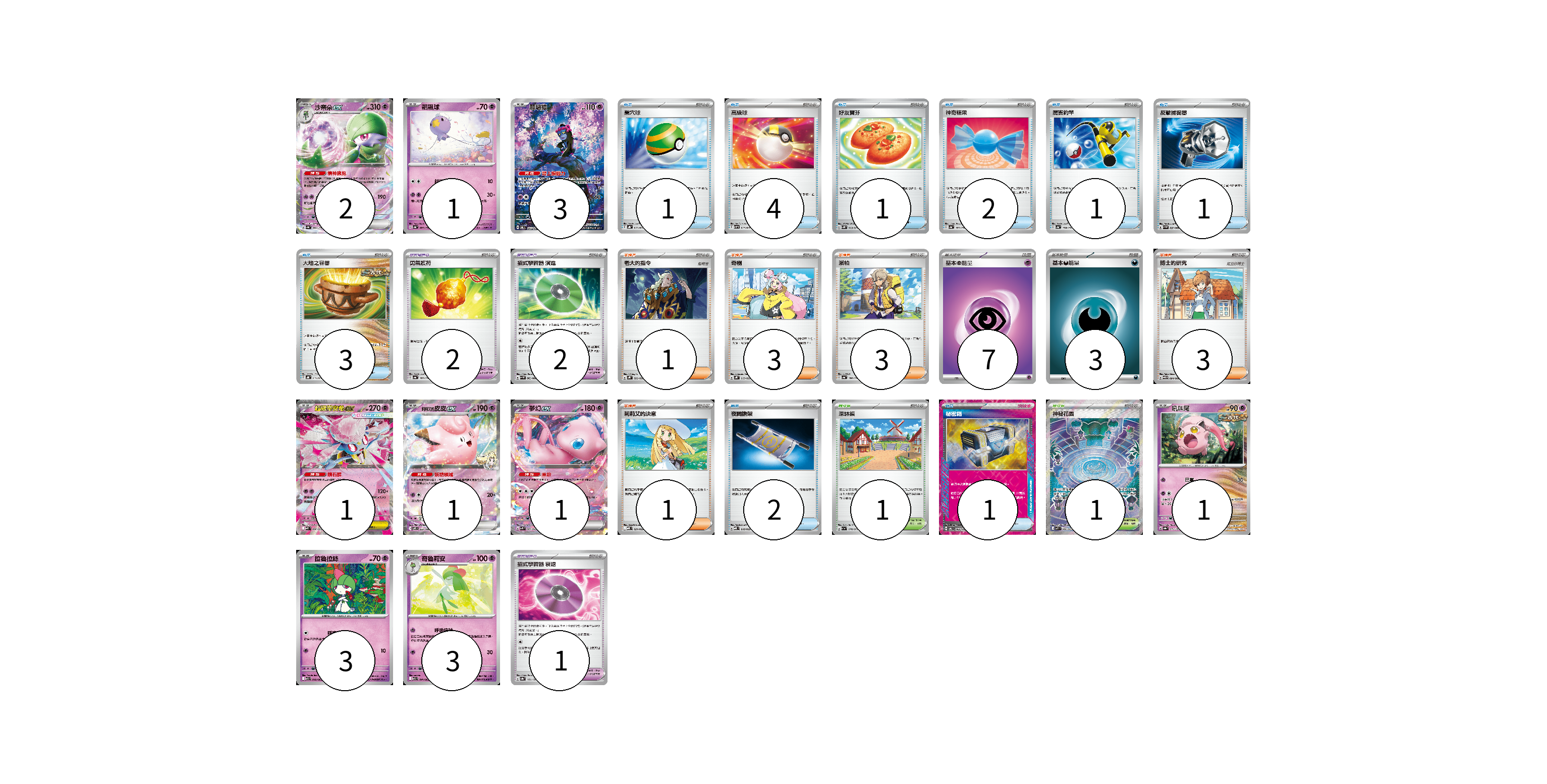 牌組構築方案 以此牌組為基礎新構築牌組 顯示卡面 顯示列表 寶可夢卡(16) 2 1 3 1 1 1 1 3 3 寶可夢道具(5) 2 2 1 物品卡(16) 1 4 1 2 1 1 3 2 1 支援者卡(11) 1 3 3 3 1 競技場卡(2) 1 1 能量卡(10) 7 3 寶可夢卡(16) 卡牌名稱 張數 卡牌名稱 張數 沙奈朵ex SV4a 082/190 02 飄飄球 SV4a 083/190 01 願增猿 SV6 107/101 03 超級蒂安希ex MBD 006/022 01 莉莉艾的皮皮ex SV9 033/100 01 夢幻ex SVK 001/042 01 吼叫尾 SV8a 071/187 01 拉魯拉絲 M1S 040/063 03 奇魯莉安 M1S 041/063 03 寶可夢道具(5) 卡牌名稱 張數 卡牌名稱 張數 勇氣護符 SV4a 169/190 02 招式學習器 演進 SV4M 063/066 02 招式學習器 衰退 SV8a 161/187 01 物品卡(16) 卡牌名稱 張數 卡牌名稱 張數 巢穴球 SVHK 012/022 01 高級球 SVHM 013/022 04 好友寶芬 SV5K 063/071 01 神奇糖果 SV4a 163/190 02 厲害釣竿 SV4a 158/190 01 反擊捕捉器 SV4M 059/066 01 大地之容器 SVHK 011/022 03 夜間擔架 MBD 016/022 02 秘密箱 SV6 092/101 01 支援者卡(11) 卡牌名稱 張數 卡牌名稱 張數 老大的指令 SVHK 022/022 01 奇樹 SVHK 019/022 03 派帕 SV4a 180/190 03 博士的研究 SV11B 084/086 03 莉莉艾的決意 MBD 021/022 01 競技場卡(2) 卡牌名稱 張數 卡牌名稱 張數 深缽鎮 SV1a 070/073 01 神秘花園 M1S 086/063 01 能量卡(10) 卡牌名稱 張數 卡牌名稱 張數 基本【超】能量 SVHM PSY 07 基本【惡】能量 SVF DAR 03 以此牌組為基礎新構築牌組 牌組編碼 iPIoii-NMDcyY-xxWiuu copy 列印牌組單 牌組編碼已複製 分享至SNS