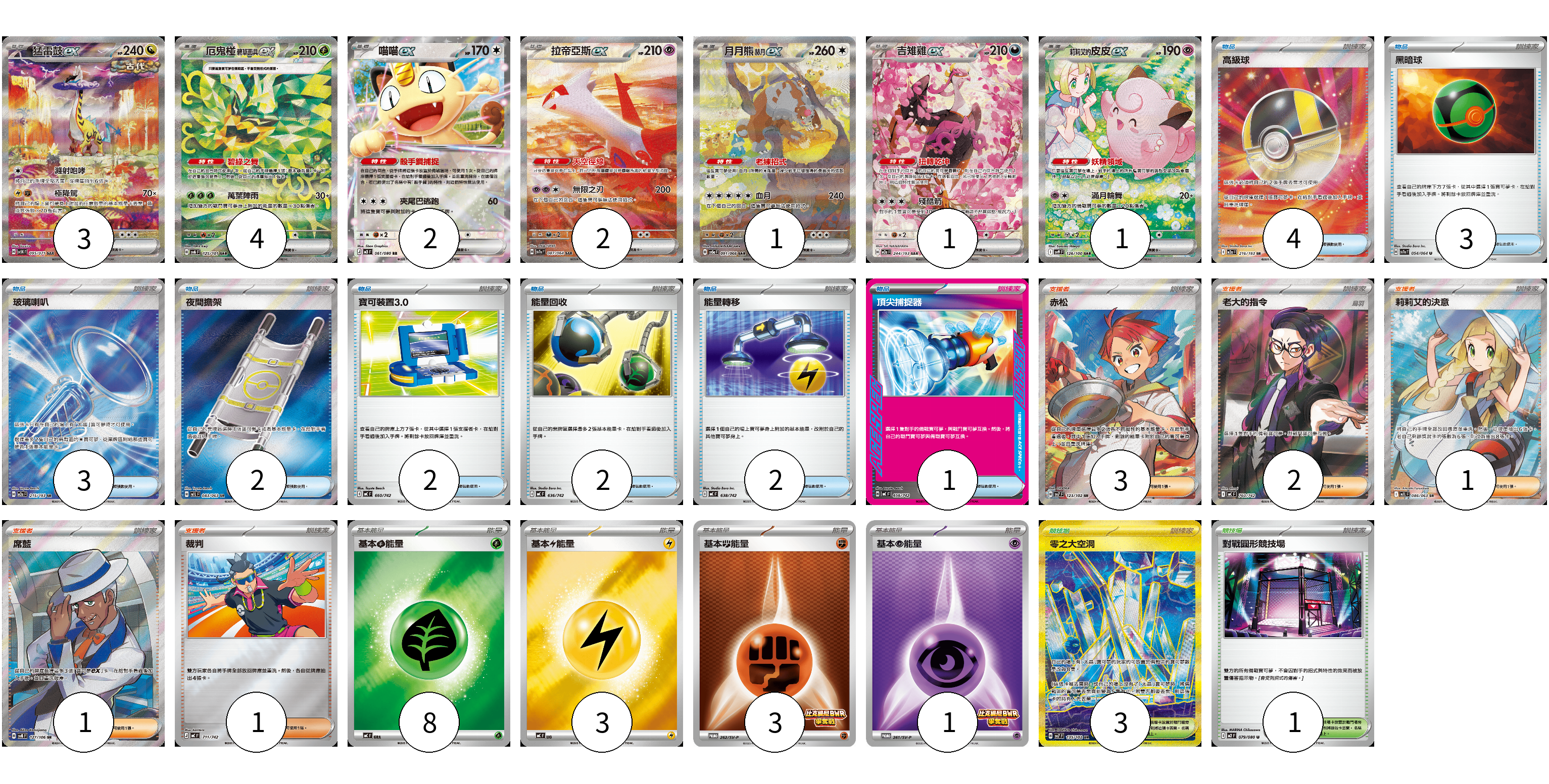 牌組構築方案 以此牌組為基礎新構築牌組 顯示卡面 顯示列表 寶可夢卡(14) 3 4 2 2 1 1 1 物品卡(19) 4 3 3 2 2 2 2 1 支援者卡(8) 3 2 1 1 1 競技場卡(4) 3 1 能量卡(15) 8 3 3 1 寶可夢卡(14) 卡牌名稱 張數 卡牌名稱 張數 猛雷鼓ex SV5K 095/071 03 厄鬼椪 碧草面具ex SV6 125/101 04 喵喵ex M3 061/080 02 拉帝亞斯ex SV7a 087/064 02 月月熊 赫月 ex SV5a 091/066 01 吉雉雞ex M2a 244/193 01 莉莉艾的皮皮ex SV9 126/100 01 物品卡(19) 卡牌名稱 張數 卡牌名稱 張數 高級球 M2a 216/193 04 黑暗球 SV7a 054/064 03 玻璃喇叭 M2a 215/193 03 夜間擔架 M1L 083/063 02 寶可裝置3.0 MC 660/742 02 能量回收 MC 636/742 02 能量轉移 MC 638/742 02 頂尖捕捉器 MC 656/742 01 支援者卡(8) 卡牌名稱 張數 卡牌名稱 張數 赤松 SV7 123/102 03 老大的指令(烏羽) MC 760/742 02 莉莉艾的決意 M1L 086/063 01 席藍 SV8 127/106 01 裁判 MC 711/742 01 競技場卡(4) 卡牌名稱 張數 卡牌名稱 張數 零之大空洞 SV7 135/102 03 對戰圓形競技場 M2 079/080 01 能量卡(15) 卡牌名稱 張數 卡牌名稱 張數 基本【草】能量 MC GRA 08 基本【雷】能量 MC LIG 03 基本【鬥】能量 SV-P 262/SV-P 03 基本【超】能量 SV-P 261/SV-P 01 以此牌組為基礎新構築牌組 牌組編碼 iPuobd-auDLoJ-JxUhiq copy 列印牌組單 牌組編碼已複製 分享至SNS