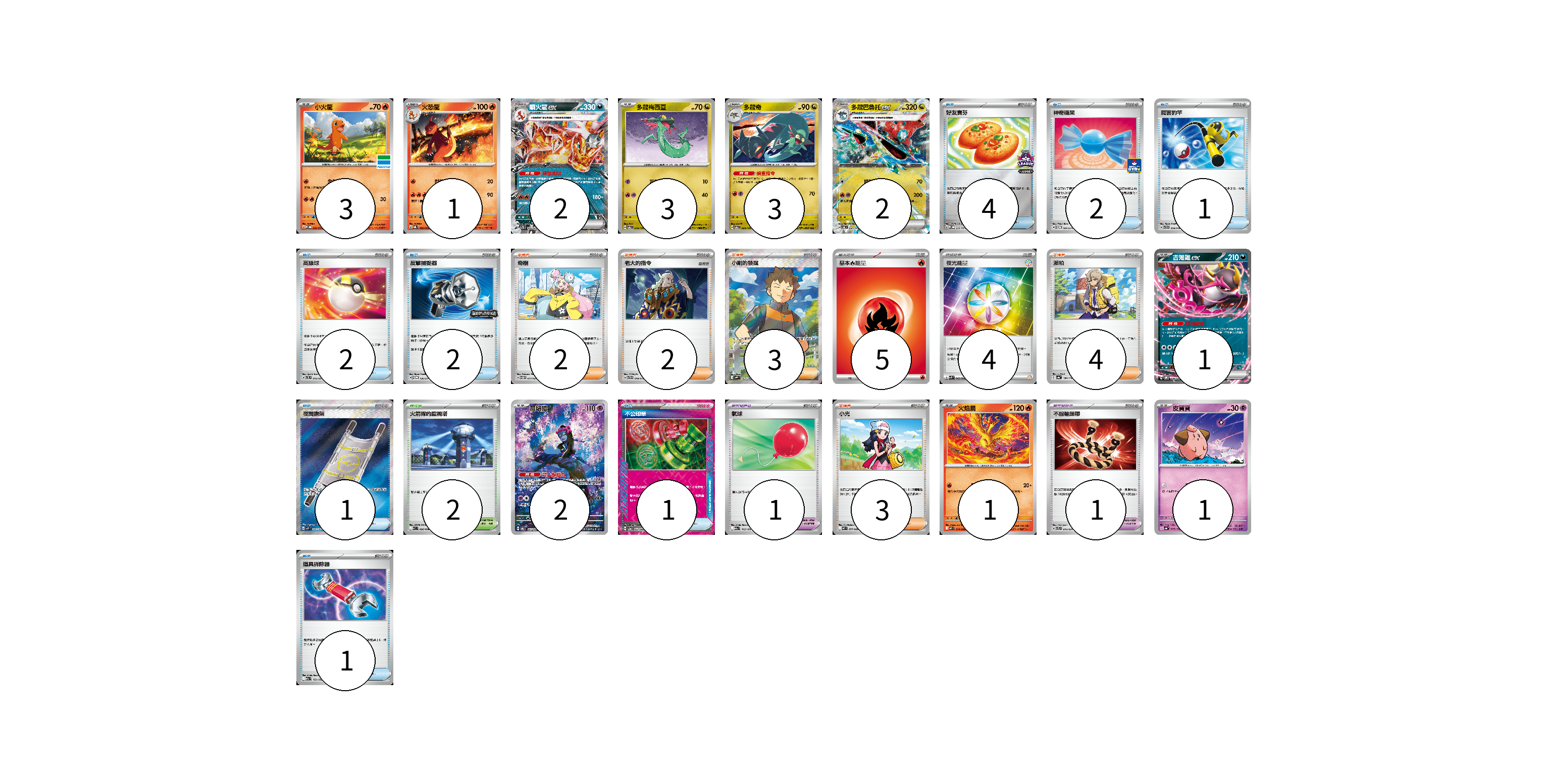 牌組構築方案 以此牌組為基礎新構築牌組 顯示卡面 顯示列表 寶可夢卡(19) 3 1 2 3 3 2 1 2 1 1 寶可夢道具(2) 1 1 物品卡(14) 4 2 1 2 2 1 1 1 支援者卡(14) 2 2 3 4 3 競技場卡(2) 2 能量卡(9) 5 4 寶可夢卡(19) 卡牌名稱 張數 卡牌名稱 張數 小火龍 SV-P 232/SV-P 03 火恐龍 SVQL 002/022 01 噴火龍ex SVTL 006/021 02 多龍梅西亞 SV6 079/101 03 多龍奇 SV6 080/101 03 多龍巴魯托ex SV6 081/101 02 吉雉雞ex SVOM 009/021 01 願增猿 SV6 107/101 02 火焰鳥 M2 014/080 01 皮寶寶 SV4a 077/190 01 寶可夢道具(2) 卡牌名稱 張數 卡牌名稱 張數 氣球 M2a 165/193 01 不服輸頭帶 SVTL 016/021 01 物品卡(14) 卡牌名稱 張數 卡牌名稱 張數 好友寶芬 SV-P 230/SV-P 04 神奇糖果 SV-P 104/SV-P 02 厲害釣竿 SVTH 008/018 01 高級球 SVTL 012/021 02 反擊捕捉器 SV-P 136/SV-P 02 夜間擔架 M1L 083/063 01 不公印章 SV5a 053/066 01 道具拆除器 M2a 151/193 01 支援者卡(14) 卡牌名稱 張數 卡牌名稱 張數 奇樹 SVTM 017/022 02 老大的指令 SVTG 019/019 02 小剛的發掘 SV9 123/100 03 派帕 SV4a 180/190 04 小光 M2 077/080 03 競技場卡(2) 卡牌名稱 張數 卡牌名稱 張數 火箭隊的監視塔 SV10 096/098 02 能量卡(9) 卡牌名稱 張數 卡牌名稱 張數 基本火能量 sv-p FIR 05 夜光能量 SVK 042/042 04 以此牌組為基礎新構築牌組 牌組編碼 iRMzJB-oICYHY-qAvQUl copy 列印牌組單 牌組編碼已複製 分享至SNS