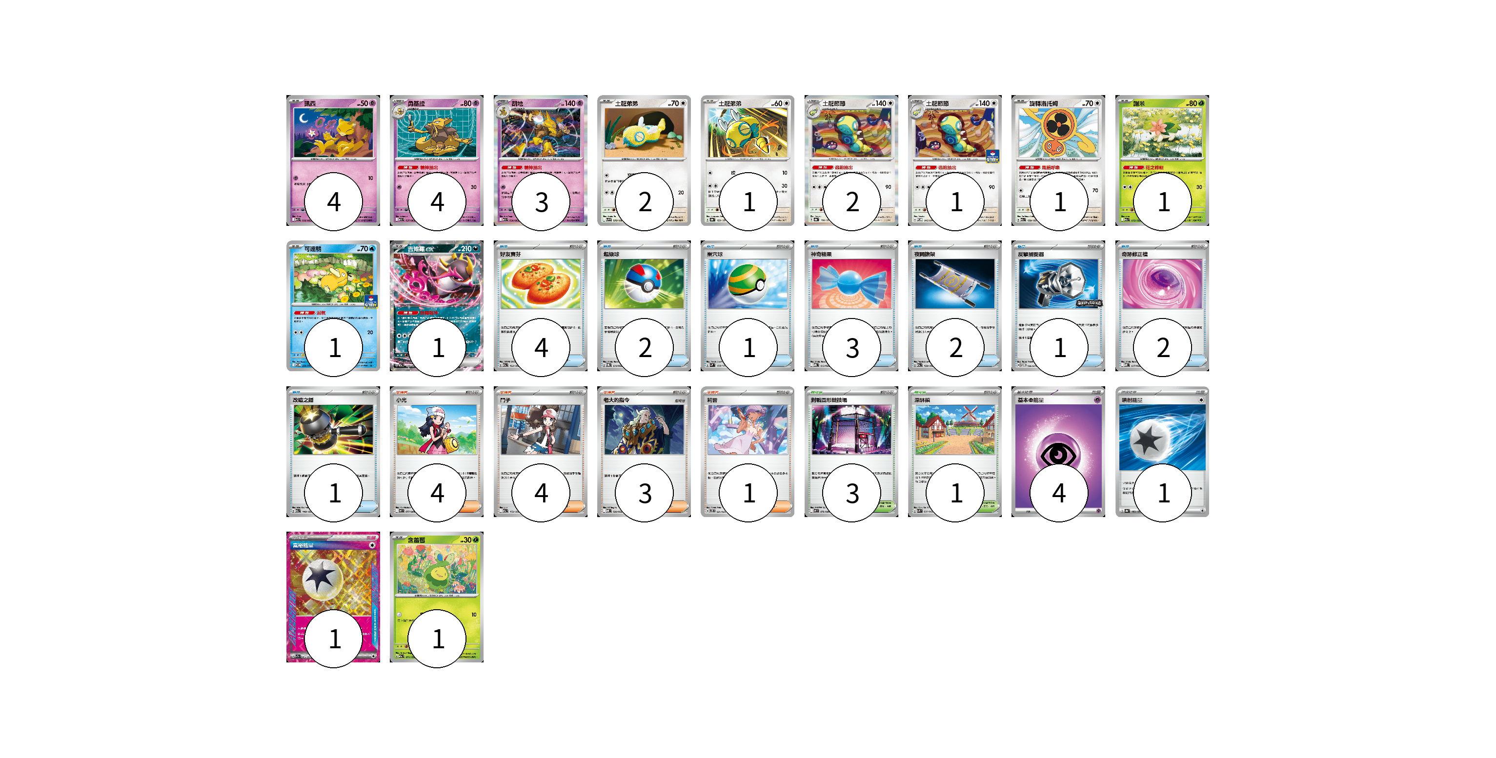 牌組構築方案 以此牌組為基礎新構築牌組 顯示卡面 顯示列表 寶可夢卡(22) 4 4 3 2 1 2 1 1 1 1 1 1 物品卡(16) 4 2 1 3 2 1 2 1 支援者卡(12) 4 4 3 1 競技場卡(4) 3 1 能量卡(6) 4 1 1 寶可夢卡(22) 卡牌名稱 張數 卡牌名稱 張數 凱西 M1S 036/063 04 勇基拉 M1S 037/063 04 胡地 M1S 038/063 03 土龍弟弟 SV9 078/100 02 土龍弟弟 SV8a 129/187 01 土龍節節 SV8a 130/187 02 土龍節節 M-P 045/M-P 01 旋轉洛托姆 M2a 139/193 01 謝米 M2a 012/193 01 可達鴨 SV-P 220/SV-P 01 吉雉雞ex M2a 114/193 01 含羞苞 M2a 011/193 01 物品卡(16) 卡牌名稱 張數 卡牌名稱 張數 好友寶芬 M2a 153/193 04 超級球 SVQL 014/022 02 巢穴球 SVM 133/175 01 神奇糖果 MBG 013/022 03 夜間擔架 M2a 159/193 02 反擊捕捉器 SV-P 136/SV-P 01 奇跡修正檔 MBD 017/022 02 改造之錘 M2a 148/193 01 支援者卡(12) 卡牌名稱 張數 卡牌名稱 張數 小光 M2 077/080 04 鬥子 M2a 172/193 04 老大的指令 MBD 020/022 03 莉普 SVTS 021/022 01 競技場卡(4) 卡牌名稱 張數 卡牌名稱 張數 對戰圓形競技場 M2 079/080 03 深缽鎮 SVK 039/042 01 能量卡(6) 卡牌名稱 張數 卡牌名稱 張數 基本【超】能量 MBD PSY 04 噴射能量 SV8a 185/187 01 富裕能量 SV7a 064/064 01 以此牌組為基礎新構築牌組 牌組編碼 iTxrNy-thtQhg-FDZVyE copy 列印牌組單 牌組編碼已複製 分享至SNS