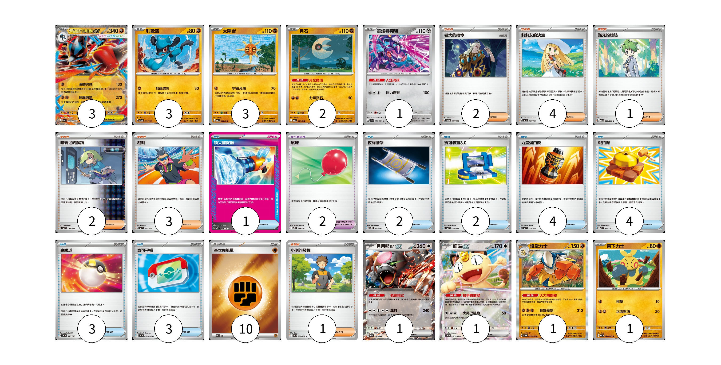 牌組構築方案 以此牌組為基礎新構築牌組 顯示卡面 顯示列表 寶可夢卡(16) 3 3 3 2 1 1 1 1 1 寶可夢道具(2) 2 物品卡(19) 1 2 2 4 4 3 3 支援者卡(13) 2 4 1 2 3 1 能量卡(10) 10 寶可夢卡(16) 卡牌名稱 張數 卡牌名稱 張數 超級路卡利歐ex M2a 092/193 03 利歐路 M2a 091/193 03 太陽岩 MC 372/742 03 月石 MC 371/742 02 蓋諾賽克特 SV6a 040/064 01 月月熊 赫月 ex MC 625/742 01 喵喵ex M3 061/080 01 鐵掌力士 M1L 025/063 01 幕下力士 M1L 024/063 01 寶可夢道具(2) 卡牌名稱 張數 卡牌名稱 張數 氣球 MC 688/742 02 物品卡(19) 卡牌名稱 張數 卡牌名稱 張數 頂尖捕捉器 MC 656/742 01 夜間擔架 MC 670/742 02 寶可裝置3.0 MC 660/742 02 力量蛋白飲 MC 652/742 04 戰鬥鑼 MC 654/742 04 高級球 MC 651/742 03 寶可平板 M3 070/080 03 支援者卡(13) 卡牌名稱 張數 卡牌名稱 張數 老大的指令 MBG 021/022 02 莉莉艾的決意 MC 729/742 04 滿充的體貼 M1S 060/063 01 暗碼迷的解讀 MC 698/742 02 裁判 MC 711/742 03 小剛的發掘 SV9 096/100 01 能量卡(10) 卡牌名稱 張數 卡牌名稱 張數 基本【鬥】能量 MC FIG 10 以此牌組為基礎新構築牌組 牌組編碼 iUChOq-ztqZVW-CxBMYz copy 列印牌組單 牌組編碼已複製 分享至SNS