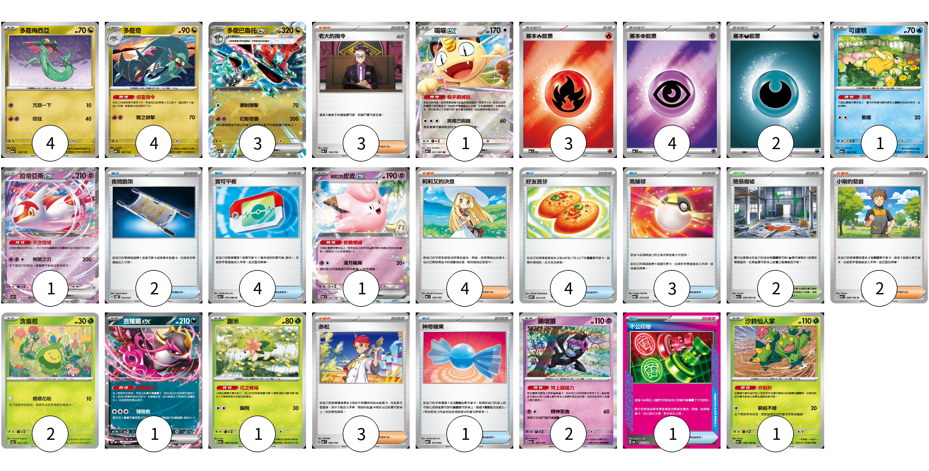 牌組構築方案 以此牌組為基礎新構築牌組 顯示卡面 顯示列表 寶可夢卡(22) 4 4 3 1 1 1 1 2 1 1 2 1 物品卡(15) 2 4 4 3 1 1 支援者卡(12) 3 4 2 3 競技場卡(2) 2 能量卡(9) 3 4 2 寶可夢卡(22) 卡牌名稱 張數 卡牌名稱 張數 多龍梅西亞 M2a 132/193 04 多龍奇 MC 547/742 04 多龍巴魯托ex MC 548/742 03 喵喵ex M3 061/080 01 可達鴨 M2a 032/193 01 拉帝亞斯ex SV7a 019/064 01 莉莉艾的皮皮ex MC 287/742 01 含羞苞 SV8a 001/187 02 吉雉雞ex MC 489/742 01 謝米 SV9a 006/063 01 願增猿 M2a 081/193 02 沙鈴仙人掌 SV9 006/100 01 物品卡(15) 卡牌名稱 張數 卡牌名稱 張數 夜間擔架 SVOM 016/021 02 寶可平板 M3 070/080 04 好友寶芬 SVTG 011/019 04 高級球 MBG 012/022 03 神奇糖果 MBG 013/022 01 不公印章 MC 633/742 01 支援者卡(12) 卡牌名稱 張數 卡牌名稱 張數 老大的指令 MC 724/742 03 莉莉艾的決意 MC 729/742 04 小剛的發掘 SV9 096/100 02 赤松 MC 696/742 03 競技場卡(2) 卡牌名稱 張數 卡牌名稱 張數 險惡廢墟 M1L 063/063 02 能量卡(9) 卡牌名稱 張數 卡牌名稱 張數 基本【火】能量 MC FIR 03 基本【超】能量 MC PSY 04 基本【惡】能量 MC DAR 02 以此牌組為基礎新構築牌組 牌組編碼 iWqudY-kBafgD-cmxAwu copy 列印牌組單 牌組編碼已複製 分享至SNS