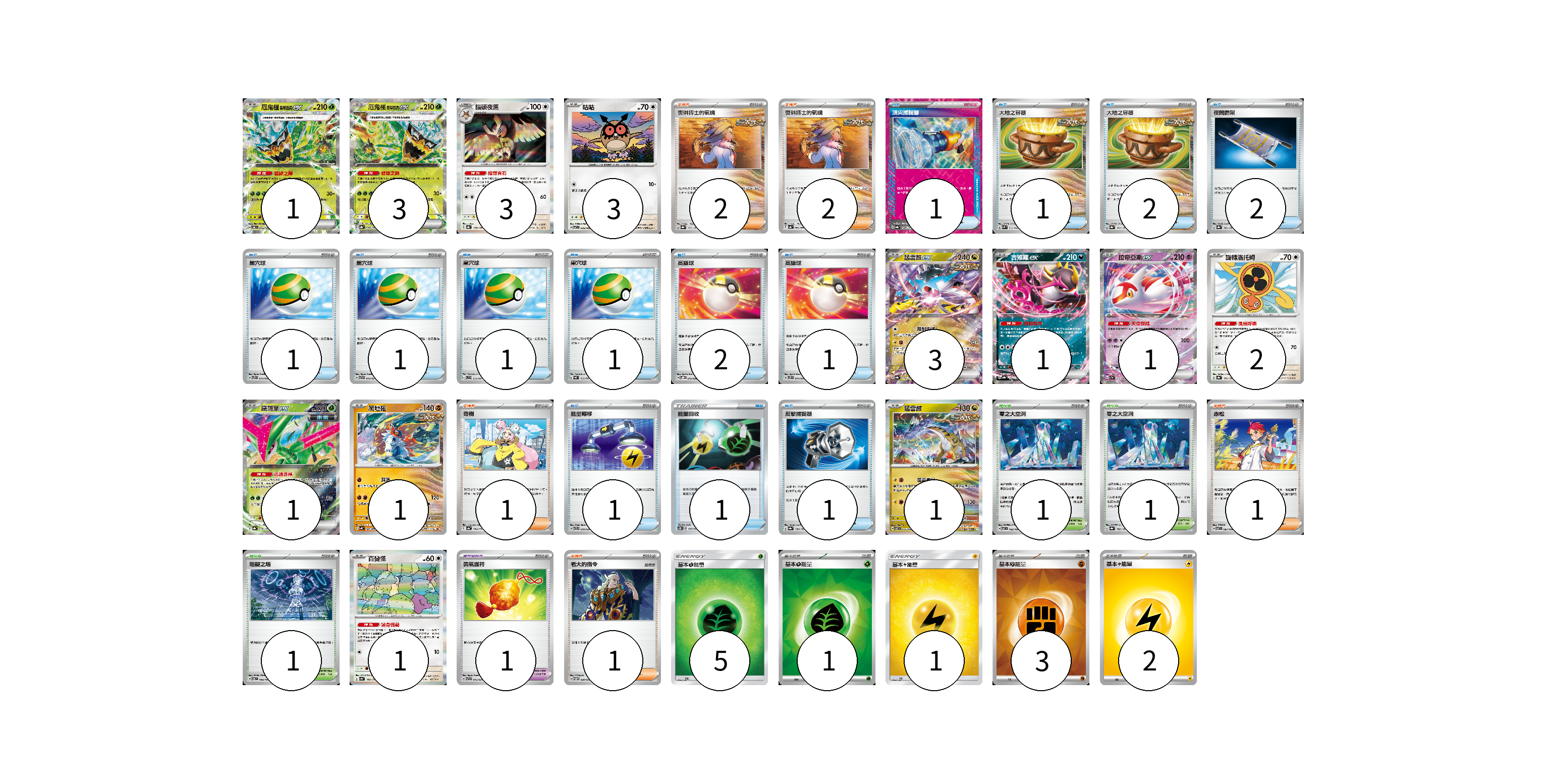 牌組構築方案 以此牌組為基礎新構築牌組 顯示卡面 顯示列表 寶可夢卡(21) 1 3 3 3 3 1 1 2 1 1 1 1 寶可夢道具(1) 1 物品卡(16) 1 1 2 2 1 1 1 1 2 1 1 1 1 支援者卡(7) 2 2 1 1 1 競技場卡(3) 1 1 1 能量卡(12) 5 1 1 3 2 寶可夢卡(21) 卡牌名稱 張數 卡牌名稱 張數 厄鬼椪 碧草面具ex SV6 016/101 01 厄鬼椪 碧草面具ex SV8a 020/187 03 貓頭夜鷹 SV8a 128/187 03 咕咕 SV7 076/102 03 猛雷鼓ex SV8a 124/187 03 吉雉雞ex SV8a 104/187 01 拉帝亞斯ex SV7a 019/064 01 旋轉洛托姆 SV8a 131/187 02 鐵斑葉ex SV8a 016/187 01 爬地翅 SV4K 041/066 01 猛雷鼓 SV7 075/102 01 百變怪 SV4a 144/190 01 寶可夢道具(1) 卡牌名稱 張數 卡牌名稱 張數 勇氣護符 SVTR 015/021 01 物品卡(16) 卡牌名稱 張數 卡牌名稱 張數 頂尖捕捉器 SV8a 148/187 01 大地之容器 SVK 012/042 01 大地之容器 SV8a 143/187 02 夜間擔架 SV8a 151/187 02 巢穴球 SVTS 013/022 01 巢穴球 SVTR 013/021 01 巢穴球 SVC 013/021 01 巢穴球 SVAL 012/021 01 高級球 SVOD 012/020 02 高級球 SVTS 014/022 01 能量轉移 SVTR 010/021 01 能量回收 SC2D 133/157 01 反擊捕捉器 SV8a 139/187 01 支援者卡(7) 卡牌名稱 張數 卡牌名稱 張數 奧琳博士的氣魄 SV8a 167/187 02 奧琳博士的氣魄 SV4K 064/066 02 奇樹 SV4a 174/190 01 赤松 SV7 097/102 01 老大的指令 SVTM 020/022 01 競技場卡(3) 卡牌名稱 張數 卡牌名稱 張數 零之大空洞 SV7 102/102 01 零之大空洞 SV8a 182/187 01 阻礙之塔 SV6 100/101 01 能量卡(12) 卡牌名稱 張數 卡牌名稱 張數 基本草能量 AS6D GRA 05 基本【草】能量 SVK GRA 01 基本雷能量 AS6D LIG 01 基本【鬥】能量 SVK FIG 03 基本【雷】能量 SVAL LIG 02 以此牌組為基礎新構築牌組 牌組編碼 iWtPfu-isiFMe-BBPHBk copy 列印牌組單 牌組編碼已複製 分享至SNS