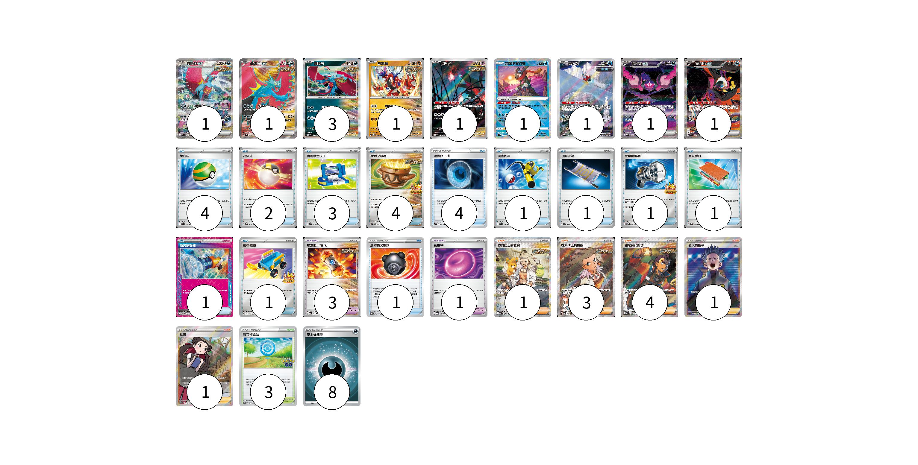 牌組構築方案 以此牌組為基礎新構築牌組 顯示卡面 顯示列表 寶可夢卡(11) 1 1 3 1 1 1 1 1 1 寶可夢道具(4) 3 1 物品卡(24) 4 2 3 4 4 1 1 1 1 1 1 1 支援者卡(10) 1 3 4 1 1 競技場卡(3) 3 能量卡(8) 8 寶可夢卡(11) 卡牌名稱 張數 卡牌名稱 張數 轟鳴月ex SV4K 090/066 01 轟鳴月ex SV4K 084/066 01 轟鳴月 SV5K 051/071 03 故勒頓 SV8 069/106 01 振翼髮 SV5K 076/071 01 光輝甲賀忍蛙 SVF 004/038 01 鐵包袱 SV4M 071/066 01 桃歹郎ex SV6a 090/064 01 吉雉雞ex SV6a 089/064 01 寶可夢道具(4) 卡牌名稱 張數 卡牌名稱 張數 驅勁能量 古代 SV5K 065/071 03 鎖鏈糬 SV6a 057/064 01 物品卡(24) 卡牌名稱 張數 卡牌名稱 張數 巢穴球 SVK 016/042 04 高級球 SVK 018/042 02 寶可裝置3.0 SVK 021/042 03 大地之容器 SV-P 084/SV-P 04 暗黑修正檔 SVF 014/038 04 厲害釣竿 SVK 011/042 01 夜間擔架 SV6a 056/064 01 反擊捕捉器 SV-P 083/SV-P 01 朋友手冊 SVK 014/042 01 頂尖捕捉器 SV5M 062/071 01 交替推車 SV-P 082/SV-P 01 洗翠的沉重球 SVF 019/038 01 支援者卡(10) 卡牌名稱 張數 卡牌名稱 張數 奧琳博士的氣魄 SV4K 091/066 01 奧琳博士的氣魄 SV4K 085/066 03 探險家的嚮導 SV5K 090/071 04 老大的指令(赤日) S12a 250/172 01 杜娟 S12a 242/172 01 競技場卡(3) 卡牌名稱 張數 卡牌名稱 張數 寶可補給站 S10b 071/071 03 能量卡(8) 卡牌名稱 張數 卡牌名稱 張數 基本惡能量 SLD DAR 08 以此牌組為基礎新構築牌組 牌組編碼 iYJjrm-gbmhpP-TOYtvE copy 列印牌組單 牌組編碼已複製 分享至SNS