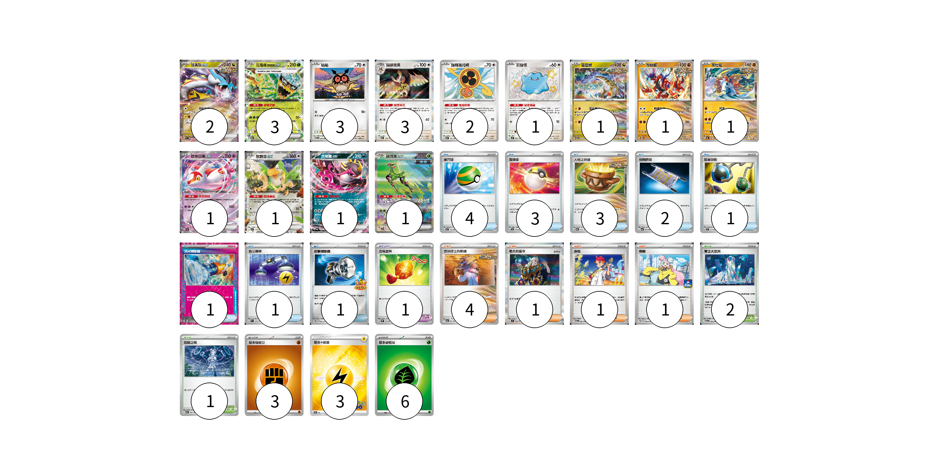 牌組構築方案 以此牌組為基礎新構築牌組 顯示卡面 顯示列表 寶可夢卡(21) 2 3 3 3 2 1 1 1 1 1 1 1 1 寶可夢道具(1) 1 物品卡(16) 4 3 3 2 1 1 1 1 支援者卡(7) 4 1 1 1 競技場卡(3) 2 1 能量卡(12) 3 3 6 寶可夢卡(21) 卡牌名稱 張數 卡牌名稱 張數 猛雷鼓ex SV5K 053/071 02 厄鬼椪 碧草面具ex SV8a 020/187 03 咕咕 SV7 076/102 03 貓頭夜鷹 SV8a 128/187 03 旋轉洛托姆 SV8a 131/187 02 百變怪 SV4a 309/190 01 猛雷鼓 SV7 075/102 01 故勒頓 SV8 069/106 01 爬地翅 SV4K 041/066 01 拉帝亞斯ex SV7a 019/064 01 怒鸚哥ex SV4a 154/190 01 吉雉雞ex SV8a 104/187 01 鐵斑葉ex SV5M 093/071 01 寶可夢道具(1) 卡牌名稱 張數 卡牌名稱 張數 勇氣護符 SV2D 067/071 01 物品卡(16) 卡牌名稱 張數 卡牌名稱 張數 巢穴球 SVAL 012/021 04 高級球 SVAM 016/023 03 大地之容器 SV8a 143/187 03 夜間擔架 SV6a 056/064 02 能量回收 SVAW 011/023 01 頂尖捕捉器 SV5M 062/071 01 能量轉移 SVM 127/175 01 反擊捕捉器 SV-P 083/SV-P 01 支援者卡(7) 卡牌名稱 張數 卡牌名稱 張數 奧琳博士的氣魄 SV4K 064/066 04 老大的指令 SV1a 069/073 01 赤松 SV7 097/102 01 奇樹 SV-P 106/SV-P 01 競技場卡(3) 卡牌名稱 張數 卡牌名稱 張數 零之大空洞 SV7 102/102 02 阻礙之塔 SV8a 181/187 01 能量卡(12) 卡牌名稱 張數 卡牌名稱 張數 基本【鬥】能量 SVHK FIG 03 基本雷能量 S10b LIG 03 基本【草】能量 SVF GRA 06 以此牌組為基礎新構築牌組 牌組編碼 iZCIOd-XsByaY-pWKmjd copy 列印牌組單 牌組編碼已複製 分享至SNS