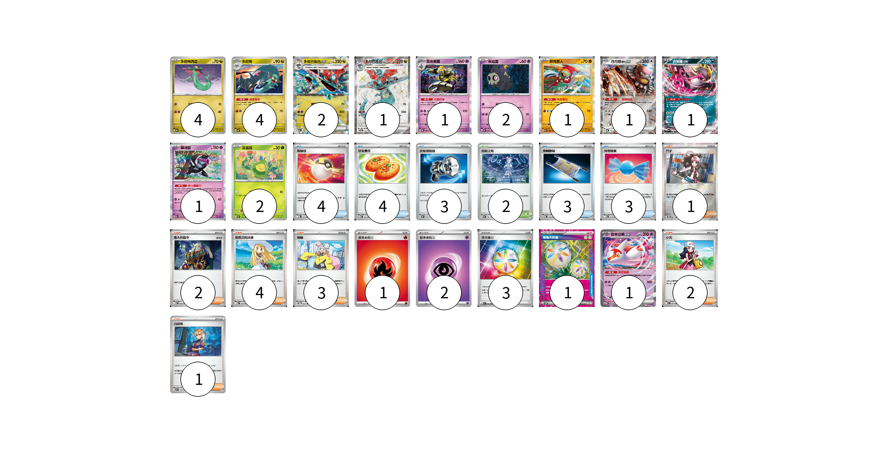 牌組構築方案 以此牌組為基礎新構築牌組 顯示卡面 顯示列表 寶可夢卡(21) 4 4 2 1 1 2 1 1 1 1 2 1 物品卡(17) 4 4 3 3 3 支援者卡(13) 1 2 4 3 2 1 競技場卡(2) 2 能量卡(7) 1 2 3 1 寶可夢卡(21) 卡牌名稱 張數 卡牌名稱 張數 多龍梅西亞 SV8a 118/187 04 多龍奇 SV8a 119/187 04 多龍巴魯托ex SV8a 120/187 02 多龍巴魯托ex SV6 120/101 01 黑夜魔靈 SV8a 066/187 01 夜巡靈 SV8a 064/187 02 摔角鷹人 SV8a 084/187 01 月月熊 赫月ex SV8a 134/187 01 吉雉雞ex SV6a 038/064 01 願增猿 SV8a 075/187 01 含羞苞 SV8a 001/187 02 拉帝亞斯ex MBD 003/022 01 物品卡(17) 卡牌名稱 張數 卡牌名稱 張數 高級球 MBD 014/022 04 好友寶芬 MBD 013/022 04 反擊捕捉器 SV8a 139/187 03 夜間擔架 MBD 016/022 03 神奇糖果 MBG 013/022 03 支援者卡(13) 卡牌名稱 張數 卡牌名稱 張數 鬥子 SV11W 085/086 01 老大的指令 MBD 020/022 02 莉莉艾的決意 MBD 021/022 04 奇樹 SVOD 016/020 03 小光 M2 077/080 02 白蕾雅 SV8a 176/187 01 競技場卡(2) 卡牌名稱 張數 卡牌名稱 張數 阻礙之塔 SV8a 181/187 02 能量卡(7) 卡牌名稱 張數 卡牌名稱 張數 基本【火】能量 SVTL FIR 01 基本【超】能量 SVTS PSY 02 夜光能量 SVK 042/042 03 新衝天能量 SV5K 071/071 01 以此牌組為基礎新構築牌組 牌組編碼 iZPfxK-oEGmLy-GxWAQF copy 列印牌組單 牌組編碼已複製 分享至SNS