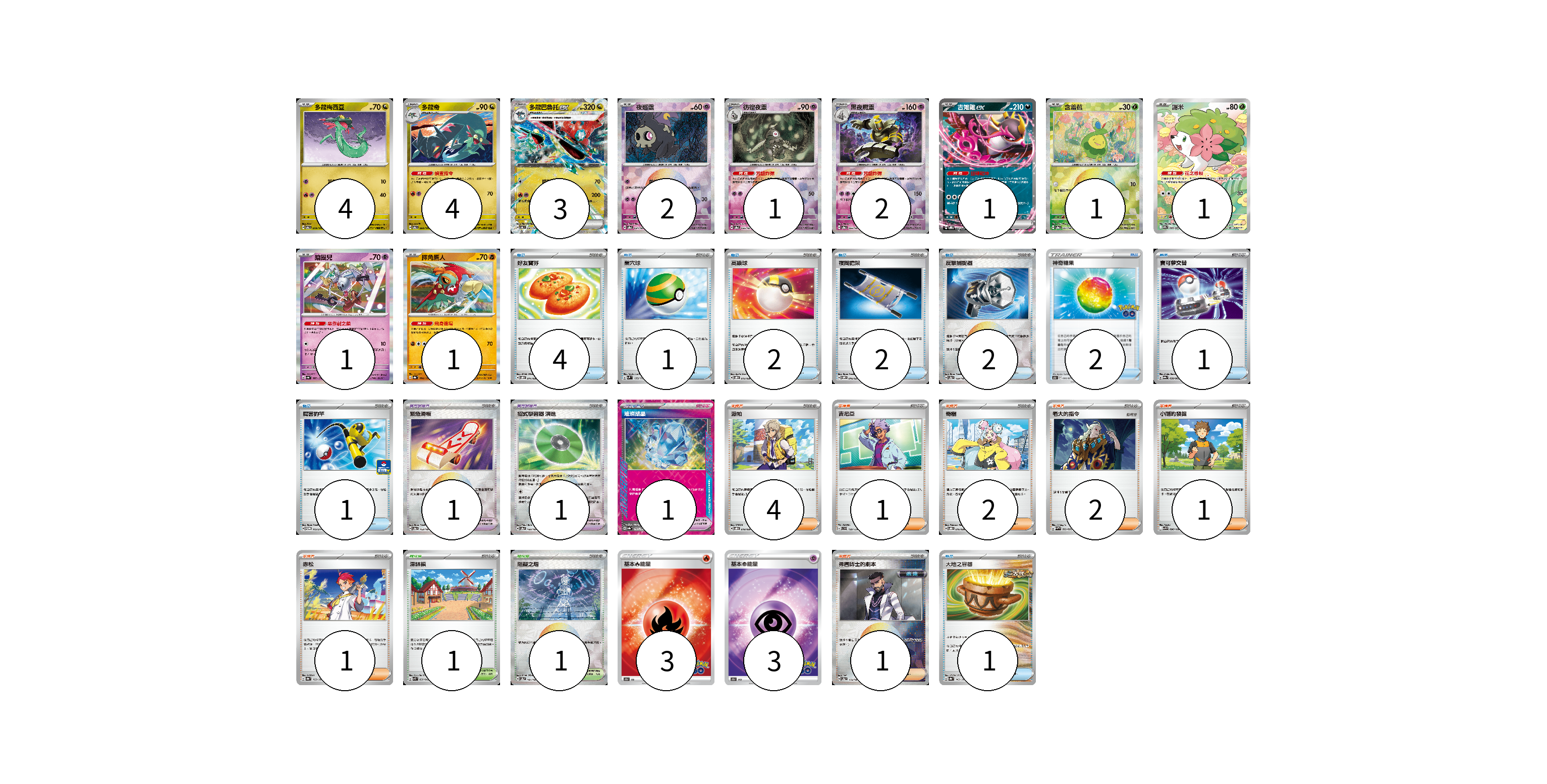 牌組構築方案 以此牌組為基礎新構築牌組 顯示卡面 顯示列表 寶可夢卡(21) 4 4 3 2 1 2 1 1 1 1 1 寶可夢道具(3) 1 1 1 物品卡(16) 4 1 2 2 2 2 1 1 1 支援者卡(12) 4 1 2 2 1 1 1 競技場卡(2) 1 1 能量卡(6) 3 3 寶可夢卡(21) 卡牌名稱 張數 卡牌名稱 張數 多龍梅西亞 SV6 079/101 04 多龍奇 SV6 080/101 04 多龍巴魯托ex SV6 081/101 03 夜巡靈 SV8a 064/187 02 彷徨夜靈 SV8a 065/187 01 黑夜魔靈 SV8a 066/187 02 吉雉雞ex SVOD 004/020 01 含羞苞 SV8a 001/187 01 謝米 SV9a 066/063 01 鑰圈兒 SV4a 087/190 01 摔角鷹人 SV8a 084/187 01 寶可夢道具(3) 卡牌名稱 張數 卡牌名稱 張數 緊急滑板 SV8a 153/187 01 招式學習器 演進 SV8a 160/187 01 璀璨結晶 SV8a 152/187 01 物品卡(16) 卡牌名稱 張數 卡牌名稱 張數 好友寶芬 SVOD 011/020 04 巢穴球 SVM 133/175 01 高級球 SVOD 012/020 02 夜間擔架 SVOM 016/021 02 反擊捕捉器 SV8a 139/187 02 神奇糖果 S10b 066/071 02 寶可夢交替 SV9a 058/063 01 厲害釣竿 SV-P 112/SV-P 01 大地之容器 SV8a 143/187 01 支援者卡(12) 卡牌名稱 張數 卡牌名稱 張數 派帕 SVOD 018/020 04 吉尼亞 SVD 129/139 01 奇樹 SVOD 016/020 02 老大的指令 SVHM 022/022 02 小剛的發掘 SV9 096/100 01 赤松 SV8a 163/187 01 弗圖博士的劇本 SV8a 175/187 01 競技場卡(2) 卡牌名稱 張數 卡牌名稱 張數 深缽鎮 SVK 039/042 01 阻礙之塔 SV8a 181/187 01 能量卡(6) 卡牌名稱 張數 卡牌名稱 張數 基本火能量 S10b FIR 03 基本超能量 S10b PSY 03 以此牌組為基礎新構築牌組 牌組編碼 iaQNPv-WvOGCb-pUyWXi copy 列印牌組單 牌組編碼已複製 分享至SNS