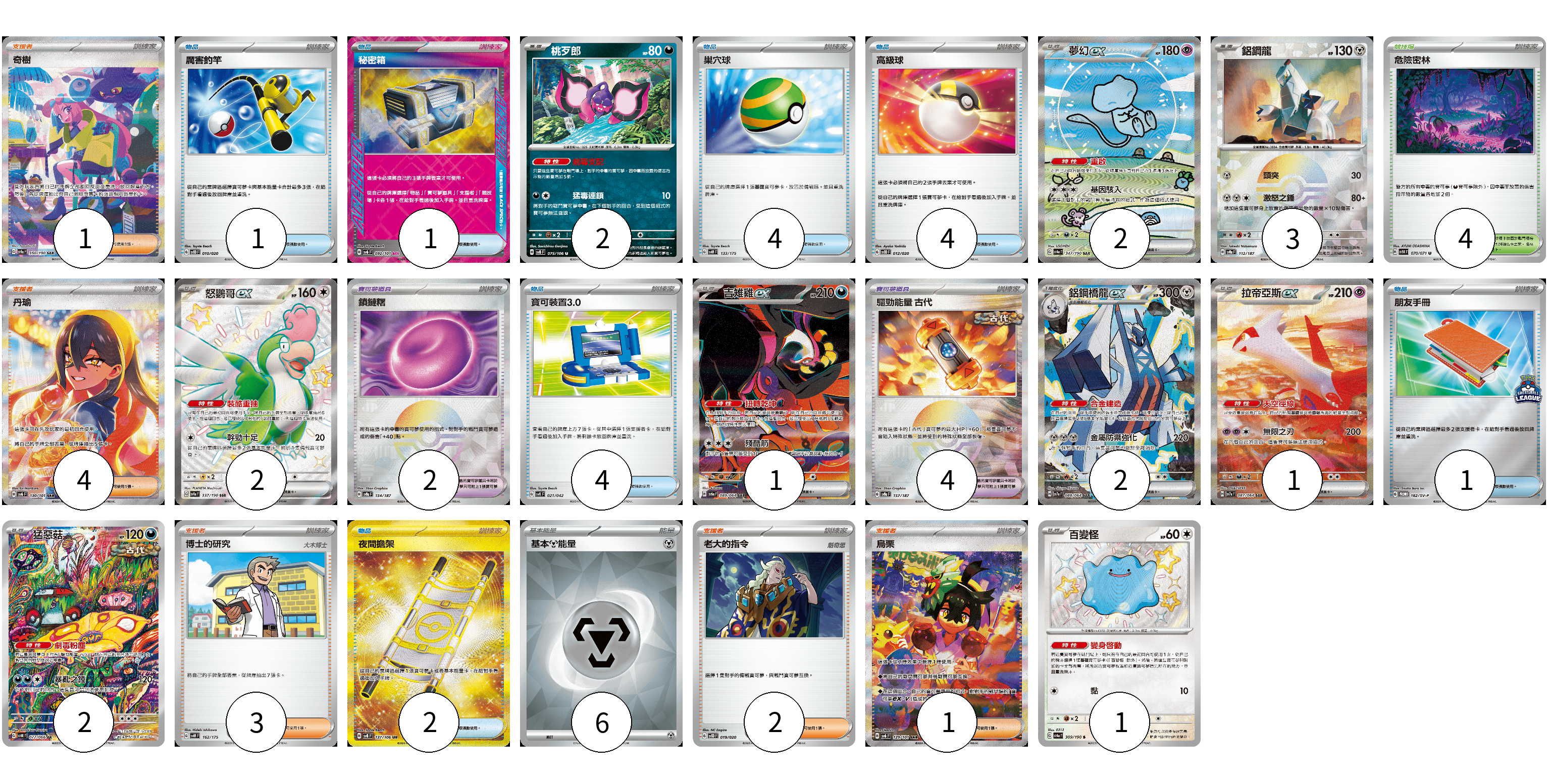 牌組構築方案 以此牌組為基礎新構築牌組 顯示卡面 顯示列表 寶可夢卡(16) 2 2 3 2 1 2 1 2 1 寶可夢道具(6) 2 4 物品卡(17) 1 1 4 4 4 1 2 支援者卡(11) 1 4 3 2 1 競技場卡(4) 4 能量卡(6) 6 寶可夢卡(16) 卡牌名稱 張數 卡牌名稱 張數 桃歹郎 SV8 075/106 02 夢幻ex SV4a 347/190 02 鋁鋼龍 SV8a 112/187 03 怒鸚哥ex SV4a 337/190 02 吉雉雞ex SV6a 089/064 01 鋁鋼橋龍ex SV7a 088/064 02 拉帝亞斯ex SV7a 087/064 01 猛惡菇 SV4K 077/066 02 百變怪 SV4a 309/190 01 寶可夢道具(6) 卡牌名稱 張數 卡牌名稱 張數 鎖鏈糬 SV8a 154/187 02 驅勁能量 古代 SV8a 157/187 04 物品卡(17) 卡牌名稱 張數 卡牌名稱 張數 厲害釣竿 SVOD 010/020 01 秘密箱 SV6 092/101 01 巢穴球 SVM 133/175 04 高級球 SVOD 012/020 04 寶可裝置3.0 SVK 021/042 04 朋友手冊 SV-P 182/SV-P 01 夜間擔架 SV8 137/106 02 支援者卡(11) 卡牌名稱 張數 卡牌名稱 張數 奇樹 SV4a 350/190 01 丹瑜 SV6 130/101 04 博士的研究 SVM 162/175 03 老大的指令 SVOD 019/020 02 烏栗 SV6 129/101 01 競技場卡(4) 卡牌名稱 張數 卡牌名稱 張數 危險密林 SV5K 070/071 04 能量卡(6) 卡牌名稱 張數 卡牌名稱 張數 基本【鋼】能量 SVOD MET 06 以此牌組為基礎新構築牌組 牌組編碼 ibSDYG-azGsfo-BIPWRp copy 列印牌組單 牌組編碼已複製 分享至SNS