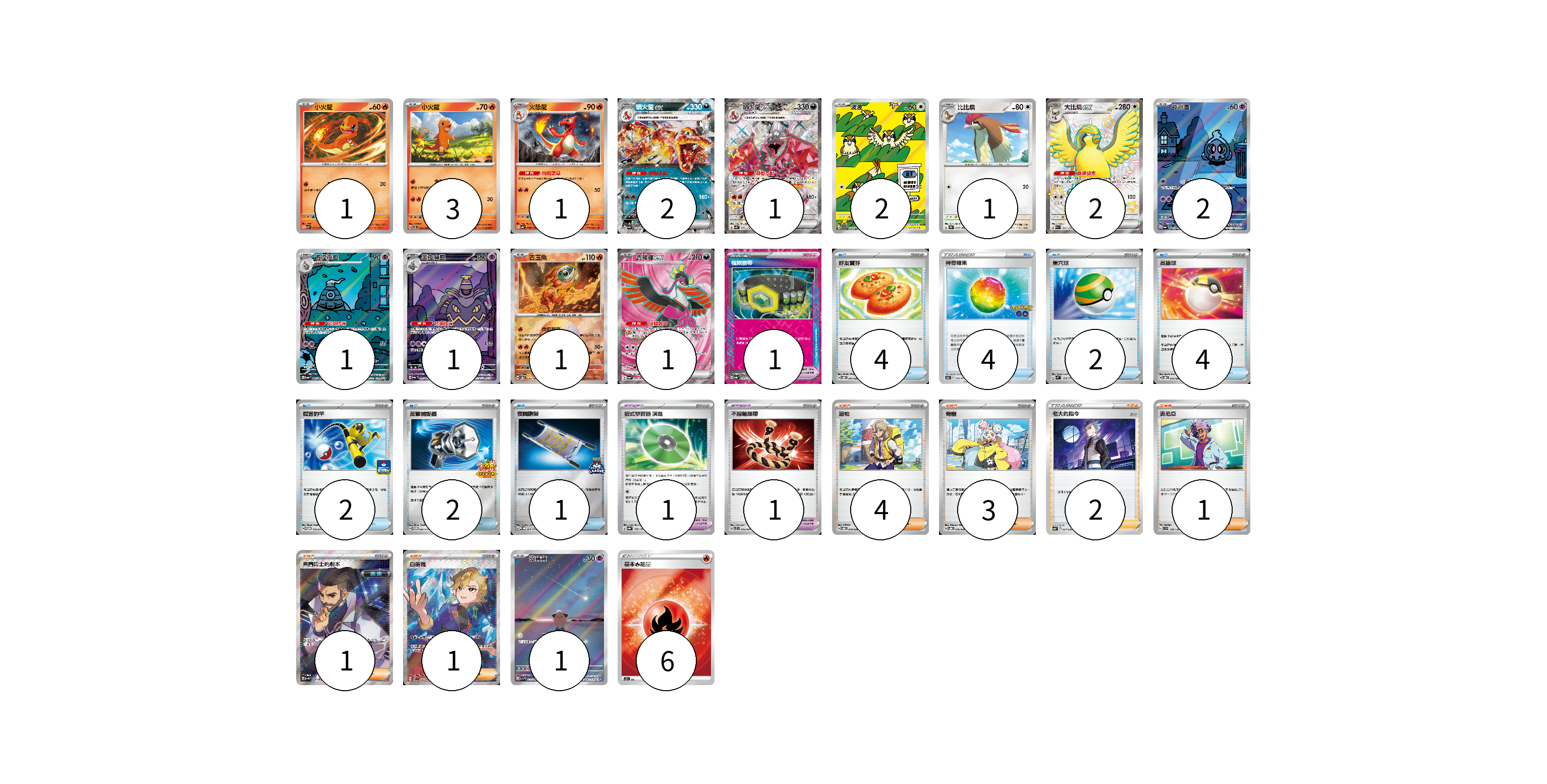牌組構築方案 以此牌組為基礎新構築牌組 顯示卡面 顯示列表 寶可夢卡(20) 1 3 1 2 1 2 1 2 2 1 1 1 1 1 寶可夢道具(3) 1 1 1 物品卡(19) 4 4 2 4 2 2 1 支援者卡(12) 4 3 2 1 1 1 能量卡(6) 6 寶可夢卡(20) 卡牌名稱 張數 卡牌名稱 張數 小火龍 SV3 012/108 01 小火龍 SVTL 001/021 03 火恐龍 SV4a 026/190 01 噴火龍ex SV4a 115/190 02 噴火龍ex SV4a 331/190 01 波波 SV3 118/108 02 比比鳥 SV2a 017/165 01 大比鳥ex SV4a 335/190 02 夜巡靈 SV6a 068/064 02 彷徨夜靈 SV6a 069/064 01 黑夜魔靈 SV6a 070/064 01 古玉魚 SV8a 025/187 01 吉雉雞ex SV6a 081/064 01 皮寶寶 SV3 113/108 01 寶可夢道具(3) 卡牌名稱 張數 卡牌名稱 張數 極限腰帶 SV8a 159/187 01 招式學習器 演進 SV8a 160/187 01 不服輸頭帶 SVTL 016/021 01 物品卡(19) 卡牌名稱 張數 卡牌名稱 張數 好友寶芬 SVOD 011/020 04 神奇糖果 S10b 066/071 04 巢穴球 SVM 133/175 02 高級球 SVOD 012/020 04 厲害釣竿 SV-P 112/SV-P 02 反擊捕捉器 SV-P 083/SV-P 02 夜間擔架 SV-P 204/SV-P 01 支援者卡(12) 卡牌名稱 張數 卡牌名稱 張數 派帕 SVOD 018/020 04 奇樹 SVOD 016/020 03 老大的指令(赤日) SVB 024/028 02 吉尼亞 SVD 129/139 01 弗圖博士的劇本 SV4M 086/066 01 白蕾雅 SV7 126/102 01 能量卡(6) 卡牌名稱 張數 卡牌名稱 張數 基本【火】能量 SO FIR 06 以此牌組為基礎新構築牌組 牌組編碼 idptcf-CQkPiD-nSbKop copy 列印牌組單 牌組編碼已複製 分享至SNS