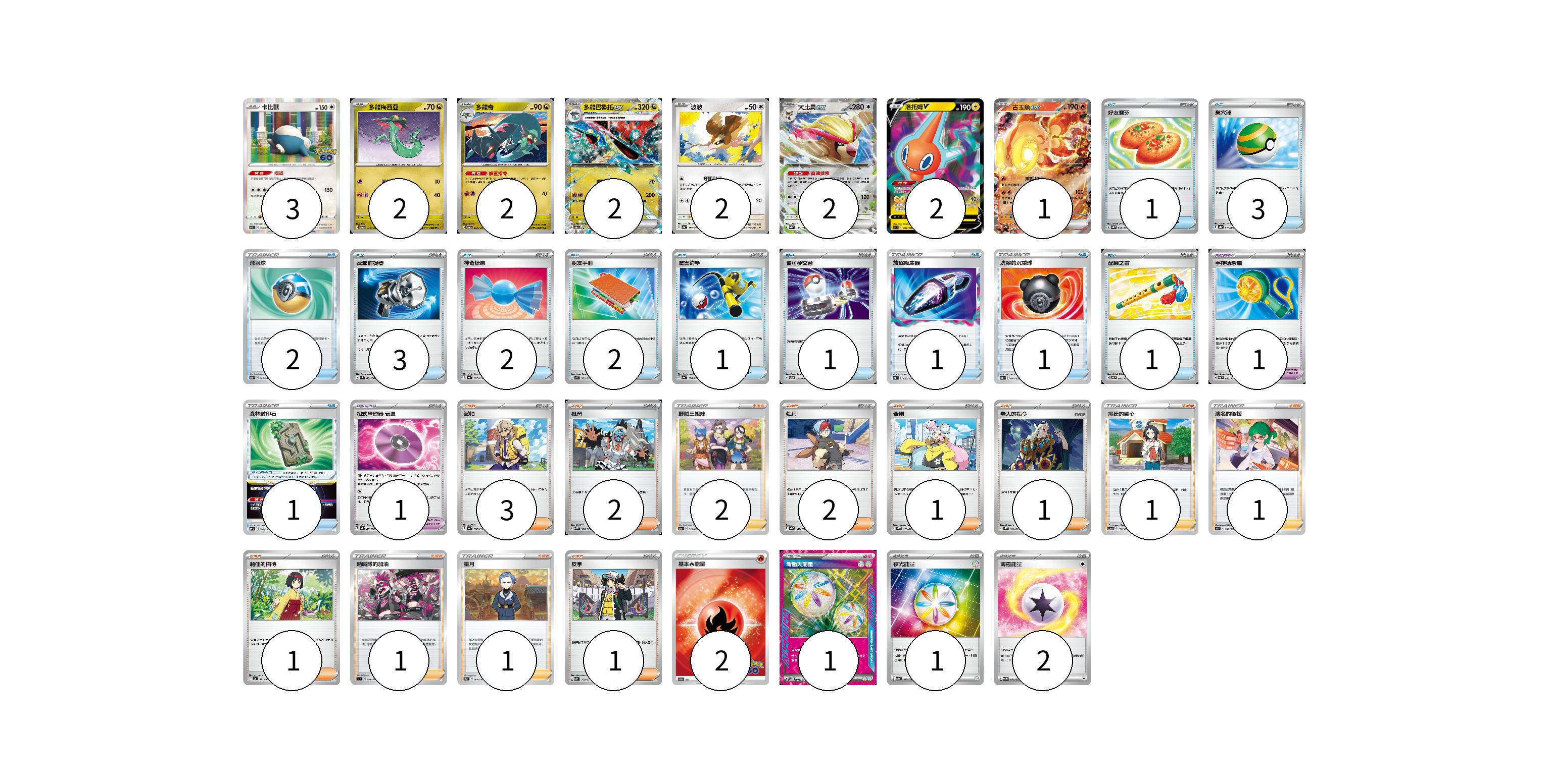牌組構築方案 以此牌組為基礎新構築牌組 顯示卡面 顯示列表 寶可夢卡(16) 3 2 2 2 2 2 2 1 寶可夢道具(2) 1 1 物品卡(19) 1 3 2 3 2 2 1 1 1 1 1 1 支援者卡(17) 3 2 2 2 1 1 1 1 1 1 1 1 能量卡(6) 2 1 1 2 寶可夢卡(16) 卡牌名稱 張數 卡牌名稱 張數 卡比獸 S10b 056/071 03 多龍梅西亞 SV6 079/101 02 多龍奇 SV6 080/101 02 多龍巴魯托ex SV6 081/101 02 波波 SV4a 137/190 02 大比鳥ex SV4a 139/190 02 洛托姆V S11 037/100 02 古玉魚ex SV2D 016/071 01 寶可夢道具(2) 卡牌名稱 張數 卡牌名稱 張數 手持循環扇 SV6 095/101 01 招式學習器 衰退 SV4K 063/066 01 物品卡(19) 卡牌名稱 張數 卡牌名稱 張數 好友寶芬 SV5K 063/071 01 巢穴球 SVHK 012/022 03 飛羽球 S10D 063/067 02 反擊捕捉器 SV4M 059/066 03 神奇糖果 SV4a 163/190 02 朋友手冊 SV1S 069/078 02 厲害釣竿 SV4a 158/190 01 寶可夢交替 SV5a 056/066 01 放逐吸塵器 SVF 023/038 01 洗翠的沉重球 SVB 014/028 01 配樂之笛 SV6 091/101 01 森林封印石 SVF 024/038 01 支援者卡(17) 卡牌名稱 張數 卡牌名稱 張數 派帕 SV4a 180/190 03 枇琶 SV5K 068/071 02 野賊三姐妹 S10a 070/071 02 牡丹 SV4a 182/190 02 奇樹 SVHK 019/022 01 老大的指令 SVHK 022/022 01 黑連的關心 S12a 156/172 01 濱名的後援 S9 096/100 01 莉佳的招待 SV2a 161/165 01 呐喊隊的加油 SI 388/414 01 星月 S9a 064/067 01 皮拿 SV2P 069/071 01 能量卡(6) 卡牌名稱 張數 卡牌名稱 張數 基本火能量 S10b FIR 02 新衝天能量 SV5K 071/071 01 夜光能量 SV4a 190/190 01 薄霧能量 SV5M 071/071 02 以此牌組為基礎新構築牌組 牌組編碼 ihMDxD-EftaXr-fDGmSV copy 列印牌組單 牌組編碼已複製 分享至SNS