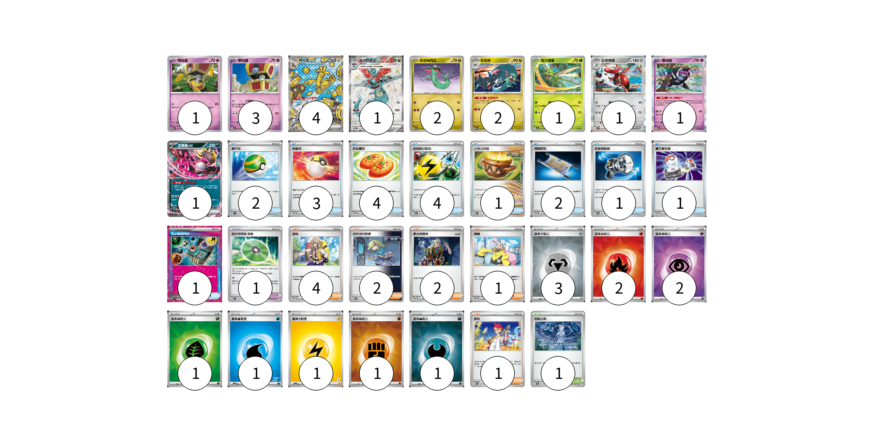 牌組構築方案 以此牌組為基礎新構築牌組 顯示卡面 顯示列表 寶可夢卡(17) 1 3 4 1 2 2 1 1 1 1 寶可夢道具(1) 1 物品卡(19) 2 3 4 4 1 2 1 1 1 支援者卡(10) 4 2 2 1 1 競技場卡(1) 1 能量卡(12) 3 2 2 1 1 1 1 1 寶可夢卡(17) 卡牌名稱 張數 卡牌名稱 張數 索財靈 SV8a 073/187 01 索財靈 SV7a 024/064 03 賽富豪ex SV8a 220/187 04 多龍巴魯托ex SV6 120/101 01 多龍梅西亞 SV8a 118/187 02 多龍奇 SV8a 119/187 02 飛天螳螂 SV2a 123/165 01 巨鉗螳螂 SV4a 129/190 01 願增猿 SV8a 075/187 01 吉雉雞ex SVOD 004/020 01 寶可夢道具(1) 卡牌名稱 張數 卡牌名稱 張數 招式學習器 演進 SV8a 160/187 01 物品卡(19) 卡牌名稱 張數 卡牌名稱 張數 巢穴球 SVM 133/175 02 高級球 SVOD 012/020 03 好友寶芬 SVOD 011/020 04 超級能量回收 SV8a 141/187 04 大地之容器 SV8a 143/187 01 夜間擔架 SVOM 016/021 02 反擊捕捉器 SV8a 139/187 01 寶可夢交替 SVOD 014/020 01 能量輸送PRO SV7a 052/064 01 支援者卡(10) 卡牌名稱 張數 卡牌名稱 張數 派帕 SVOD 018/020 04 暗碼迷的解讀 SV8a 165/187 02 老大的指令 SVOD 019/020 02 奇樹 SVOD 016/020 01 赤松 SV8a 163/187 01 競技場卡(1) 卡牌名稱 張數 卡牌名稱 張數 阻礙之塔 SV8a 181/187 01 能量卡(12) 卡牌名稱 張數 卡牌名稱 張數 基本【鋼】能量 SVOD MET 03 基本【火】能量 SVK FIR 02 基本【超】能量 SVOD PSY 02 基本【草】能量 SVK GRA 01 基本【水】能量 SVI WAT 01 基本【雷】能量 SVI LIG 01 基本【鬥】能量 SVK FIG 01 基本【惡】能量 SVOM DAR 01 以此牌組為基礎新構築牌組 牌組編碼 ihSLBl-OwpiQx-uOxfTh copy 列印牌組單 牌組編碼已複製 分享至SNS