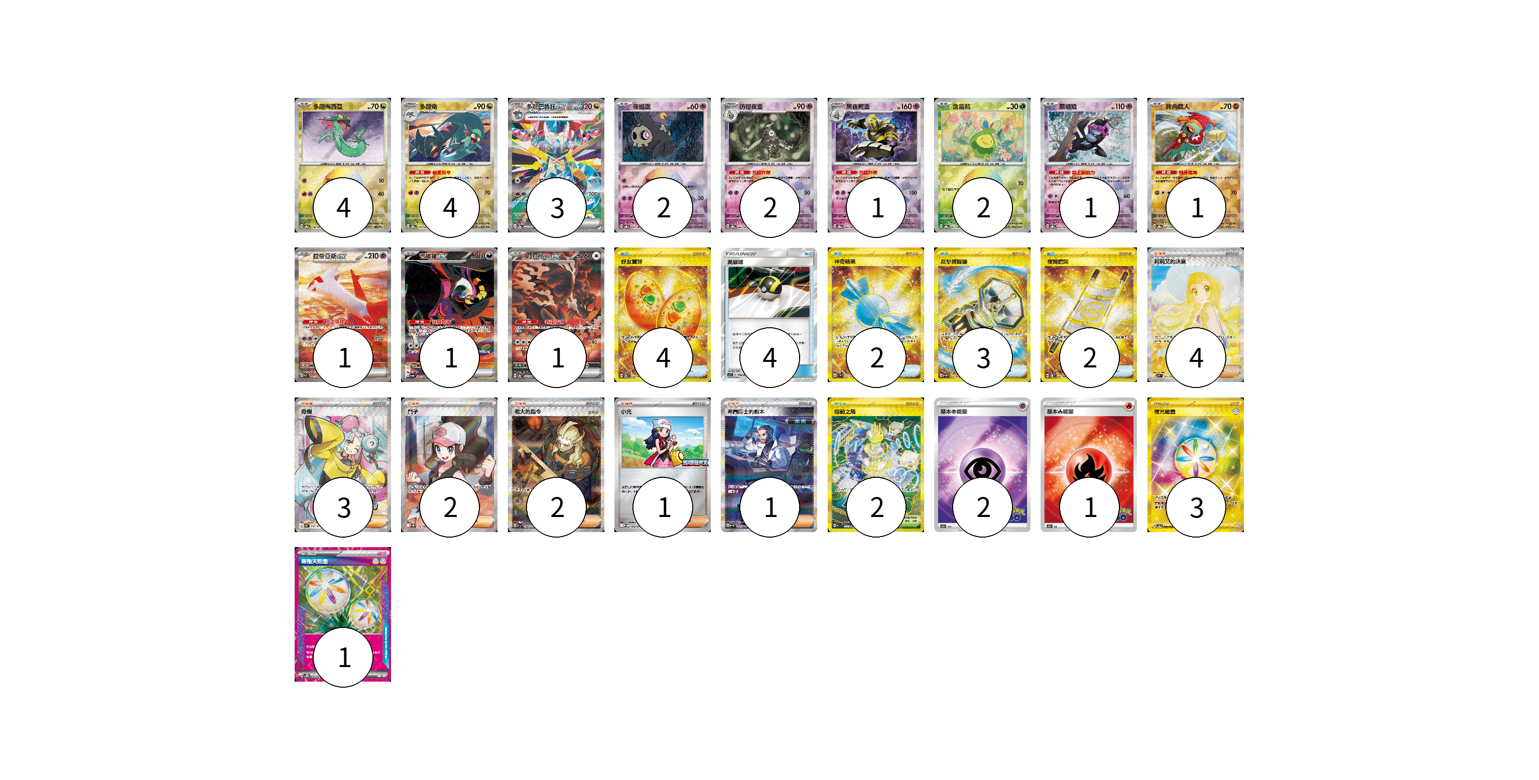 牌組構築方案 以此牌組為基礎新構築牌組 顯示卡面 顯示列表 寶可夢卡(23) 4 4 3 2 2 1 2 1 1 1 1 1 物品卡(15) 4 4 2 3 2 支援者卡(13) 4 3 2 2 1 1 競技場卡(2) 2 能量卡(7) 2 1 3 1 寶可夢卡(23) 卡牌名稱 張數 卡牌名稱 張數 多龍梅西亞 SV8a 118/187 04 多龍奇 SV8a 119/187 04 多龍巴魯托ex SV8a 221/187 03 夜巡靈 SV8a 064/187 02 彷徨夜靈 SV8a 065/187 02 黑夜魔靈 SV8a 066/187 01 含羞苞 SV8a 001/187 02 願增猿 SV8a 075/187 01 摔角鷹人 SV8a 084/187 01 拉帝亞斯ex SV7a 087/064 01 吉雉雞ex SV6a 089/064 01 月月熊 赫月ex SV8a 225/187 01 物品卡(15) 卡牌名稱 張數 卡牌名稱 張數 好友寶芬 SV6 133/101 04 高級球 AS5b 178/186 04 神奇糖果 SV1V 107/078 02 反擊捕捉器 SV4M 094/066 03 夜間擔架 SV8 137/106 02 支援者卡(13) 卡牌名稱 張數 卡牌名稱 張數 莉莉艾的決意 M1L 091/063 04 奇樹 SV2D 091/071 03 鬥子 SV11W 166/086 02 老大的指令(魁奇思) SV1a 100/073 02 小光 M-P 028/M-P 01 弗圖博士的劇本 SV4M 091/066 01 競技場卡(2) 卡牌名稱 張數 卡牌名稱 張數 阻礙之塔 SV10 132/098 02 能量卡(7) 卡牌名稱 張數 卡牌名稱 張數 基本超能量 S10b PSY 02 基本火能量 S10b FIR 01 夜光能量 SV5a 096/066 03 新衝天能量 SV5K 071/071 01 以此牌組為基礎新構築牌組 牌組編碼 iisCcj-vWNbYI-HtthTR copy 列印牌組單 牌組編碼已複製 分享至SNS