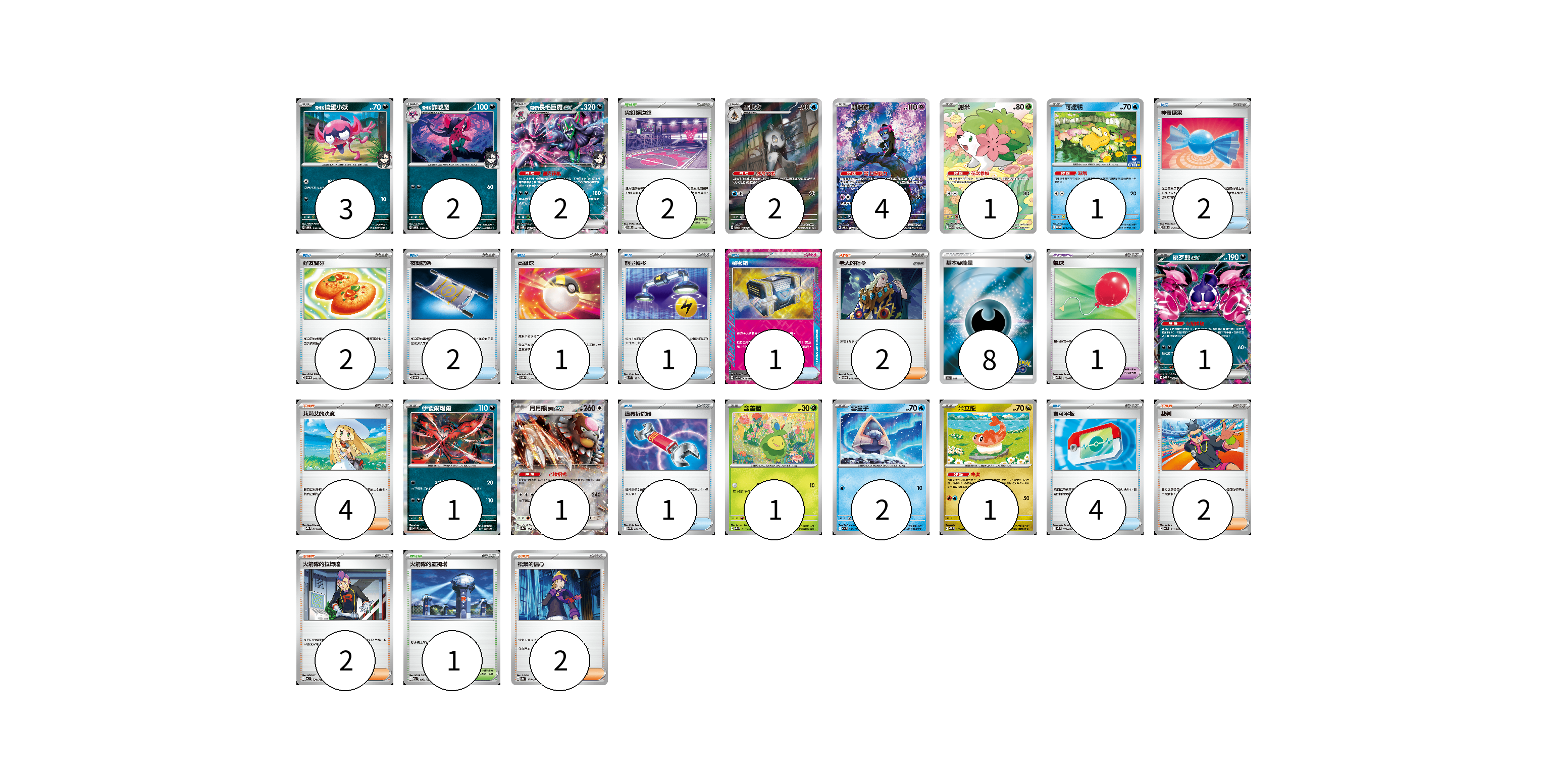 牌組構築方案 以此牌組為基礎新構築牌組 顯示卡面 顯示列表 寶可夢卡(22) 3 2 2 2 4 1 1 1 1 1 1 2 1 寶可夢道具(1) 1 物品卡(14) 2 2 2 1 1 1 1 4 支援者卡(12) 2 4 2 2 2 競技場卡(3) 2 1 能量卡(8) 8 寶可夢卡(22) 卡牌名稱 張數 卡牌名稱 張數 <瑪俐的>搗蛋小妖 SVOM 005/021 03 <瑪俐的>詐唬魔 SVOM 006/021 02 <瑪俐的>長毛巨魔ex SVOM 007/021 02 雪妖女 SV6 104/101 02 願增猿 SV6 107/101 04 謝米 SV9a 066/063 01 可達鴨 SV-P 220/SV-P 01 桃歹郎ex MBG 009/022 01 伊裴爾塔爾 M1L 040/063 01 月月熊 赫月ex SV8a 134/187 01 含羞苞 M2a 011/193 01 雪童子 M2a 035/193 02 米立龍 MBD 010/022 01 寶可夢道具(1) 卡牌名稱 張數 卡牌名稱 張數 氣球 MBD 018/022 01 物品卡(14) 卡牌名稱 張數 卡牌名稱 張數 神奇糖果 SVOM 014/021 02 好友寶芬 SVOM 012/021 02 夜間擔架 SVOM 016/021 02 高級球 SVOM 013/021 01 能量轉移 SVM 127/175 01 秘密箱 SV6 092/101 01 道具拆除器 SV11W 080/086 01 寶可平板 M3 070/080 04 支援者卡(12) 卡牌名稱 張數 卡牌名稱 張數 老大的指令 SVOD 019/020 02 莉莉艾的決意 MBG 022/022 04 裁判 MC 711/742 02 火箭隊的拉姆達 MC 734/742 02 松葉的信心 SV8a 178/187 02 競技場卡(3) 卡牌名稱 張數 卡牌名稱 張數 尖釘鎮道館 SVOM 021/021 02 火箭隊的監視塔 M2a 189/193 01 能量卡(8) 卡牌名稱 張數 卡牌名稱 張數 基本惡能量 S10b DAR 08 以此牌組為基礎新構築牌組 牌組編碼 ijoEtq-ZiiJal-EMxEYh copy 列印牌組單 牌組編碼已複製 分享至SNS