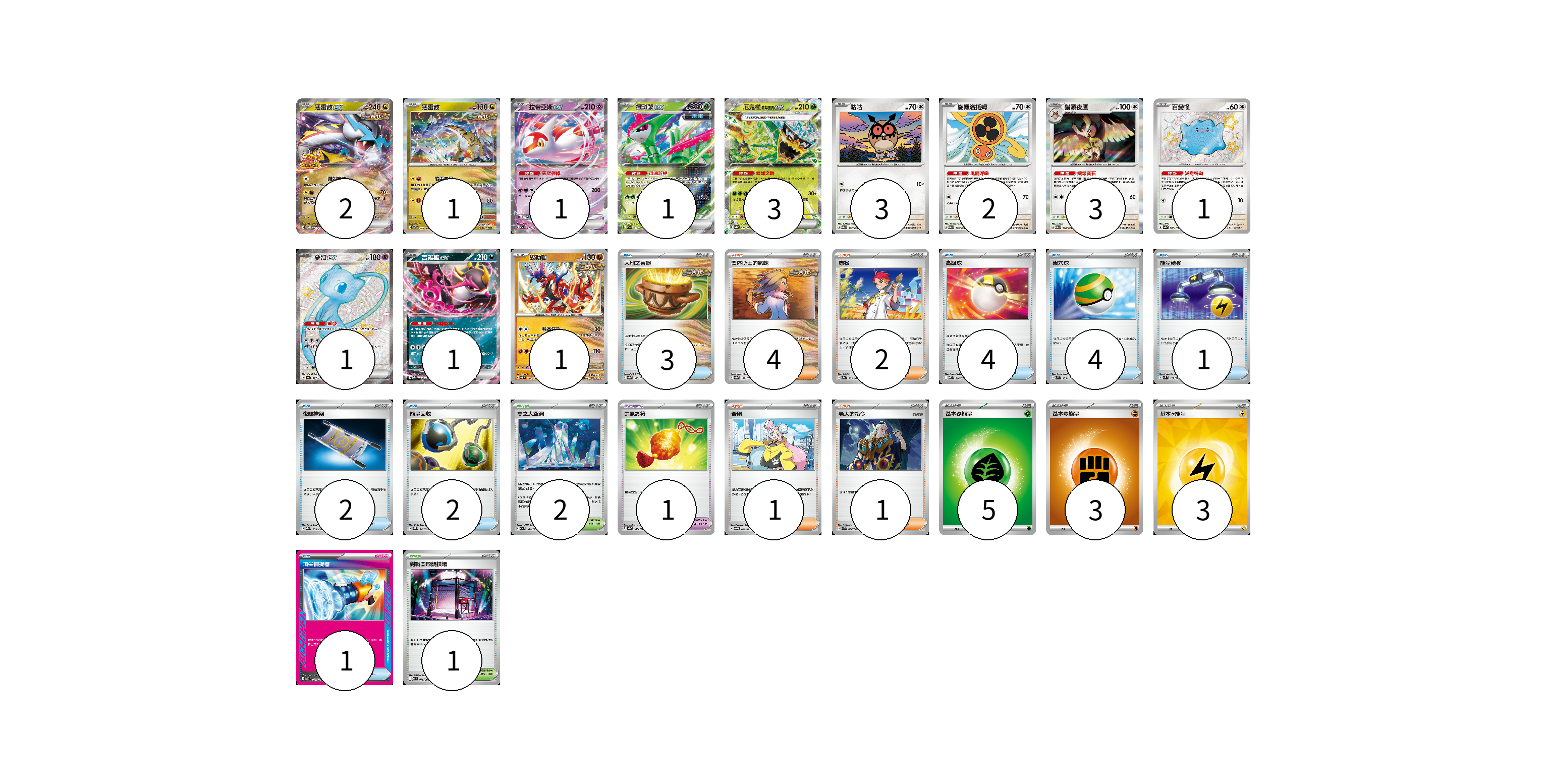 牌組構築方案 以此牌組為基礎新構築牌組 顯示卡面 顯示列表 寶可夢卡(20) 2 1 1 1 3 3 2 3 1 1 1 1 寶可夢道具(1) 1 物品卡(17) 3 4 4 1 2 2 1 支援者卡(8) 4 2 1 1 競技場卡(3) 2 1 能量卡(11) 5 3 3 寶可夢卡(20) 卡牌名稱 張數 卡牌名稱 張數 猛雷鼓ex SV-P 081/SV-P 02 猛雷鼓 SV7 075/102 01 拉帝亞斯ex M2a 075/193 01 鐵斑葉ex SV5M 016/071 01 厄鬼椪 碧草面具ex SV8a 020/187 03 咕咕 M2a 137/193 03 旋轉洛托姆 M2a 139/193 02 貓頭夜鷹 M2a 138/193 03 百變怪 SV4a 309/190 01 夢幻ex SV4a 327/190 01 吉雉雞ex M2a 114/193 01 故勒頓 SV8 069/106 01 寶可夢道具(1) 卡牌名稱 張數 卡牌名稱 張數 勇氣護符 SV4a 169/190 01 物品卡(17) 卡牌名稱 張數 卡牌名稱 張數 大地之容器 SV8a 143/187 03 高級球 MBD 014/022 04 巢穴球 SVM 133/175 04 能量轉移 SVM 127/175 01 夜間擔架 M2a 159/193 02 能量回收 SVQL 012/022 02 頂尖捕捉器 MBG 014/022 01 支援者卡(8) 卡牌名稱 張數 卡牌名稱 張數 奧琳博士的氣魄 SV8a 167/187 04 赤松 SV8a 163/187 02 奇樹 SVOM 018/021 01 老大的指令 SVK 036/042 01 競技場卡(3) 卡牌名稱 張數 卡牌名稱 張數 零之大空洞 M2a 184/193 02 對戰圓形競技場 M2 079/080 01 能量卡(11) 卡牌名稱 張數 卡牌名稱 張數 基本【草】能量 M-P GRA 05 基本【鬥】能量 M-P FIG 03 基本【雷】能量 SVQP LIG 03 以此牌組為基礎新構築牌組 牌組編碼 ikBGOx-ycZrJG-pGSKGq copy 列印牌組單 牌組編碼已複製 分享至SNS