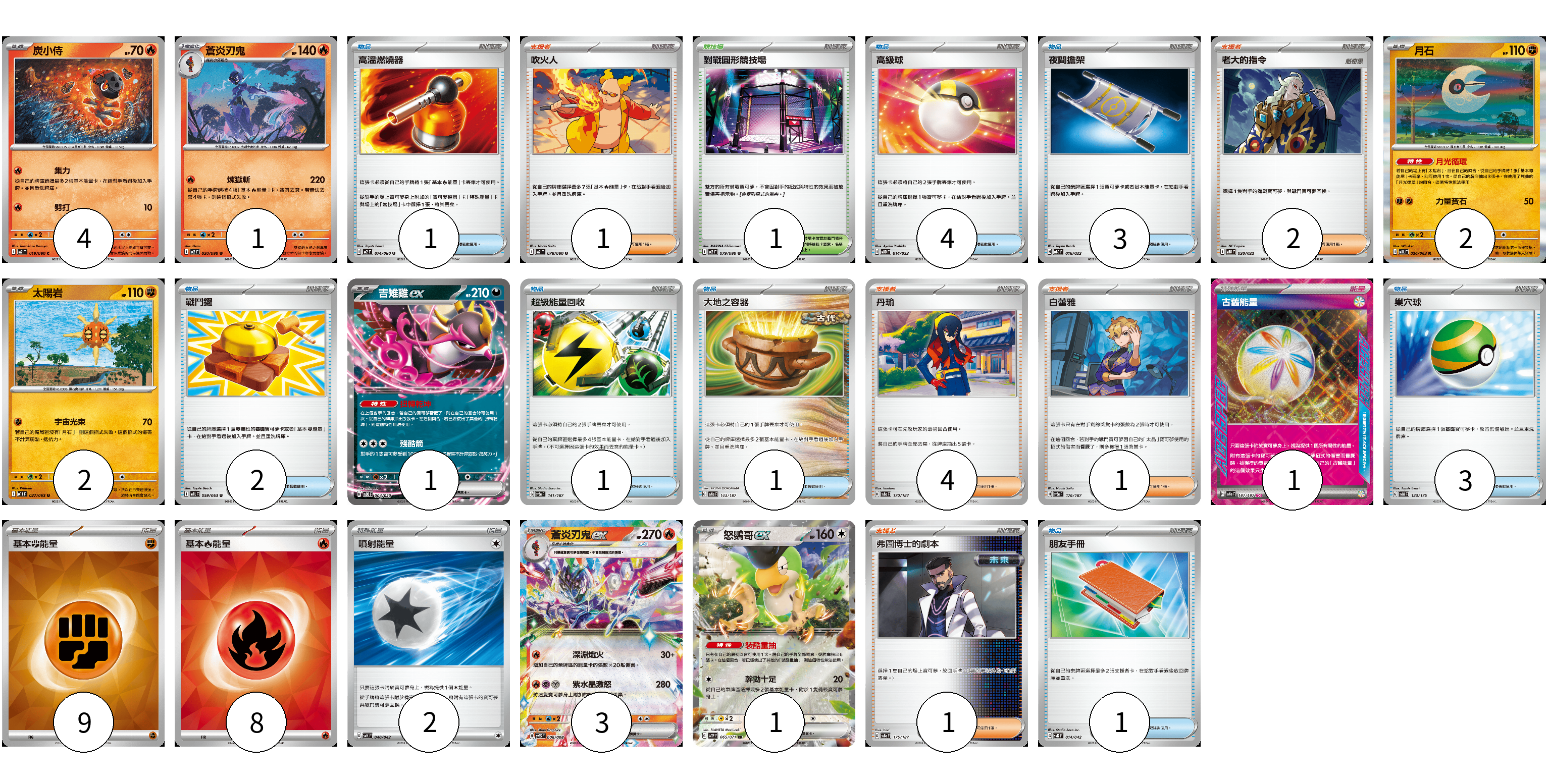 牌組構築方案 以此牌組為基礎新構築牌組 顯示卡面 顯示列表 寶可夢卡(14) 4 1 2 2 1 3 1 物品卡(16) 1 4 3 2 1 1 3 1 支援者卡(9) 1 2 4 1 1 競技場卡(1) 1 能量卡(20) 1 9 8 2 寶可夢卡(14) 卡牌名稱 張數 卡牌名稱 張數 炭小侍 M2 019/080 04 蒼炎刃鬼 M2 020/080 01 月石 M1L 026/063 02 太陽岩 M1L 027/063 02 吉雉雞ex SVOD 004/020 01 蒼炎刃鬼ex SVPS 006/008 03 怒鸚哥ex SV2P 065/071 01 物品卡(16) 卡牌名稱 張數 卡牌名稱 張數 高溫燃燒器 M2 074/080 01 高級球 MBD 014/022 04 夜間擔架 MBD 016/022 03 戰鬥鑼 M1L 059/063 02 超級能量回收 SV8a 141/187 01 大地之容器 SV8a 143/187 01 巢穴球 SVM 133/175 03 朋友手冊 SVK 014/042 01 支援者卡(9) 卡牌名稱 張數 卡牌名稱 張數 吹火人 M2 078/080 01 老大的指令 MBD 020/022 02 丹瑜 SV8a 170/187 04 白蕾雅 SV8a 176/187 01 弗圖博士的劇本 SV8a 175/187 01 競技場卡(1) 卡牌名稱 張數 卡牌名稱 張數 對戰圓形競技場 M2 079/080 01 能量卡(20) 卡牌名稱 張數 卡牌名稱 張數 古舊能量 SV8a 187/187 01 基本【鬥】能量 SVM FIG 09 基本【火】能量 SVM FIR 08 噴射能量 SVK 040/042 02 以此牌組為基礎新構築牌組 牌組編碼 imNYcz-Zrylvi-isFRwT copy 列印牌組單 牌組編碼已複製 分享至SNS