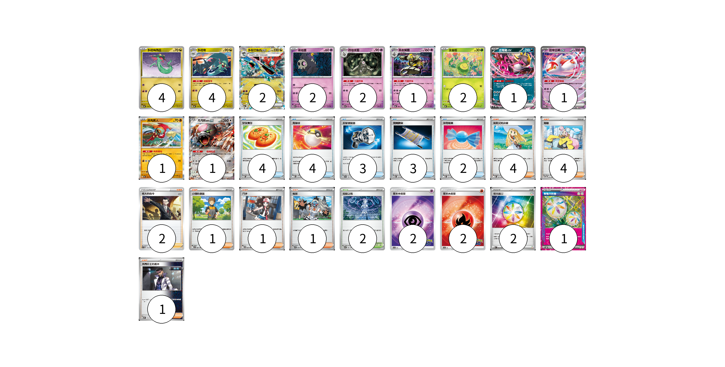 牌組構築方案 以此牌組為基礎新構築牌組 顯示卡面 顯示列表 寶可夢卡(21) 4 4 2 2 2 1 2 1 1 1 1 物品卡(16) 4 4 3 3 2 支援者卡(14) 4 4 2 1 1 1 1 競技場卡(2) 2 能量卡(7) 2 2 2 1 寶可夢卡(21) 卡牌名稱 張數 卡牌名稱 張數 多龍梅西亞 SV8a 118/187 04 多龍奇 SV8a 119/187 04 多龍巴魯托ex SV8a 120/187 02 夜巡靈 SV8a 064/187 02 彷徨夜靈 SV8a 065/187 02 黑夜魔靈 SV8a 066/187 01 含羞苞 SV8a 001/187 02 吉雉雞ex SVOD 004/020 01 拉帝亞斯ex MBD 003/022 01 摔角鷹人 SV8a 084/187 01 月月熊 赫月 ex SV5a 052/066 01 物品卡(16) 卡牌名稱 張數 卡牌名稱 張數 好友寶芬 MBD 013/022 04 高級球 MBG 012/022 04 反擊捕捉器 SV8a 139/187 03 夜間擔架 MBD 016/022 03 神奇糖果 MBG 013/022 02 支援者卡(14) 卡牌名稱 張數 卡牌名稱 張數 莉莉艾的決意 MBD 021/022 04 奇樹 SVOD 016/020 04 老大的指令(坂木) SCB 140/156 02 小剛的發掘 SV9 096/100 01 鬥子 SV11W 085/086 01 枇琶 SV5K 068/071 01 弗圖博士的劇本 SV8a 175/187 01 競技場卡(2) 卡牌名稱 張數 卡牌名稱 張數 阻礙之塔 SV8a 181/187 02 能量卡(7) 卡牌名稱 張數 卡牌名稱 張數 基本超能量 S10b PSY 02 基本火能量 S10b FIR 02 夜光能量 SVK 042/042 02 新衝天能量 SV5K 071/071 01 以此牌組為基礎新構築牌組 牌組編碼 inApzC-rjwNLC-AaKsPB copy 列印牌組單 牌組編碼已複製 分享至SNS