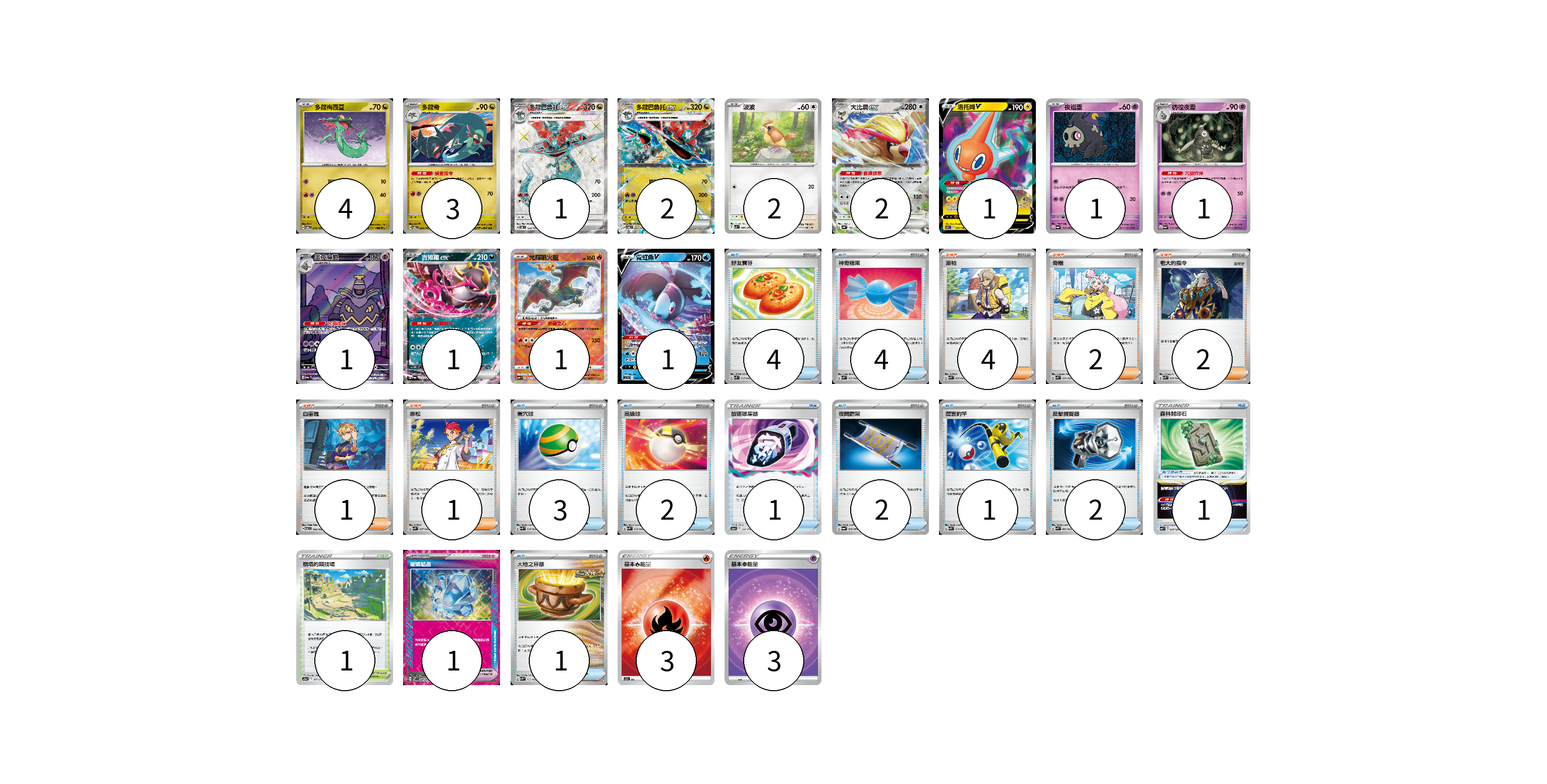 牌組構築方案 以此牌組為基礎新構築牌組 顯示卡面 顯示列表 寶可夢卡(21) 4 3 1 2 2 2 1 1 1 1 1 1 1 寶可夢道具(1) 1 物品卡(21) 4 4 3 2 1 2 1 2 1 1 支援者卡(10) 4 2 2 1 1 競技場卡(1) 1 能量卡(6) 3 3 寶可夢卡(21) 卡牌名稱 張數 卡牌名稱 張數 多龍梅西亞 SV6 079/101 04 多龍奇 SV6 080/101 03 多龍巴魯托ex SV6 120/101 01 多龍巴魯托ex SV6 081/101 02 波波 SV3 087/108 02 大比鳥ex SV4a 139/190 02 洛托姆V S11 037/100 01 夜巡靈 SV6a 018/064 01 彷徨夜靈 SV6a 019/064 01 黑夜魔靈 SV6a 070/064 01 吉雉雞ex SV6a 038/064 01 光輝噴火龍 SVF 001/038 01 霓虹魚V SVHK 004/022 01 寶可夢道具(1) 卡牌名稱 張數 卡牌名稱 張數 璀璨結晶 SV7 094/102 01 物品卡(21) 卡牌名稱 張數 卡牌名稱 張數 好友寶芬 SVK 015/042 04 神奇糖果 SVK 019/042 04 巢穴球 SVK 016/042 03 高級球 SVK 018/042 02 放逐吸塵器 S12a 144/172 01 夜間擔架 SV6a 056/064 02 厲害釣竿 SVK 011/042 01 反擊捕捉器 SVK 009/042 02 森林封印石 SVF 024/038 01 大地之容器 SVK 012/042 01 支援者卡(10) 卡牌名稱 張數 卡牌名稱 張數 派帕 SVK 035/042 04 奇樹 SVK 031/042 02 老大的指令 SVK 036/042 02 白蕾雅 SV7 100/102 01 赤松 SVK 027/042 01 競技場卡(1) 卡牌名稱 張數 卡牌名稱 張數 崩塌的競技場 S12a 167/172 01 能量卡(6) 卡牌名稱 張數 卡牌名稱 張數 基本【火】能量 SO FIR 03 基本【超】能量 SI PSY 03 以此牌組為基礎新構築牌組 牌組編碼 invTqu-xdaaao-gWLsGF copy 列印牌組單 牌組編碼已複製 分享至SNS