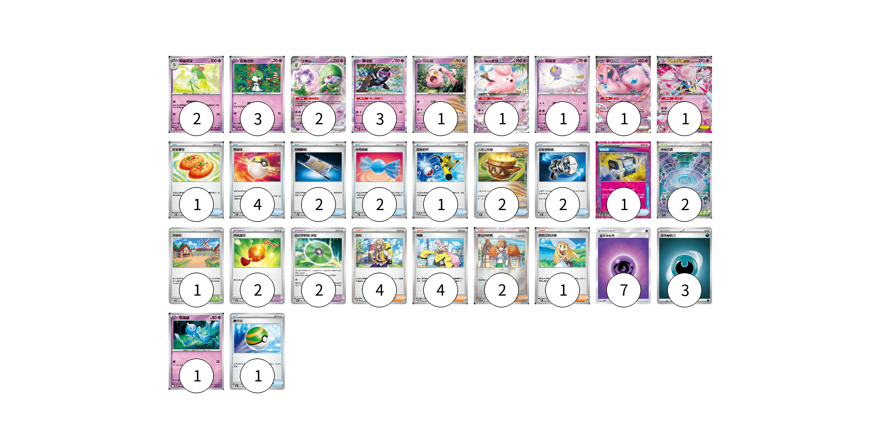 牌組構築方案 以此牌組為基礎新構築牌組 顯示卡面 顯示列表 寶可夢卡(16) 2 3 2 3 1 1 1 1 1 1 寶可夢道具(4) 2 2 物品卡(16) 1 4 2 2 1 2 2 1 1 支援者卡(11) 4 4 2 1 競技場卡(3) 2 1 能量卡(10) 7 3 寶可夢卡(16) 卡牌名稱 張數 卡牌名稱 張數 奇魯莉安 M1S 041/063 02 拉魯拉絲 M1S 040/063 03 沙奈朵ex SV1S 028/078 02 願增猿 SV8a 075/187 03 吼叫尾 SVTS 007/022 01 莉莉艾的皮皮ex SV9 033/100 01 飄飄球 SV4a 083/190 01 夢幻ex SVK 001/042 01 超級蒂安希ex MBD 006/022 01 輕飄飄 SV11W 041/086 01 寶可夢道具(4) 卡牌名稱 張數 卡牌名稱 張數 勇氣護符 SVTR 015/021 02 招式學習器 演進 SV8a 160/187 02 物品卡(16) 卡牌名稱 張數 卡牌名稱 張數 好友寶芬 MBD 013/022 01 高級球 MBD 014/022 04 夜間擔架 MBD 016/022 02 神奇糖果 MBG 013/022 02 厲害釣竿 SVOD 010/020 01 大地之容器 SV8a 143/187 02 反擊捕捉器 SV8a 139/187 02 秘密箱 SV6 092/101 01 巢穴球 SVHK 012/022 01 支援者卡(11) 卡牌名稱 張數 卡牌名稱 張數 派帕 SVOD 018/020 04 奇樹 SVOM 018/021 04 博士的研究 SV11B 084/086 02 莉莉艾的決意 MBD 021/022 01 競技場卡(3) 卡牌名稱 張數 卡牌名稱 張數 神秘花園 M1S 086/063 02 深缽鎮 SVF 036/038 01 能量卡(10) 卡牌名稱 張數 卡牌名稱 張數 基本超能量 AS6D PSY 07 基本惡能量 sv-p DAR 03 以此牌組為基礎新構築牌組 牌組編碼 ioGcaC-bIINwi-tIkLMK copy 列印牌組單 牌組編碼已複製 分享至SNS