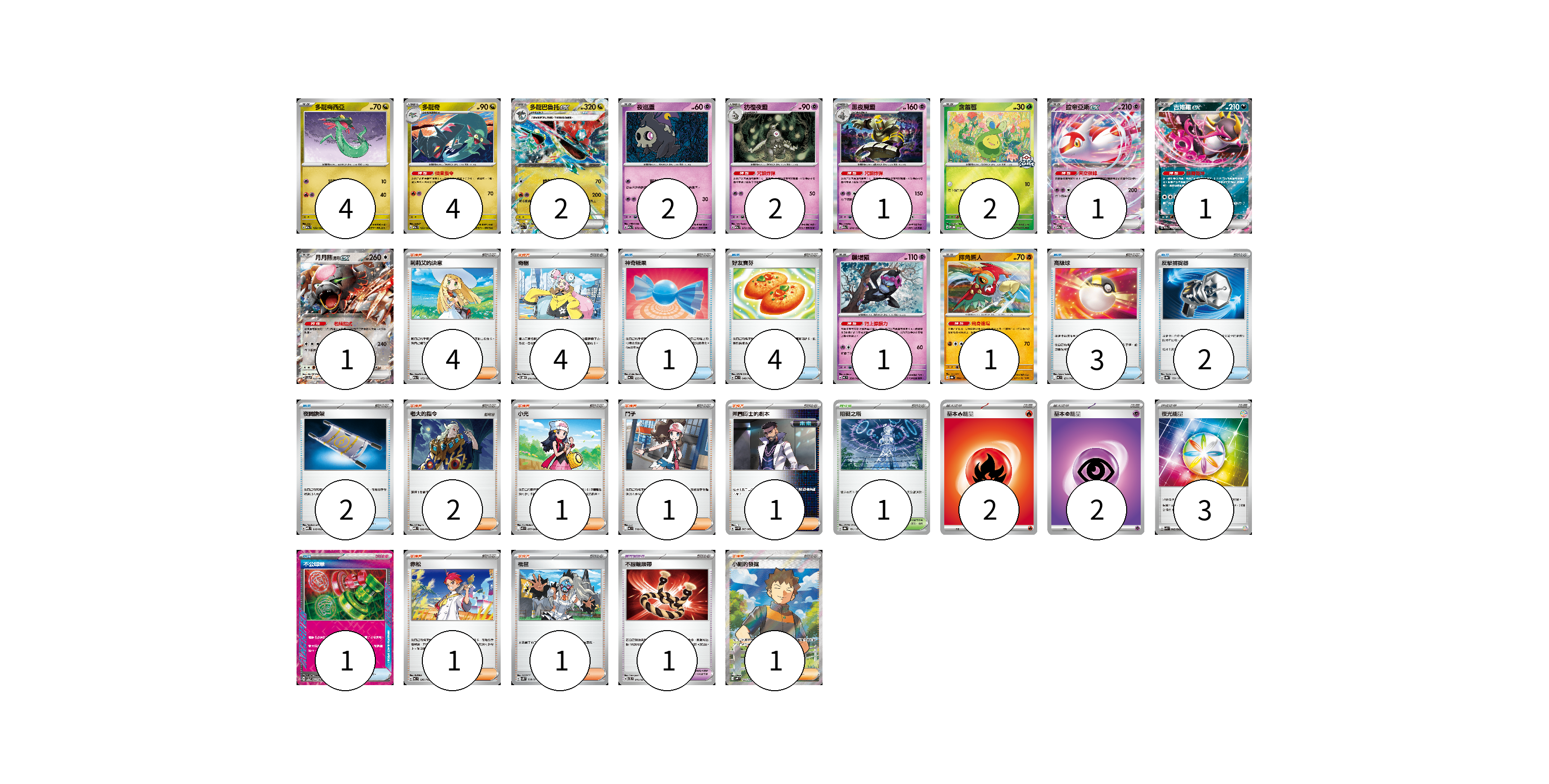 牌組構築方案 以此牌組為基礎新構築牌組 顯示卡面 顯示列表 寶可夢卡(22) 4 4 2 2 2 1 2 1 1 1 1 1 寶可夢道具(1) 1 物品卡(13) 1 4 3 2 2 1 支援者卡(16) 4 4 2 1 1 1 1 1 1 競技場卡(1) 1 能量卡(7) 2 2 3 寶可夢卡(22) 卡牌名稱 張數 卡牌名稱 張數 多龍梅西亞 M2a 132/193 04 多龍奇 M2a 133/193 04 多龍巴魯托ex M2a 134/193 02 夜巡靈 M2a 072/193 02 彷徨夜靈 M2a 073/193 02 黑夜魔靈 M2a 074/193 01 含羞苞 M-P 037/M-P 02 拉帝亞斯ex M2a 075/193 01 吉雉雞ex M2a 114/193 01 月月熊 赫月 ex SV5a 052/066 01 願增猿 MC 358/742 01 摔角鷹人 SV8a 084/187 01 寶可夢道具(1) 卡牌名稱 張數 卡牌名稱 張數 不服輸頭帶 SVTL 016/021 01 物品卡(13) 卡牌名稱 張數 卡牌名稱 張數 神奇糖果 MC 655/742 01 好友寶芬 MC 648/742 04 高級球 MC 651/742 03 反擊捕捉器 SV8a 139/187 02 夜間擔架 MBD 016/022 02 不公印章 SV5a 053/066 01 支援者卡(16) 卡牌名稱 張數 卡牌名稱 張數 莉莉艾的決意 M2a 175/193 04 奇樹 SVOD 016/020 04 老大的指令 MBD 020/022 02 小光 M2 077/080 01 鬥子 MC 718/742 01 弗圖博士的劇本 SV4M 065/066 01 赤松 MC 696/742 01 枇琶 SV5K 068/071 01 小剛的發掘 SV9 123/100 01 競技場卡(1) 卡牌名稱 張數 卡牌名稱 張數 阻礙之塔 SV8a 181/187 01 能量卡(7) 卡牌名稱 張數 卡牌名稱 張數 基本火能量 sv-p FIR 02 基本超能量 sv-p PSY 02 夜光能量 SVK 042/042 03 以此牌組為基礎新構築牌組 牌組編碼 ipEzDZ-hvbJcp-PvYfUq copy 列印牌組單 牌組編碼已複製 分享至SNS