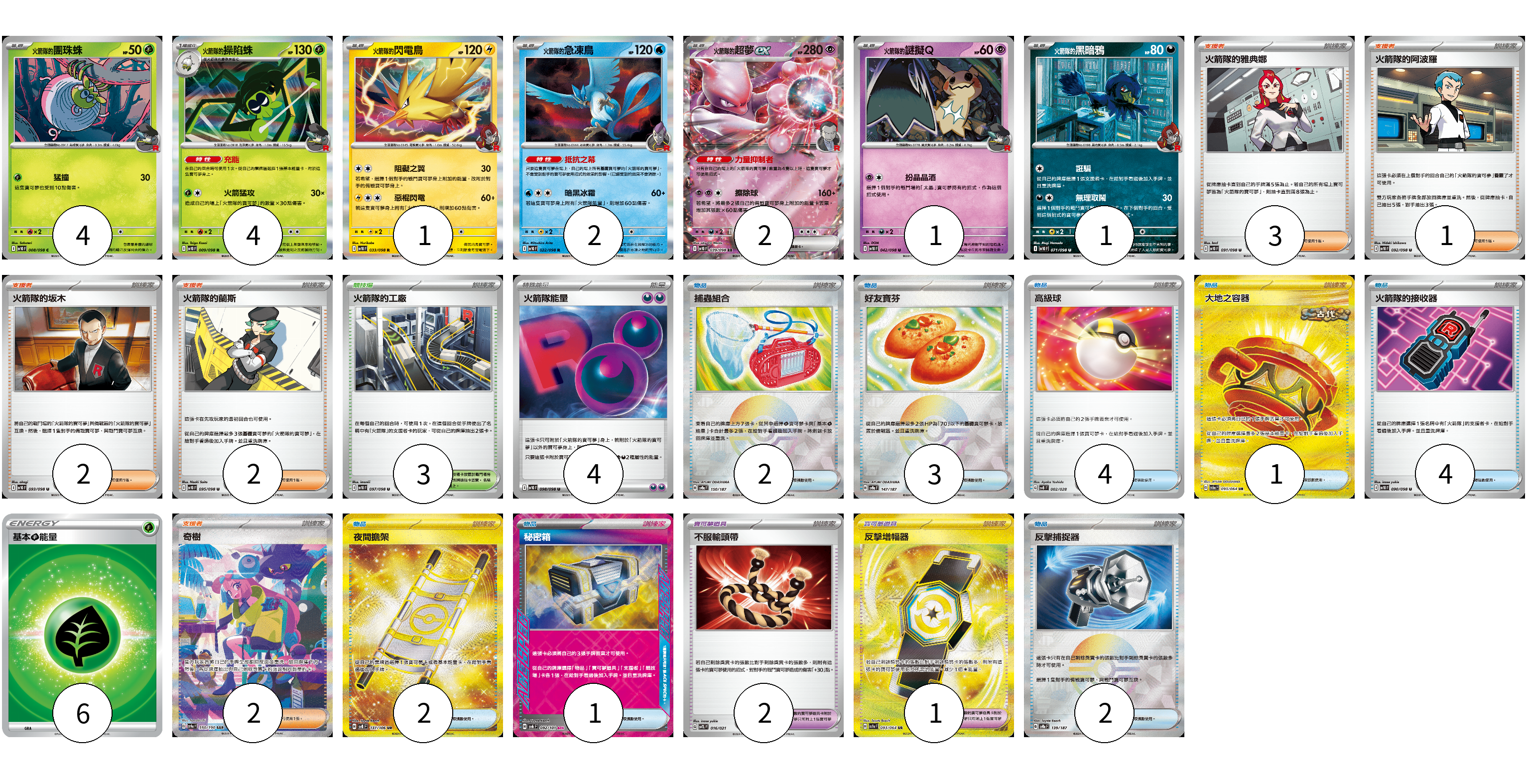 牌組構築方案 以此牌組為基礎新構築牌組 顯示卡面 顯示列表 寶可夢卡(15) 4 4 1 2 2 1 1 寶可夢道具(3) 2 1 物品卡(19) 2 3 4 1 4 2 1 2 支援者卡(10) 3 1 2 2 2 競技場卡(3) 3 能量卡(10) 4 6 寶可夢卡(15) 卡牌名稱 張數 卡牌名稱 張數 <火箭隊的>團珠蛛 SV10 008/098 04 <火箭隊的>操陷蛛 SV10 009/098 04 <火箭隊的>閃電鳥 SV10 033/098 01 <火箭隊的>急凍鳥 SV10 022/098 02 <火箭隊的>超夢ex SV10 039/098 02 <火箭隊的>謎擬Q SV10 042/098 01 <火箭隊的>黑暗鴉 SV10 071/098 01 寶可夢道具(3) 卡牌名稱 張數 卡牌名稱 張數 不服輸頭帶 SVTL 016/021 02 反擊增幅器 SV7a 093/064 01 物品卡(19) 卡牌名稱 張數 卡牌名稱 張數 捕蟲組合 SV8a 150/187 02 好友寶芬 SV8a 147/187 03 高級球 SVB 002/028 04 大地之容器 SV6a 093/064 01 火箭隊的接收器 SV10 090/098 04 夜間擔架 SV8 137/106 02 秘密箱 SV6 092/101 01 反擊捕捉器 SV8a 139/187 02 支援者卡(10) 卡牌名稱 張數 卡牌名稱 張數 火箭隊的雅典娜 SV10 091/098 03 火箭隊的阿波羅 SV10 092/098 01 火箭隊的坂木 SV10 093/098 02 火箭隊的蘭斯 SV10 095/098 02 奇樹 SV4a 350/190 02 競技場卡(3) 卡牌名稱 張數 卡牌名稱 張數 火箭隊的工廠 SV10 097/098 03 能量卡(10) 卡牌名稱 張數 卡牌名稱 張數 火箭隊能量 SV10 098/098 04 基本【草】能量 SI GRA 06 以此牌組為基礎新構築牌組 牌組編碼 ipOEKX-mHKloK-ZmHewc copy 列印牌組單 牌組編碼已複製 分享至SNS