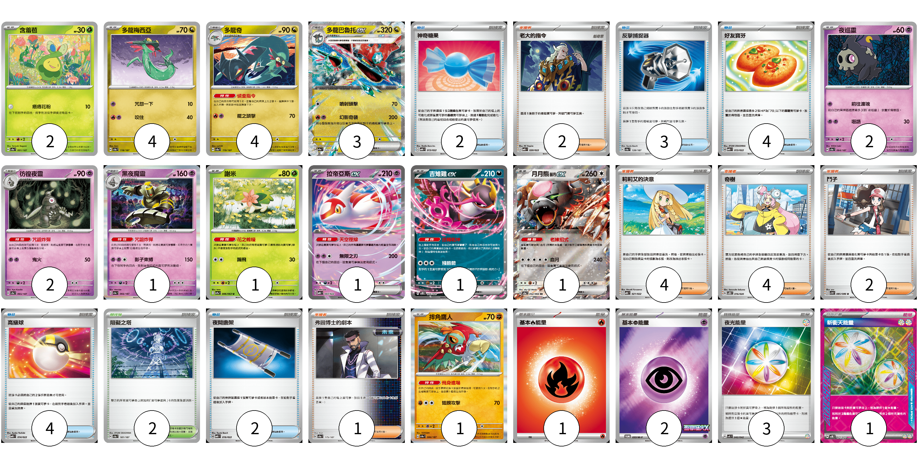牌組構築方案 以此牌組為基礎新構築牌組 顯示卡面 顯示列表 寶可夢卡(23) 2 4 4 3 2 2 1 1 1 1 1 1 物品卡(15) 2 3 4 4 2 支援者卡(13) 2 4 4 2 1 競技場卡(2) 2 能量卡(7) 1 2 3 1 寶可夢卡(23) 卡牌名稱 張數 卡牌名稱 張數 含羞苞 SV8a 001/187 02 多龍梅西亞 SV8a 118/187 04 多龍奇 SV8a 119/187 04 多龍巴魯托ex SV8a 120/187 03 夜巡靈 SV8a 064/187 02 彷徨夜靈 SV8a 065/187 02 黑夜魔靈 SV8a 066/187 01 謝米 SV9a 006/063 01 拉帝亞斯ex MBD 003/022 01 吉雉雞ex SVOD 004/020 01 月月熊 赫月 ex SV5a 052/066 01 摔角鷹人 SV8a 084/187 01 物品卡(15) 卡牌名稱 張數 卡牌名稱 張數 神奇糖果 MBG 013/022 02 反擊捕捉器 SV8a 139/187 03 好友寶芬 MBD 013/022 04 高級球 MBD 014/022 04 夜間擔架 MBD 016/022 02 支援者卡(13) 卡牌名稱 張數 卡牌名稱 張數 老大的指令 MBD 020/022 02 莉莉艾的決意 MBD 021/022 04 奇樹 SVOD 016/020 04 鬥子 SV11W 085/086 02 弗圖博士的劇本 SV8a 175/187 01 競技場卡(2) 卡牌名稱 張數 卡牌名稱 張數 阻礙之塔 SV8a 181/187 02 能量卡(7) 卡牌名稱 張數 卡牌名稱 張數 基本【火】能量 M-P FIR 01 基本【超】能量 M-P 033/M-P 02 夜光能量 SVK 042/042 03 新衝天能量 SV5K 071/071 01 以此牌組為基礎新構築牌組 牌組編碼 ipjpJd-XEJxjL-XWyUwe copy 列印牌組單 牌組編碼已複製 分享至SNS