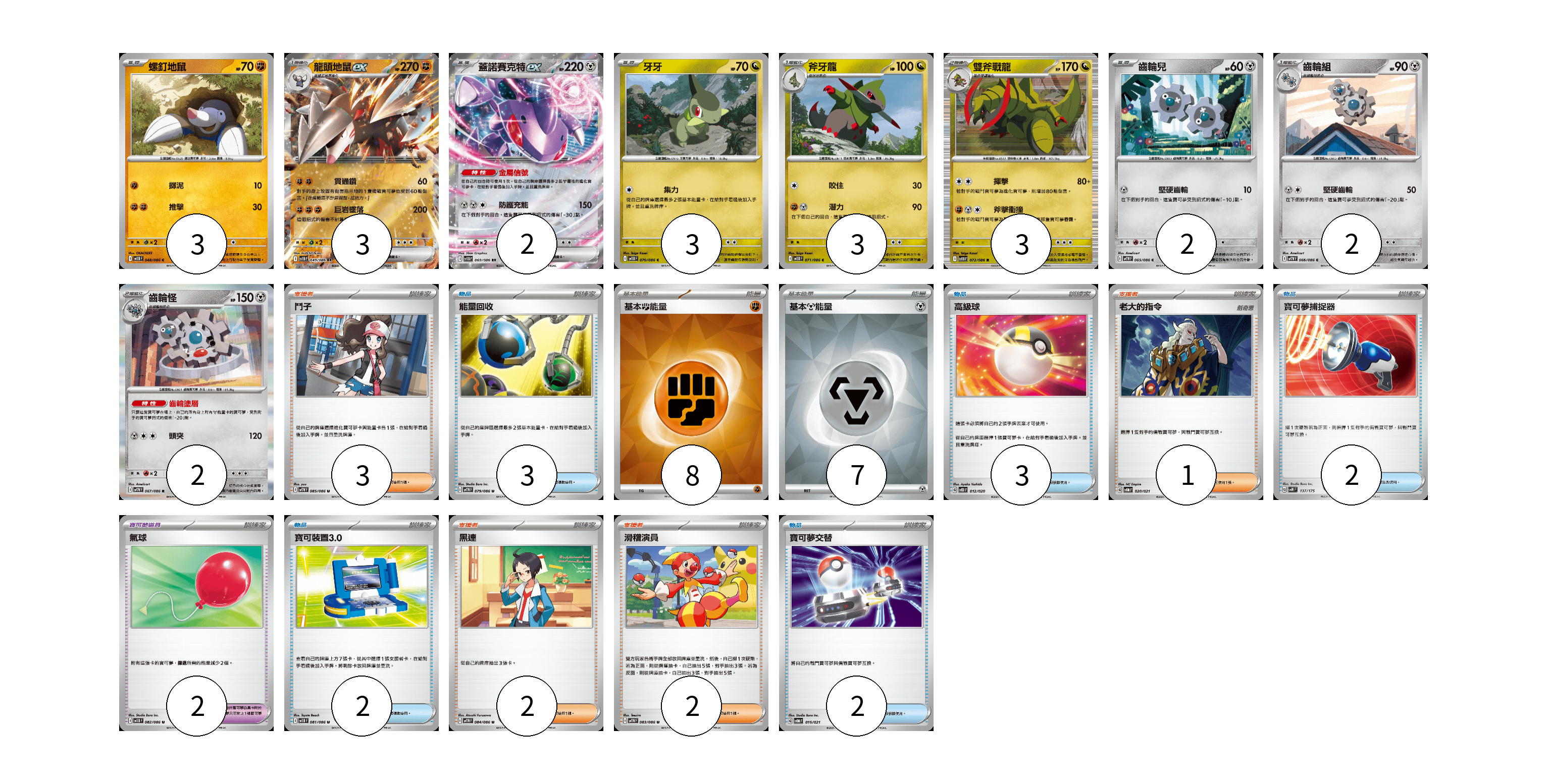 牌組構築方案 以此牌組為基礎新構築牌組 顯示卡面 顯示列表 寶可夢卡(23) 3 3 2 3 3 3 2 2 2 寶可夢道具(2) 2 物品卡(12) 3 3 2 2 2 支援者卡(8) 3 1 2 2 能量卡(15) 8 7 寶可夢卡(23) 卡牌名稱 張數 卡牌名稱 張數 螺釘地鼠 SV11B 048/086 03 龍頭地鼠ex SV11B 049/086 03 蓋諾賽克特ex SV11B 069/086 02 牙牙 SV11B 070/086 03 斧牙龍 SV11B 071/086 03 雙斧戰龍 SV11B 072/086 03 齒輪兒 SV11W 065/086 02 齒輪組 SV11W 066/086 02 齒輪怪 SV11W 067/086 02 寶可夢道具(2) 卡牌名稱 張數 卡牌名稱 張數 氣球 SV11B 082/086 02 物品卡(12) 卡牌名稱 張數 卡牌名稱 張數 能量回收 SV11W 079/086 03 高級球 SVOD 012/020 03 寶可夢捕捉器 SVM 137/175 02 寶可裝置3.0 SV11B 081/086 02 寶可夢交替 SVOM 015/021 02 支援者卡(8) 卡牌名稱 張數 卡牌名稱 張數 鬥子 SV11W 085/086 03 老大的指令 SVOM 020/021 01 黑連 SV11W 084/086 02 滑稽演員 SV11W 083/086 02 能量卡(15) 卡牌名稱 張數 卡牌名稱 張數 基本【鬥】能量 SVM FIG 08 基本【鋼】能量 SVM MET 07 以此牌組為基礎新構築牌組 牌組編碼 iwuoPX-nwzRXX-pUlxlK copy 列印牌組單 牌組編碼已複製 分享至SNS