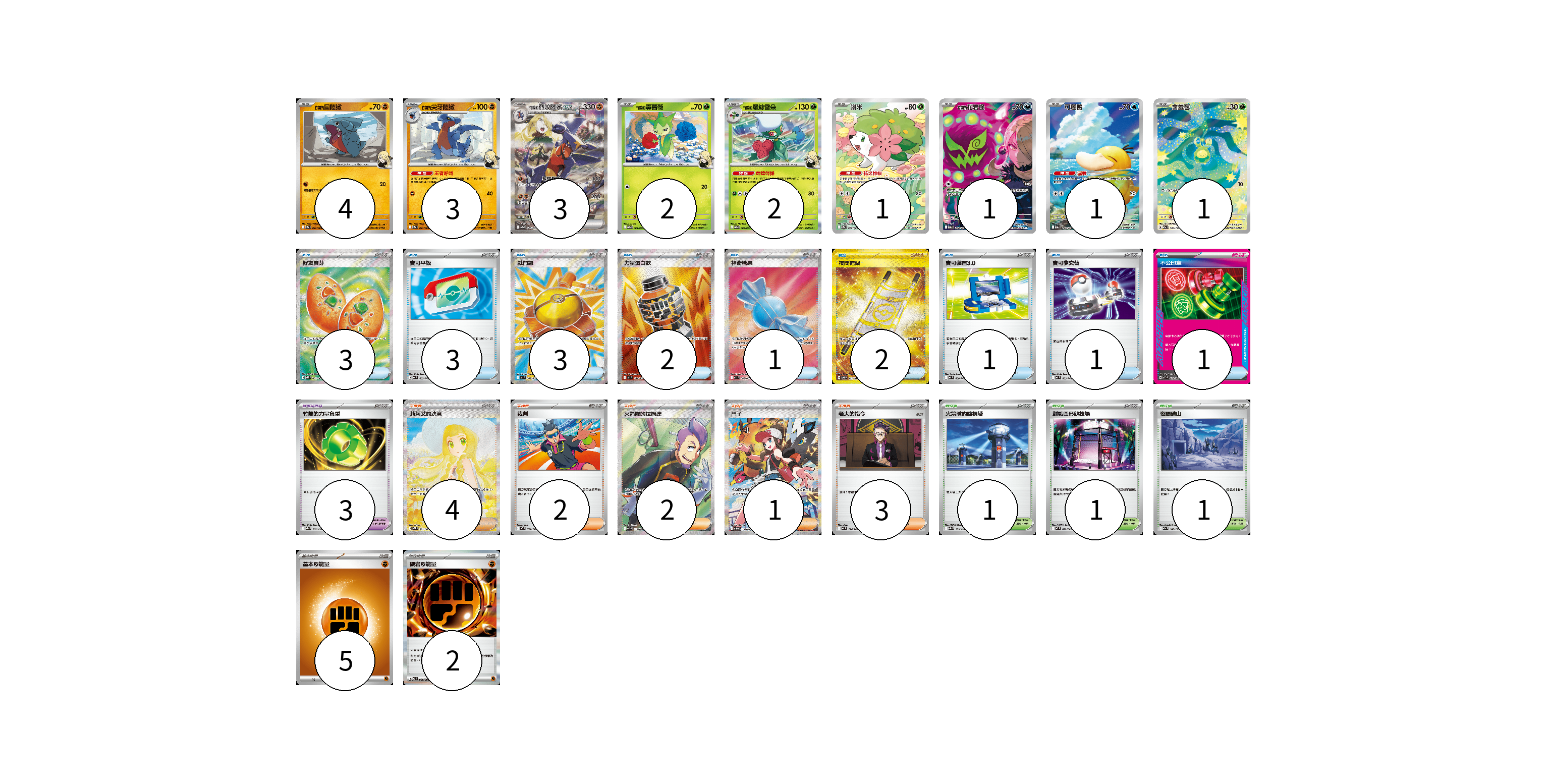 牌組構築方案 以此牌組為基礎新構築牌組 顯示卡面 顯示列表 寶可夢卡(18) 4 3 3 2 2 1 1 1 1 寶可夢道具(3) 3 物品卡(17) 3 3 3 2 1 2 1 1 1 支援者卡(12) 4 2 2 1 3 競技場卡(3) 1 1 1 能量卡(7) 5 2 寶可夢卡(18) 卡牌名稱 張數 卡牌名稱 張數 <竹蘭的>圓陸鯊 SV9a 042/063 04 <竹蘭的>尖牙陸鯊 SV9a 043/063 03 <竹蘭的>烈咬陸鯊ex SV9a 087/063 03 <竹蘭的>毒薔薇 SV9a 004/063 02 <竹蘭的>羅絲雷朵 SV9a 005/063 02 謝米 SV9a 066/063 01 <竹蘭的>花岩怪 M2a 208/193 01 可達鴨 M2a 199/193 01 含羞苞 M2a 196/193 01 寶可夢道具(3) 卡牌名稱 張數 卡牌名稱 張數 竹蘭的力量負重 M2a 162/193 03 物品卡(17) 卡牌名稱 張數 卡牌名稱 張數 好友寶芬 M1S 081/063 03 寶可平板 MC 662/742 03 戰鬥鑼 M1L 082/063 03 力量蛋白飲 M1L 081/063 02 神奇糖果 M1S 082/063 01 夜間擔架 SV8 137/106 02 寶可裝置3.0 MC 660/742 01 寶可夢交替 MC 663/742 01 不公印章 MBD 011/022 01 支援者卡(12) 卡牌名稱 張數 卡牌名稱 張數 莉莉艾的決意 M1L 091/063 04 裁判 MC 711/742 02 火箭隊的拉姆達 SV10 122/098 02 鬥子 SV11W 173/086 01 老大的指令 MC 724/742 03 競技場卡(3) 卡牌名稱 張數 卡牌名稱 張數 火箭隊的監視塔 M2a 189/193 01 對戰圓形競技場 M2 079/080 01 夜間礦山 M2a 188/193 01 能量卡(7) 卡牌名稱 張數 卡牌名稱 張數 基本【鬥】能量 MC FIG 05 硬岩【鬥】能量 M3 080/080 02 以此牌組為基礎新構築牌組 牌組編碼 ixPVkh-cCIMnW-FYxLNt copy 列印牌組單 牌組編碼已複製 分享至SNS
