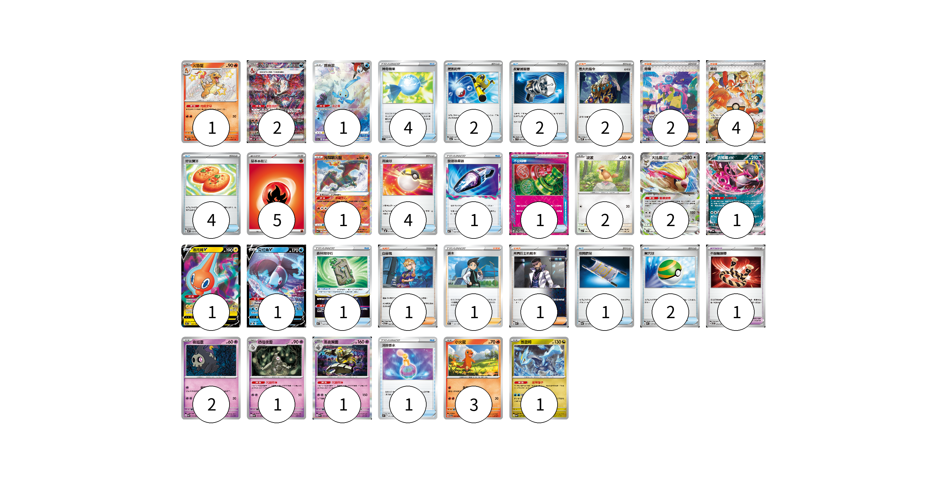 牌組構築方案 以此牌組為基礎新構築牌組 顯示卡面 顯示列表 寶可夢卡(20) 1 2 1 1 2 2 1 1 1 2 1 1 3 1 寶可夢道具(1) 1 物品卡(23) 4 2 2 4 4 1 1 1 1 2 1 支援者卡(11) 2 2 4 1 1 1 能量卡(5) 5 寶可夢卡(20) 卡牌名稱 張數 卡牌名稱 張數 火恐龍 SV4a 211/190 01 噴火龍ex SV4a 349/190 02 瑪納霏 S12a 178/172 01 光輝噴火龍 SVF 001/038 01 波波 SV3 087/108 02 大比鳥ex SV3 089/108 02 吉雉雞ex SV6a 038/064 01 洛托姆V S11 037/100 01 霓虹魚V SVHM 001/022 01 夜巡靈 SV6a 018/064 02 彷徨夜靈 SV6a 019/064 01 黑夜魔靈 SV6a 020/064 01 小火龍 SVTL 001/021 03 酋雷姆 SV6a 047/064 01 寶可夢道具(1) 卡牌名稱 張數 卡牌名稱 張數 不服輸頭帶 SVTL 016/021 01 物品卡(23) 卡牌名稱 張數 卡牌名稱 張數 神奇糖果 SI 376/414 04 厲害釣竿 SV4a 158/190 02 反擊捕捉器 SV4M 059/066 02 好友寶芬 SV5K 063/071 04 高級球 SVHK 013/022 04 放逐吸塵器 SVF 023/038 01 不公印章 SV5a 053/066 01 森林封印石 SVF 024/038 01 夜間擔架 SV6a 056/064 01 巢穴球 SVK 016/042 02 消除香水 SVF 011/038 01 支援者卡(11) 卡牌名稱 張數 卡牌名稱 張數 老大的指令 SVHK 022/022 02 奇樹 SV4a 350/190 02 派帕 SV4a 353/190 04 白蕾雅 SV7 100/102 01 捩木 S11 097/100 01 弗圖博士的劇本 SVK 034/042 01 能量卡(5) 卡牌名稱 張數 卡牌名稱 張數 基本火能量 sv-p FIR 05 以此牌組為基礎新構築牌組 牌組編碼 iyCVKH-CUWUWD-vKKaPV copy 列印牌組單 牌組編碼已複製 分享至SNS