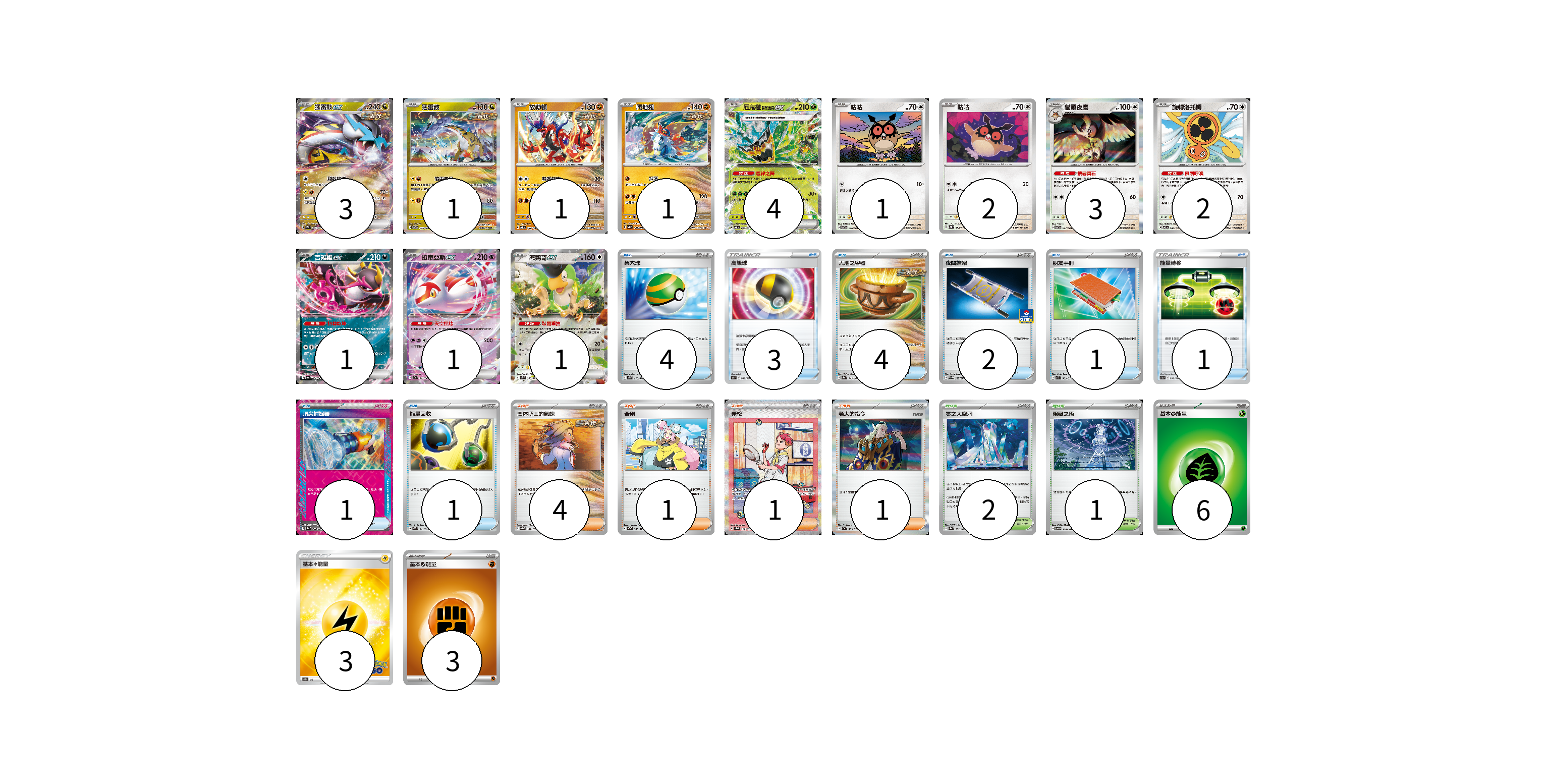 牌組構築方案 以此牌組為基礎新構築牌組 顯示卡面 顯示列表 寶可夢卡(21) 3 1 1 1 4 1 2 3 2 1 1 1 物品卡(17) 4 3 4 2 1 1 1 1 支援者卡(7) 4 1 1 1 競技場卡(3) 2 1 能量卡(12) 6 3 3 寶可夢卡(21) 卡牌名稱 張數 卡牌名稱 張數 猛雷鼓ex SV5K 053/071 03 猛雷鼓 SV7 075/102 01 故勒頓 SV8 069/106 01 爬地翅 SV4K 041/066 01 厄鬼椪 碧草面具ex SV6 016/101 04 咕咕 SV7 076/102 01 咕咕 SV5K 054/071 02 貓頭夜鷹 SV7 077/102 03 旋轉洛托姆 SV7 080/102 02 吉雉雞ex SV6a 038/064 01 拉帝亞斯ex SV7a 019/064 01 怒鸚哥ex SV2P 065/071 01 物品卡(17) 卡牌名稱 張數 卡牌名稱 張數 巢穴球 SV1S 070/078 04 高級球 S9 089/100 03 大地之容器 SV8a 143/187 04 夜間擔架 SV-P 227/SV-P 02 朋友手冊 SV1S 069/078 01 能量轉移 S11a 059/068 01 頂尖捕捉器 SV8a 148/187 01 能量回收 SVAW 011/023 01 支援者卡(7) 卡牌名稱 張數 卡牌名稱 張數 奧琳博士的氣魄 SV8a 167/187 04 奇樹 SV2D 069/071 01 赤松 SV8a 227/187 01 老大的指令 SV1a 069/073 01 競技場卡(3) 卡牌名稱 張數 卡牌名稱 張數 零之大空洞 SV8a 182/187 02 阻礙之塔 SV6 100/101 01 能量卡(12) 卡牌名稱 張數 卡牌名稱 張數 基本【草】能量 SVF GRA 06 基本雷能量 S10b LIG 03 基本【鬥】能量 SVHK FIG 03 以此牌組為基礎新構築牌組 牌組編碼 izCmXs-FAXvvp-UbhkOr copy 列印牌組單 牌組編碼已複製 分享至SNS