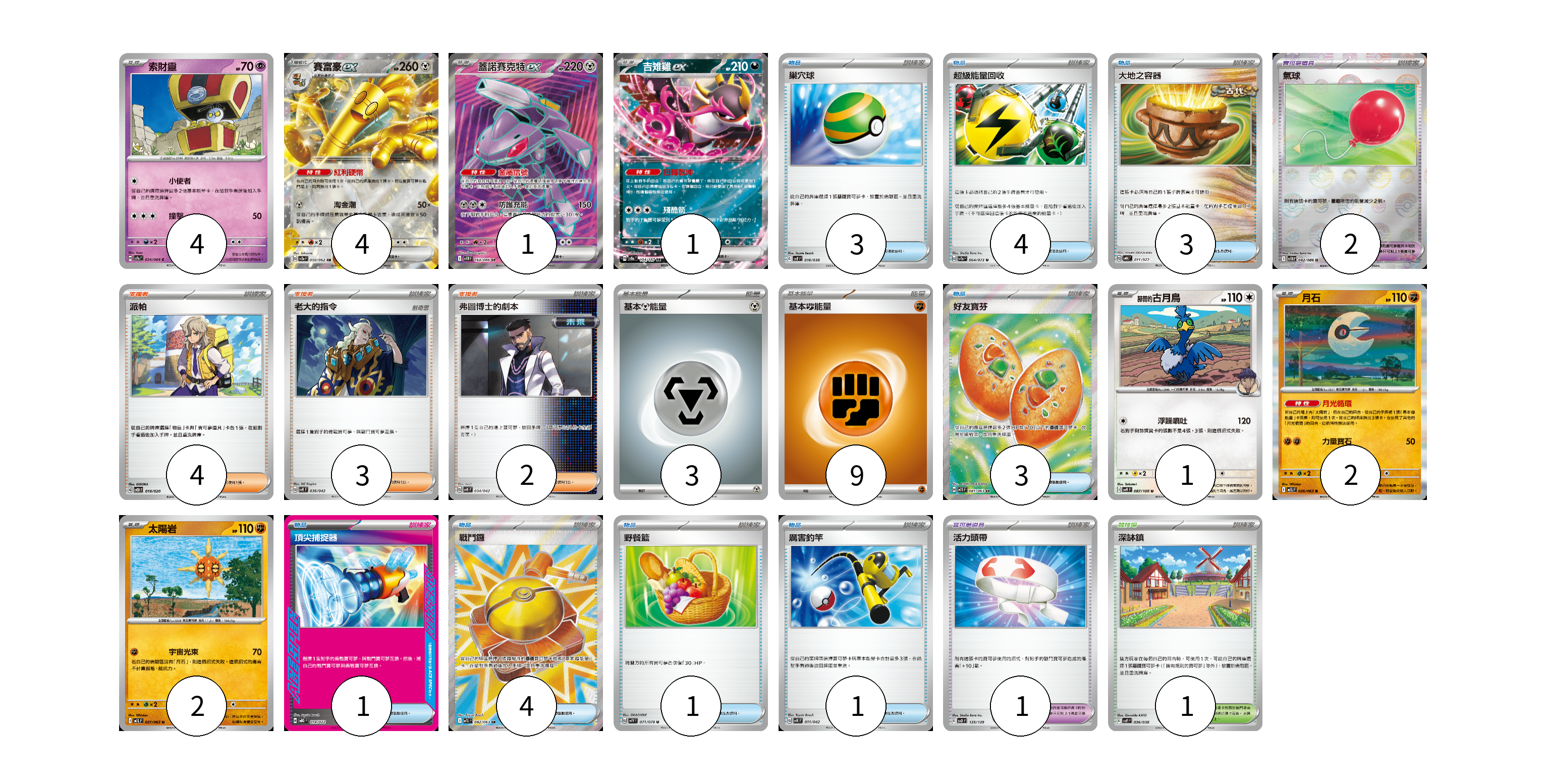牌組構築方案 以此牌組為基礎新構築牌組 顯示卡面 顯示列表 寶可夢卡(15) 4 4 1 1 1 2 2 寶可夢道具(3) 2 1 物品卡(20) 3 4 3 3 1 4 1 1 支援者卡(9) 4 3 2 競技場卡(1) 1 能量卡(12) 3 9 寶可夢卡(15) 卡牌名稱 張數 卡牌名稱 張數 索財靈 SV7a 024/064 04 賽富豪ex SV3a 050/062 04 蓋諾賽克特ex SV11B 164/086 01 吉雉雞ex SV8a 104/187 01 赫普的古月鳥 SV9 087/100 01 月石 M1L 026/063 02 太陽岩 M1L 027/063 02 寶可夢道具(3) 卡牌名稱 張數 卡牌名稱 張數 氣球 SV11B 082/086 02 活力頭帶 SVD 125/139 01 物品卡(20) 卡牌名稱 張數 卡牌名稱 張數 巢穴球 SVF 016/038 03 超級能量回收 SV1a 064/073 04 大地之容器 SVHK 011/022 03 好友寶芬 M1S 081/063 03 頂尖捕捉器 MBG 014/022 01 戰鬥鑼 M1L 082/063 04 野餐籃 SV1V 071/078 01 厲害釣竿 SVK 011/042 01 支援者卡(9) 卡牌名稱 張數 卡牌名稱 張數 派帕 SVOD 018/020 04 老大的指令 SVK 036/042 03 弗圖博士的劇本 SVK 034/042 02 競技場卡(1) 卡牌名稱 張數 卡牌名稱 張數 深缽鎮 SVF 036/038 01 能量卡(12) 卡牌名稱 張數 卡牌名稱 張數 基本【鋼】能量 SVTH MET 03 基本【鬥】能量 SVF FIG 09 以此牌組為基礎新構築牌組 牌組編碼 izIRFS-CBPzGn-vyjRUi copy 列印牌組單 牌組編碼已複製 分享至SNS