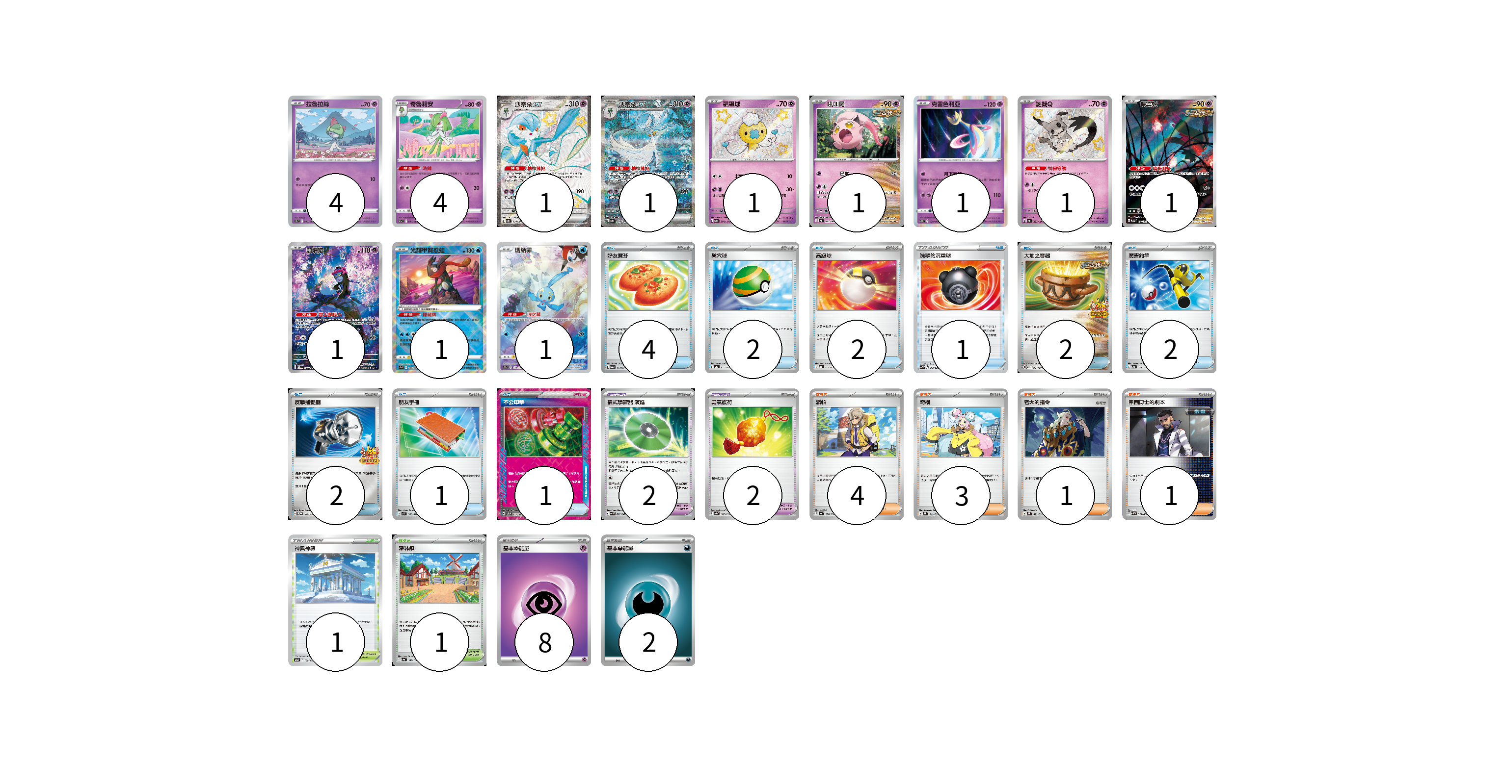 牌組構築方案 以此牌組為基礎新構築牌組 顯示卡面 顯示列表 寶可夢卡(18) 4 4 1 1 1 1 1 1 1 1 1 1 寶可夢道具(4) 2 2 物品卡(17) 4 2 2 1 2 2 2 1 1 支援者卡(9) 4 3 1 1 競技場卡(2) 1 1 能量卡(10) 8 2 寶可夢卡(18) 卡牌名稱 張數 卡牌名稱 張數 拉魯拉絲 S9a 032/067 04 奇魯莉安 S11a 037/068 04 沙奈朵ex SV4a 328/190 01 沙奈朵ex SV4a 348/190 01 飄飄球 SV4a 260/190 01 吼叫尾 SV4K 032/066 01 克雷色利亞 S10D 028/067 01 謎擬Q SV4a 265/190 01 振翼髮 SV5K 076/071 01 願增猿 SV6 107/101 01 光輝甲賀忍蛙 S9a 026/067 01 瑪納霏 S12a 178/172 01 寶可夢道具(4) 卡牌名稱 張數 卡牌名稱 張數 招式學習器 演進 SV4M 063/066 02 勇氣護符 SV4a 169/190 02 物品卡(17) 卡牌名稱 張數 卡牌名稱 張數 好友寶芬 SV5K 063/071 04 巢穴球 SVHK 012/022 02 高級球 SVHK 013/022 02 洗翠的沉重球 SVF 019/038 01 大地之容器 SV-P 084/SV-P 02 厲害釣竿 SV4a 158/190 02 反擊捕捉器 SV-P 083/SV-P 02 朋友手冊 SV1S 069/078 01 不公印章 SV5a 053/066 01 支援者卡(9) 卡牌名稱 張數 卡牌名稱 張數 派帕 SV4a 180/190 04 奇樹 SVHK 019/022 03 老大的指令 SVHK 022/022 01 弗圖博士的劇本 SVHM 021/022 01 競技場卡(2) 卡牌名稱 張數 卡牌名稱 張數 神奧神殿 S12a 169/172 01 深缽鎮 SV4a 185/190 01 能量卡(10) 卡牌名稱 張數 卡牌名稱 張數 基本【超】能量 SVHM PSY 08 基本【惡】能量 SVF DAR 02 以此牌組為基礎新構築牌組 牌組編碼 izVLkJ-OGQOci-DitliU copy 列印牌組單 牌組編碼已複製 分享至SNS