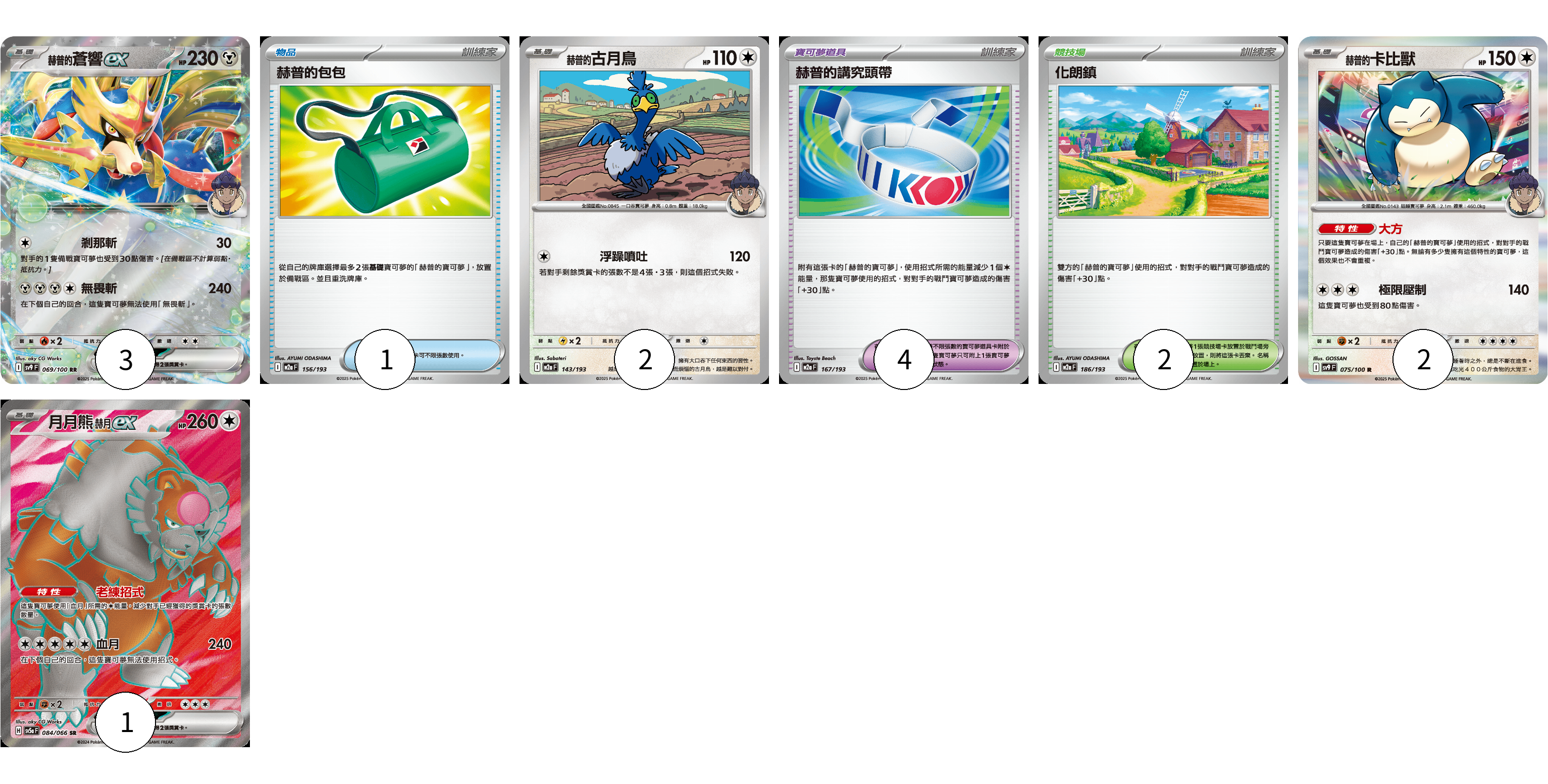 牌組構築方案 以此牌組為基礎新構築牌組 顯示卡面 顯示列表 寶可夢卡(8) 3 2 2 1 寶可夢道具(4) 4 物品卡(1) 1 競技場卡(2) 2 寶可夢卡(8) 卡牌名稱 張數 卡牌名稱 張數 赫普的蒼響ex SV9 069/100 03 赫普的古月鳥 M2a 143/193 02 赫普的卡比獸 SV9 075/100 02 月月熊 赫月 ex SV5a 084/066 01 寶可夢道具(4) 卡牌名稱 張數 卡牌名稱 張數 赫普的講究頭帶 M2a 167/193 04 物品卡(1) 卡牌名稱 張數 卡牌名稱 張數 赫普的包包 M2a 156/193 01 競技場卡(2) 卡牌名稱 張數 卡牌名稱 張數 化朗鎮 M2a 186/193 02 以此牌組為基礎新構築牌組 牌組編碼 jBeCUG-AeENFY-EQVwkX copy 列印牌組單 牌組編碼已複製 分享至SNS
