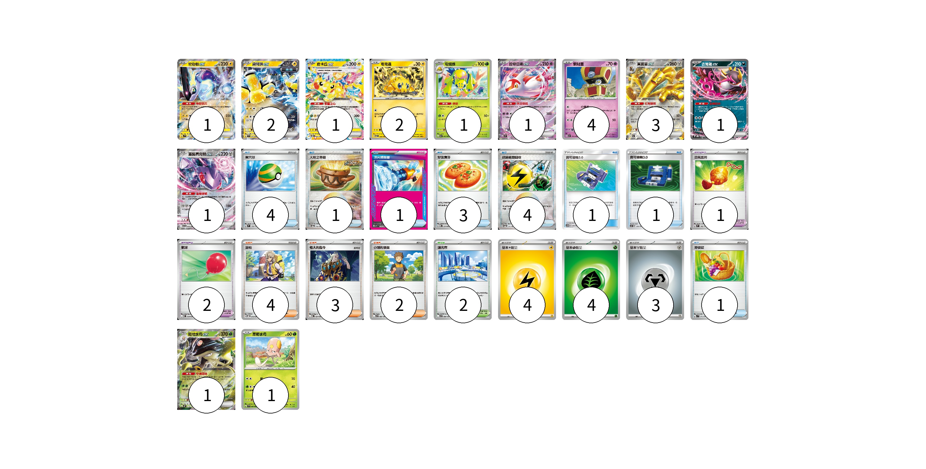 牌組構築方案 以此牌組為基礎新構築牌組 顯示卡面 顯示列表 寶可夢卡(19) 1 2 1 2 1 1 4 3 1 1 1 1 寶可夢道具(3) 1 2 物品卡(16) 4 1 1 3 4 1 1 1 支援者卡(9) 4 3 2 競技場卡(2) 2 能量卡(11) 4 4 3 寶可夢卡(19) 卡牌名稱 張數 卡牌名稱 張數 密勒頓ex SV1V 037/078 01 鐵臂膀ex SV4M 027/066 02 皮卡丘ex SV8 033/106 01 電電蟲 SV7 032/102 02 電蜘蛛 SV6a 002/064 01 拉帝亞斯ex SV7a 019/064 01 索財靈 SV7a 024/064 04 賽富豪ex SV8a 117/187 03 吉雉雞ex SVOD 004/020 01 蓋諾賽克特ex SV11B 069/086 01 陸地水母ex SV4a 019/190 01 原野水母 SV4M 007/066 01 寶可夢道具(3) 卡牌名稱 張數 卡牌名稱 張數 勇氣護符 SVM 142/175 01 氣球 MBD 018/022 02 物品卡(16) 卡牌名稱 張數 卡牌名稱 張數 巢穴球 SVM 133/175 04 大地之容器 SV8a 143/187 01 頂尖捕捉器 MBG 014/022 01 好友寶芬 MBG 011/022 03 超級能量回收 SV8a 141/187 04 寶可齒輪3.0 AS5D 149/169 01 寶可齒輪3.0 SCB 126/156 01 野餐籃 SV1V 071/078 01 支援者卡(9) 卡牌名稱 張數 卡牌名稱 張數 派帕 SVOD 018/020 04 老大的指令 MBG 021/022 03 小剛的發掘 SV9 096/100 02 競技場卡(2) 卡牌名稱 張數 卡牌名稱 張數 釀光市 SV9 098/100 02 能量卡(11) 卡牌名稱 張數 卡牌名稱 張數 基本雷能量 sv-p LIG 04 基本草能量 sv-p GRA 04 基本鋼能量 sv-p MET 03 以此牌組為基礎新構築牌組 牌組編碼 jDAJUD-uNkNTp-pCelFP copy 列印牌組單 牌組編碼已複製 分享至SNS