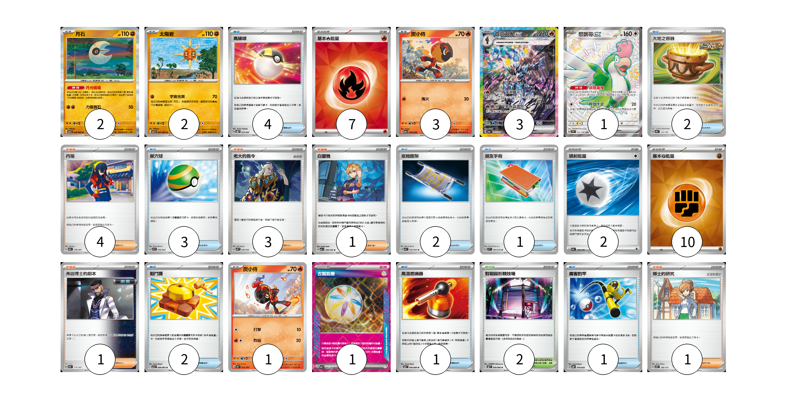 牌組構築方案 以此牌組為基礎新構築牌組 顯示卡面 顯示列表 寶可夢卡(12) 2 2 3 3 1 1 物品卡(16) 4 2 3 2 1 2 1 1 支援者卡(10) 4 3 1 1 1 競技場卡(2) 2 能量卡(20) 7 2 10 1 寶可夢卡(12) 卡牌名稱 張數 卡牌名稱 張數 月石 M1L 026/063 02 太陽岩 M1L 027/063 02 炭小侍 SVPS 005/008 03 蒼炎刃鬼ex SV8a 203/187 03 怒鸚哥ex SV4a 337/190 01 炭小侍 SV8a 023/187 01 物品卡(16) 卡牌名稱 張數 卡牌名稱 張數 高級球 SVQL 015/022 04 大地之容器 SV8a 143/187 02 巢穴球 SVK 016/042 03 夜間擔架 SV6a 056/064 02 朋友手冊 SV1S 069/078 01 戰鬥鑼 M1L 059/063 02 高溫燃燒器 M2 074/080 01 厲害釣竿 SVOD 010/020 01 支援者卡(10) 卡牌名稱 張數 卡牌名稱 張數 丹瑜 SV8a 170/187 04 老大的指令 SVK 036/042 03 白蕾雅 SV7 100/102 01 弗圖博士的劇本 SV8a 175/187 01 博士的研究 SVM 166/175 01 競技場卡(2) 卡牌名稱 張數 卡牌名稱 張數 對戰圓形競技場 M2 079/080 02 能量卡(20) 卡牌名稱 張數 卡牌名稱 張數 基本【火】能量 SVQL FIR 07 噴射能量 SV8a 185/187 02 基本【鬥】能量 SVM FIG 10 古舊能量 SV6 101/101 01 以此牌組為基礎新構築牌組 牌組編碼 jDXrWe-kLVBbR-wzIBYT copy 列印牌組單 牌組編碼已複製 分享至SNS