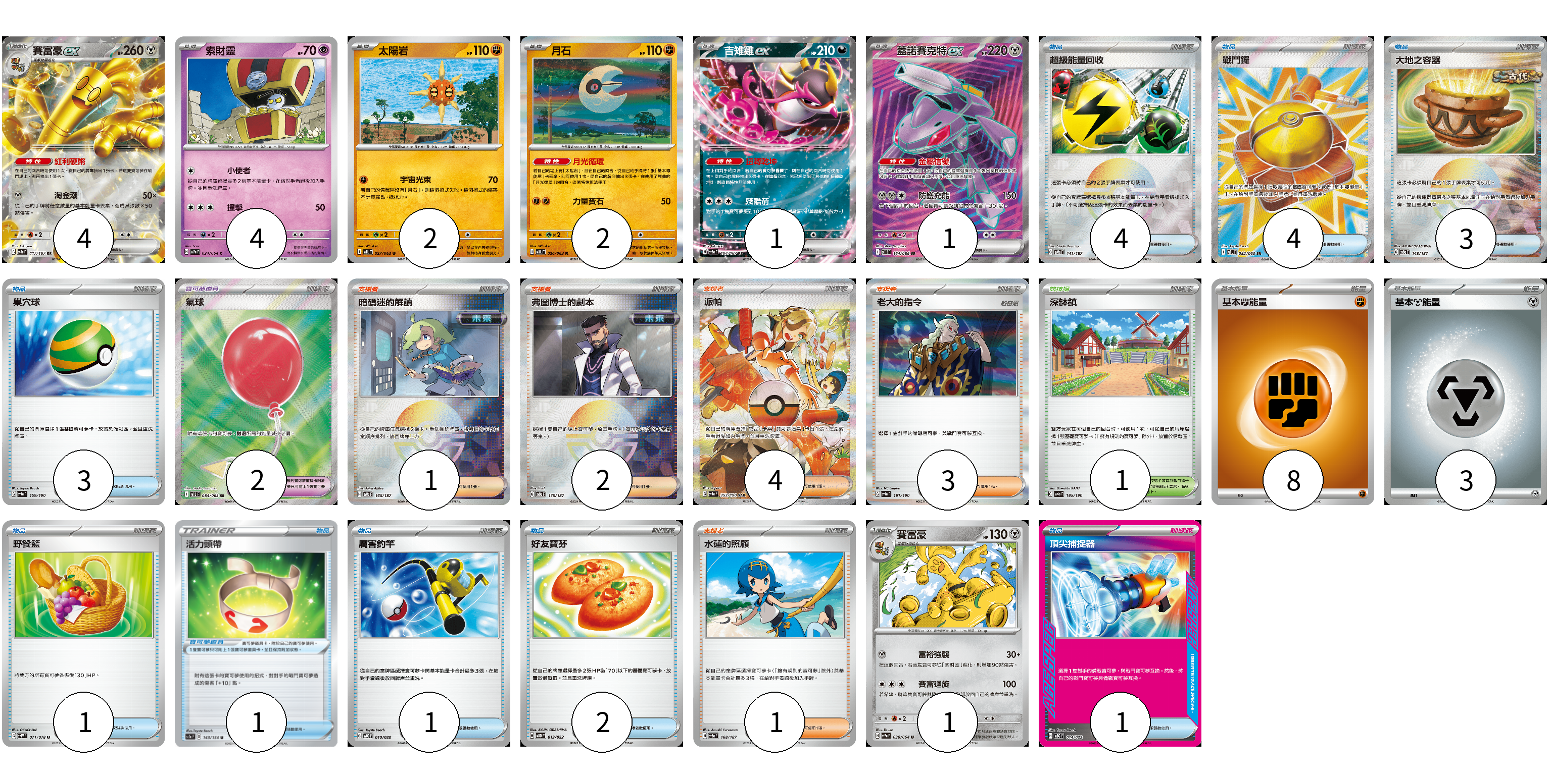 牌組構築方案 以此牌組為基礎新構築牌組 顯示卡面 顯示列表 寶可夢卡(15) 4 4 2 2 1 1 1 寶可夢道具(3) 2 1 物品卡(19) 4 4 3 3 1 1 2 1 支援者卡(11) 1 2 4 3 1 競技場卡(1) 1 能量卡(11) 8 3 寶可夢卡(15) 卡牌名稱 張數 卡牌名稱 張數 賽富豪ex SV8a 117/187 04 索財靈 SV7a 024/064 04 太陽岩 M1L 027/063 02 月石 M1L 026/063 02 吉雉雞ex SV8a 104/187 01 蓋諾賽克特ex SV11B 164/086 01 賽富豪 SV7a 038/064 01 寶可夢道具(3) 卡牌名稱 張數 卡牌名稱 張數 氣球 M1L 084/063 02 活力頭帶 SC1a 143/154 01 物品卡(19) 卡牌名稱 張數 卡牌名稱 張數 超級能量回收 SV8a 141/187 04 戰鬥鑼 M1L 082/063 04 大地之容器 SV8a 143/187 03 巢穴球 SV4a 159/190 03 野餐籃 SV1V 071/078 01 厲害釣竿 SVOD 010/020 01 好友寶芬 MBD 013/022 02 頂尖捕捉器 MBG 014/022 01 支援者卡(11) 卡牌名稱 張數 卡牌名稱 張數 暗碼迷的解讀 SV8a 165/187 01 弗圖博士的劇本 SV8a 175/187 02 派帕 SV4a 353/190 04 老大的指令 SV4a 181/190 03 水蓮的照顧 SV8a 168/187 01 競技場卡(1) 卡牌名稱 張數 卡牌名稱 張數 深缽鎮 SV4a 185/190 01 能量卡(11) 卡牌名稱 張數 卡牌名稱 張數 基本【鬥】能量 SVAM FIG 08 基本【鋼】能量 M-P MET 03 以此牌組為基礎新構築牌組 牌組編碼 jFrPXP-BDpXRA-IovxkC copy 列印牌組單 牌組編碼已複製 分享至SNS