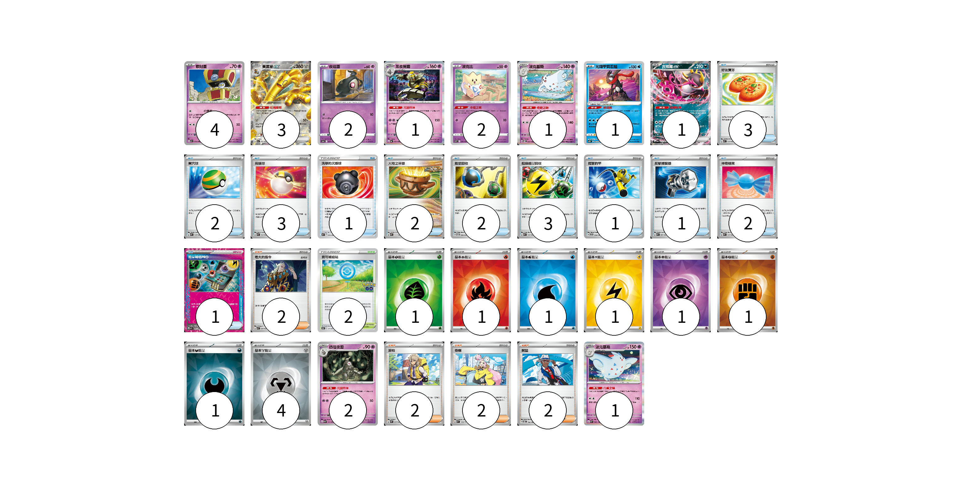 牌組構築方案 以此牌組為基礎新構築牌組 顯示卡面 顯示列表 寶可夢卡(18) 4 3 2 1 2 1 1 1 2 1 物品卡(21) 3 2 3 1 2 2 3 1 1 2 1 支援者卡(8) 2 2 2 2 競技場卡(2) 2 能量卡(11) 1 1 1 1 1 1 1 4 寶可夢卡(18) 卡牌名稱 張數 卡牌名稱 張數 索財靈 SV7a 024/064 04 賽富豪ex SV3a 050/062 03 夜巡靈 S12a 057/172 02 黑夜魔靈 SV6a 020/064 01 波克比 S10P 026/067 02 波克基斯 SV8 047/106 01 光輝甲賀忍蛙 SVTG 002/019 01 吉雉雞ex SV6a 038/064 01 彷徨夜靈 SV6a 019/064 02 波克基斯 SV3 045/108 01 物品卡(21) 卡牌名稱 張數 卡牌名稱 張數 好友寶芬 SVK 015/042 03 巢穴球 SVK 016/042 02 高級球 SVK 018/042 03 洗翠的沉重球 SVF 019/038 01 大地之容器 SVK 012/042 02 能量回收 SVTM 009/022 02 超級能量回收 SVK 010/042 03 厲害釣竿 SVTH 008/018 01 反擊捕捉器 SVK 009/042 01 神奇糖果 SVK 019/042 02 能量輸送PRO SV7a 052/064 01 支援者卡(8) 卡牌名稱 張數 卡牌名稱 張數 老大的指令 SVK 036/042 02 派帕 SVK 035/042 02 奇樹 SVM 160/175 02 席藍 SV8 102/106 02 競技場卡(2) 卡牌名稱 張數 卡牌名稱 張數 寶可補給站 S10b 071/071 02 能量卡(11) 卡牌名稱 張數 卡牌名稱 張數 基本【草】能量 SVK GRA 01 基本【火】能量 SVK FIR 01 基本【水】能量 SVK WAT 01 基本【雷】能量 SVK LIG 01 基本【超】能量 SVK PSY 01 基本【鬥】能量 SVK FIG 01 基本【惡】能量 SVK DAR 01 基本【鋼】能量 SVK MET 04 以此牌組為基礎新構築牌組 牌組編碼 jGwIuP-VmDwHe-Lxbzit copy 列印牌組單 牌組編碼已複製 分享至SNS
