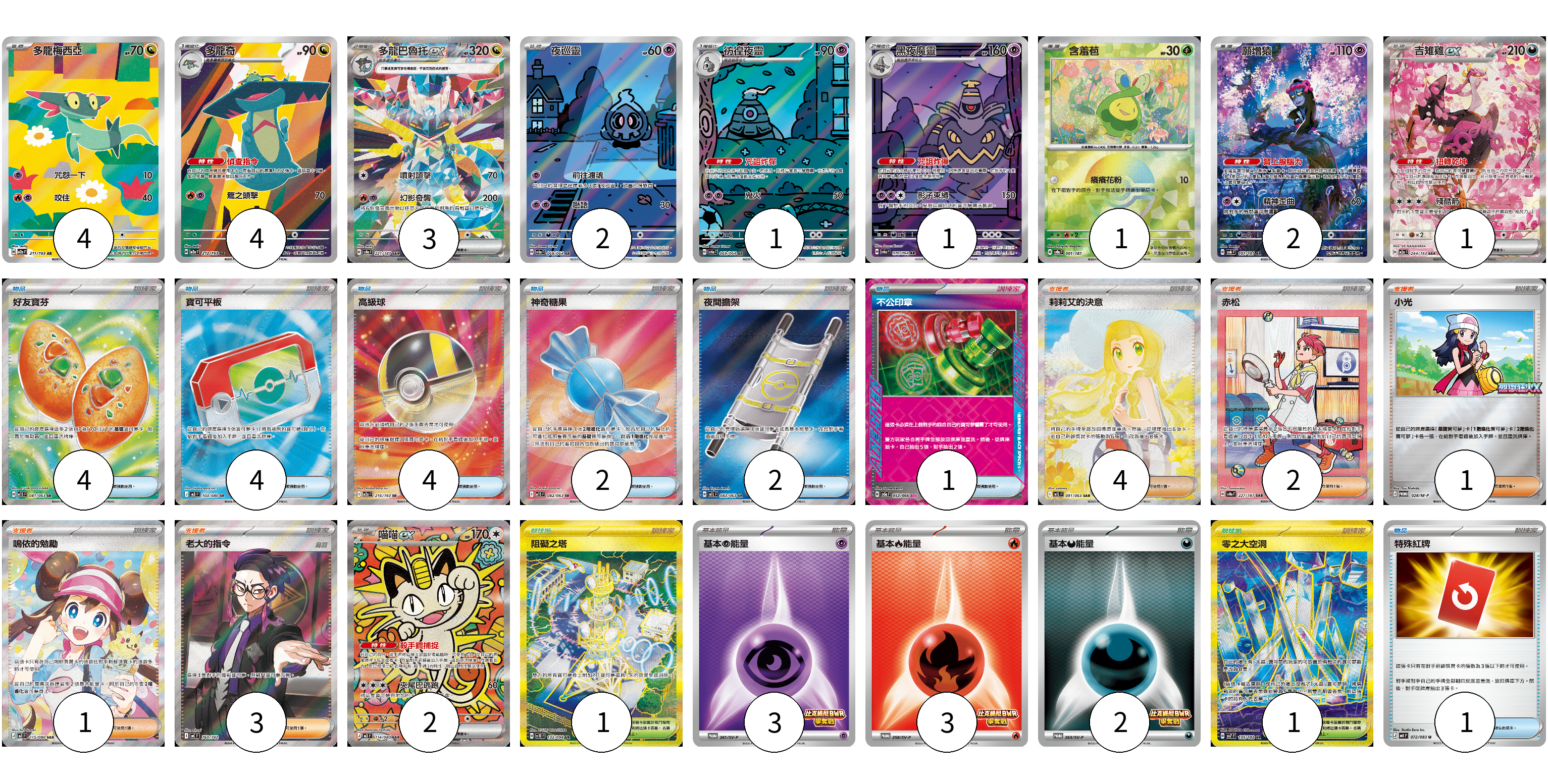 牌組構築方案 以此牌組為基礎新構築牌組 顯示卡面 顯示列表 寶可夢卡(21) 4 4 3 2 1 1 1 2 1 2 物品卡(18) 4 4 4 2 2 1 1 支援者卡(11) 4 2 1 1 3 競技場卡(2) 1 1 能量卡(8) 3 3 2 寶可夢卡(21) 卡牌名稱 張數 卡牌名稱 張數 多龍梅西亞 M2a 211/193 04 多龍奇 M2a 212/193 04 多龍巴魯托ex SV8a 221/187 03 夜巡靈 SV6a 068/064 02 彷徨夜靈 SV6a 069/064 01 黑夜魔靈 SV6a 070/064 01 含羞苞 SV8a 001/187 01 願增猿 SV6 107/101 02 吉雉雞ex M2a 244/193 01 喵喵ex M3 114/080 02 物品卡(18) 卡牌名稱 張數 卡牌名稱 張數 好友寶芬 M1S 081/063 04 寶可平板 M3 103/080 04 高級球 M2a 216/193 04 神奇糖果 M1S 082/063 02 夜間擔架 M1L 083/063 02 不公印章 SV5a 053/066 01 特殊紅牌 M4 072/083 01 支援者卡(11) 卡牌名稱 張數 卡牌名稱 張數 莉莉艾的決意 M1L 091/063 04 赤松 SV8a 227/187 02 小光 M-P 028/M-P 01 鳴依的勉勵 M3 115/080 01 老大的指令(烏羽) MC 760/742 03 競技場卡(2) 卡牌名稱 張數 卡牌名稱 張數 阻礙之塔 SV10 132/098 01 零之大空洞 SV7 135/102 01 能量卡(8) 卡牌名稱 張數 卡牌名稱 張數 基本【超】能量 SV-P 261/SV-P 03 基本【火】能量 SV-P 258/SV-P 03 基本【惡】能量 SV-P 263/SV-P 02 以此牌組為基礎新構築牌組 牌組編碼 jJVuEW-STcMIE-bJouAw copy 列印牌組單 牌組編碼已複製 分享至SNS