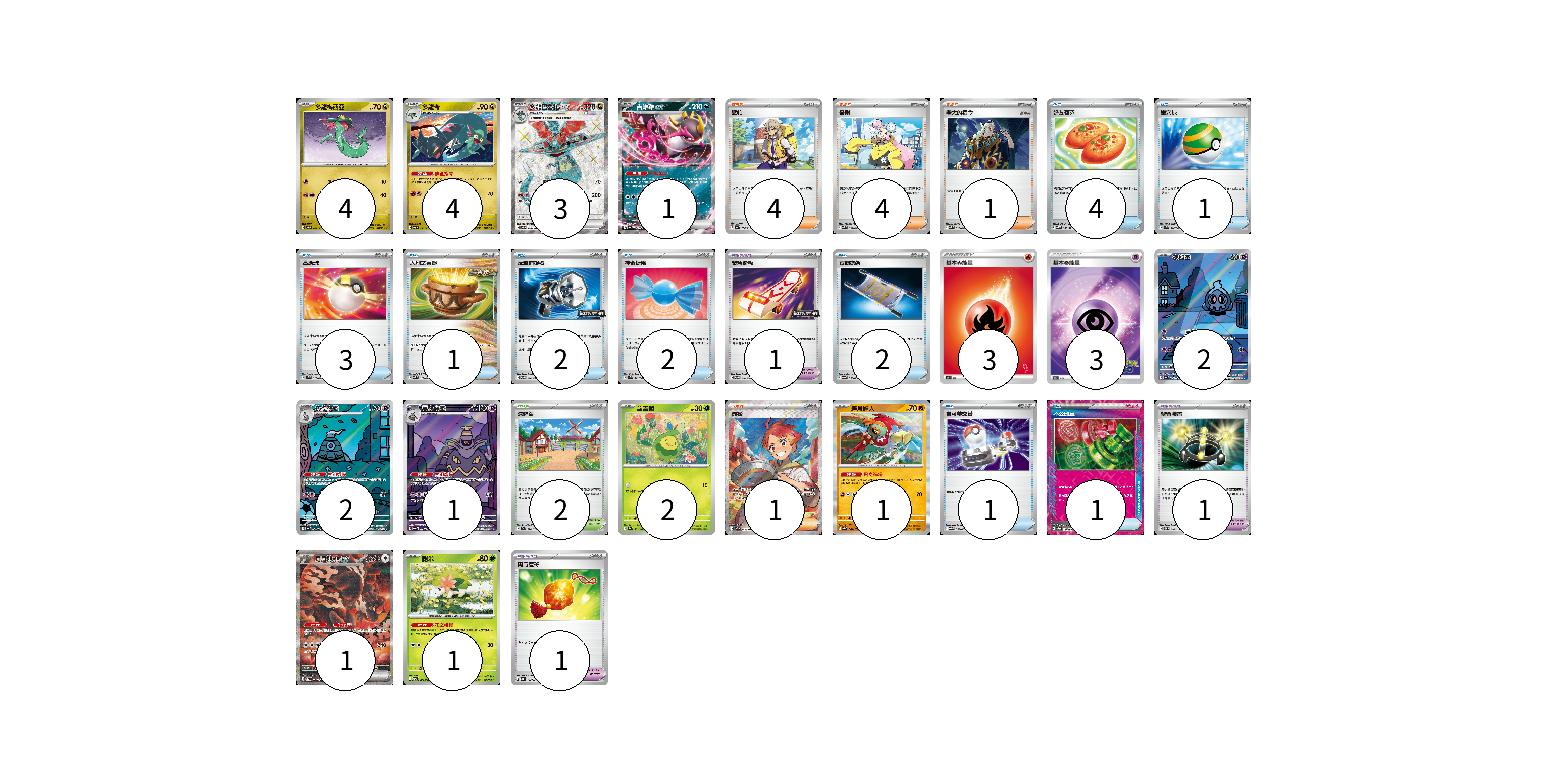 牌組構築方案 以此牌組為基礎新構築牌組 顯示卡面 顯示列表 寶可夢卡(22) 4 4 3 1 2 2 1 2 1 1 1 寶可夢道具(3) 1 1 1 物品卡(17) 4 1 3 1 2 2 2 1 1 支援者卡(10) 4 4 1 1 競技場卡(2) 2 能量卡(6) 3 3 寶可夢卡(22) 卡牌名稱 張數 卡牌名稱 張數 多龍梅西亞 SV6 079/101 04 多龍奇 SV6 080/101 04 多龍巴魯托ex SV6 120/101 03 吉雉雞ex SV6a 038/064 01 夜巡靈 SV6a 068/064 02 彷徨夜靈 SV6a 069/064 02 黑夜魔靈 SV6a 070/064 01 含羞苞 SV8a 001/187 02 摔角鷹人 SV8a 084/187 01 月月熊 赫月ex SV8a 225/187 01 謝米 SV9a 006/063 01 寶可夢道具(3) 卡牌名稱 張數 卡牌名稱 張數 緊急滑板 SV-P 140/SV-P 01 學習裝置 SVTM 016/022 01 勇氣護符 SV2D 067/071 01 物品卡(17) 卡牌名稱 張數 卡牌名稱 張數 好友寶芬 SV5K 063/071 04 巢穴球 SVK 016/042 01 高級球 SVK 018/042 03 大地之容器 SVK 012/042 01 反擊捕捉器 SV-P 136/SV-P 02 神奇糖果 SVK 019/042 02 夜間擔架 SV6a 056/064 02 寶可夢交替 SV9a 058/063 01 不公印章 SV5a 053/066 01 支援者卡(10) 卡牌名稱 張數 卡牌名稱 張數 派帕 SV4a 180/190 04 奇樹 SVK 031/042 04 老大的指令 SVK 036/042 01 赤松 SV7 123/102 01 競技場卡(2) 卡牌名稱 張數 卡牌名稱 張數 深缽鎮 SV1a 070/073 02 能量卡(6) 卡牌名稱 張數 卡牌名稱 張數 基本火能量 SH FIR 03 基本超能量 S10b PSY 03 以此牌組為基礎新構築牌組 牌組編碼 jJatya-NTRgbY-wKCcxR copy 列印牌組單 牌組編碼已複製 分享至SNS
