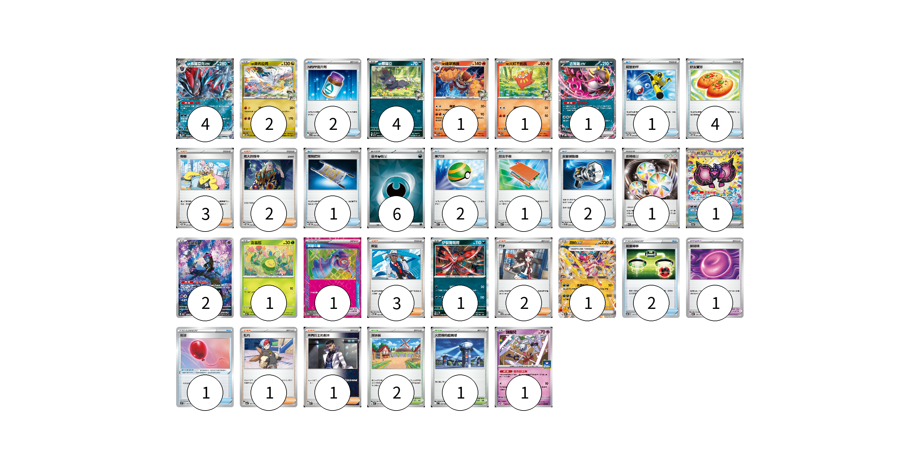 牌組構築方案 以此牌組為基礎新構築牌組 顯示卡面 顯示列表 寶可夢卡(20) 4 2 4 1 1 1 1 2 1 1 1 1 寶可夢道具(3) 1 1 1 物品卡(15) 2 1 4 1 2 1 2 2 支援者卡(12) 3 2 3 2 1 1 競技場卡(3) 2 1 能量卡(7) 6 1 寶可夢卡(20) 卡牌名稱 張數 卡牌名稱 張數 N的索羅亞克ex SV9 061/100 04 N的萊希拉姆 SV9 074/100 02 N的索羅亞 SV9 060/100 04 N的達摩狒狒 SV9 016/100 01 N的火紅不倒翁 SV9 015/100 01 吉雉雞ex SVOD 004/020 01 桃歹郎ex SV8a 219/187 01 願增猿 SV6 107/101 02 含羞苞 SV8a 001/187 01 伊裴爾塔爾 M1L 040/063 01 胡帕ex SV3a 029/062 01 鑰圈兒 SV-P 089/SV-P 01 寶可夢道具(3) 卡牌名稱 張數 卡牌名稱 張數 英雄斗篷 SV5M 064/071 01 鎖鏈糬 SV8a 154/187 01 氣球 SC1b 142/153 01 物品卡(15) 卡牌名稱 張數 卡牌名稱 張數 N的PP提升劑 SV9 089/100 02 厲害釣竿 SVOD 010/020 01 好友寶芬 SVOD 011/020 04 夜間擔架 SVOM 016/021 01 巢穴球 SVM 133/175 02 朋友手冊 SVK 014/042 01 反擊捕捉器 SVTS 009/022 02 能量轉移 SC2D 134/157 02 支援者卡(12) 卡牌名稱 張數 卡牌名稱 張數 奇樹 SVOD 016/020 03 老大的指令 SVOD 019/020 02 席藍 SV8 102/106 03 鬥子 SV11W 085/086 02 牡丹 SV4a 182/190 01 弗圖博士的劇本 SVK 034/042 01 競技場卡(3) 卡牌名稱 張數 卡牌名稱 張數 深缽鎮 SVK 039/042 02 火箭隊的監視塔 SV10 096/098 01 能量卡(7) 卡牌名稱 張數 卡牌名稱 張數 基本【惡】能量 SVOM DAR 06 反轉能量 SVK 041/042 01 以此牌組為基礎新構築牌組 牌組編碼 jKUSOq-kyTDUv-pwieHy copy 列印牌組單 牌組編碼已複製 分享至SNS